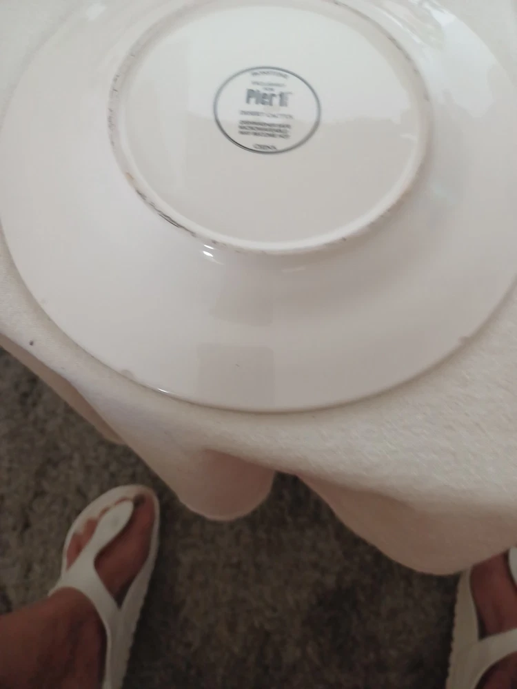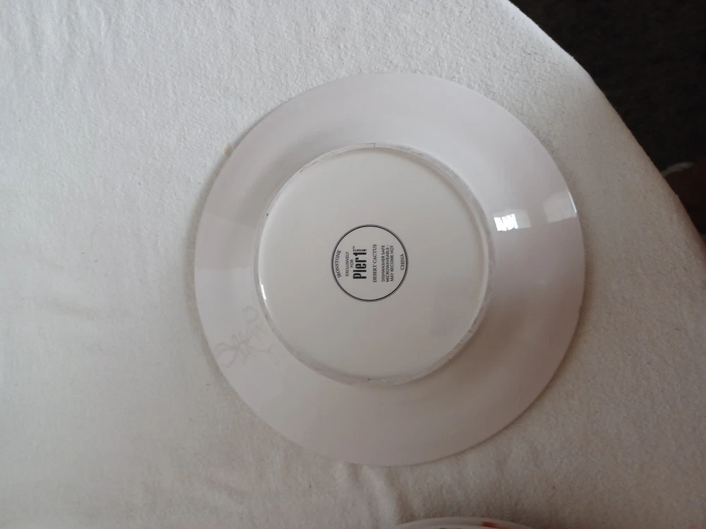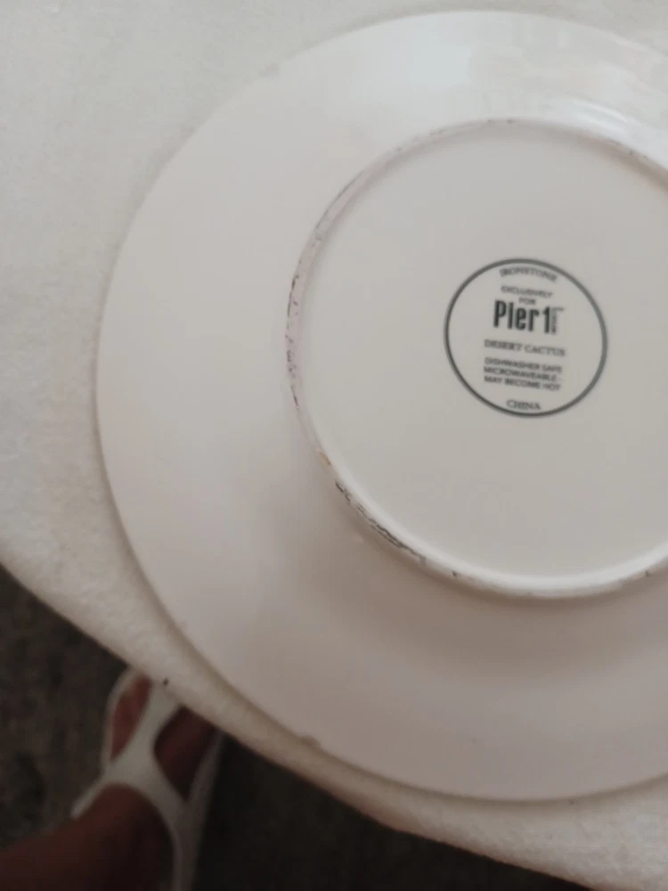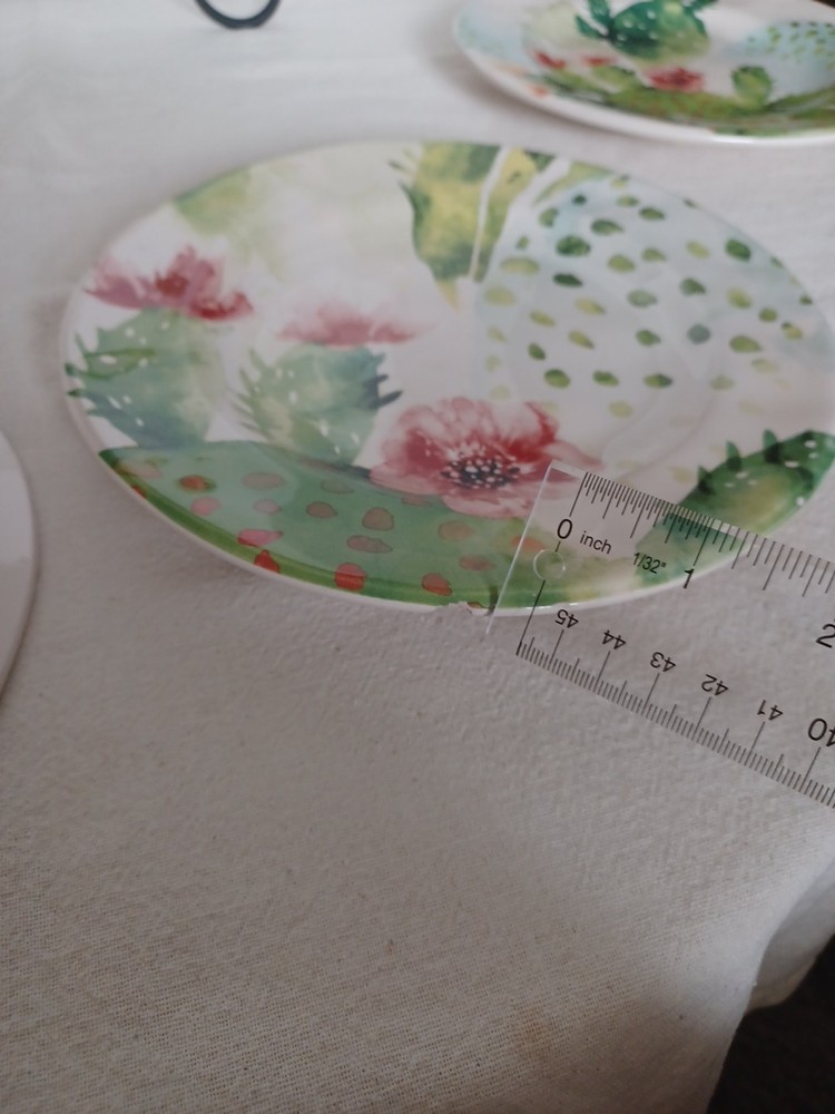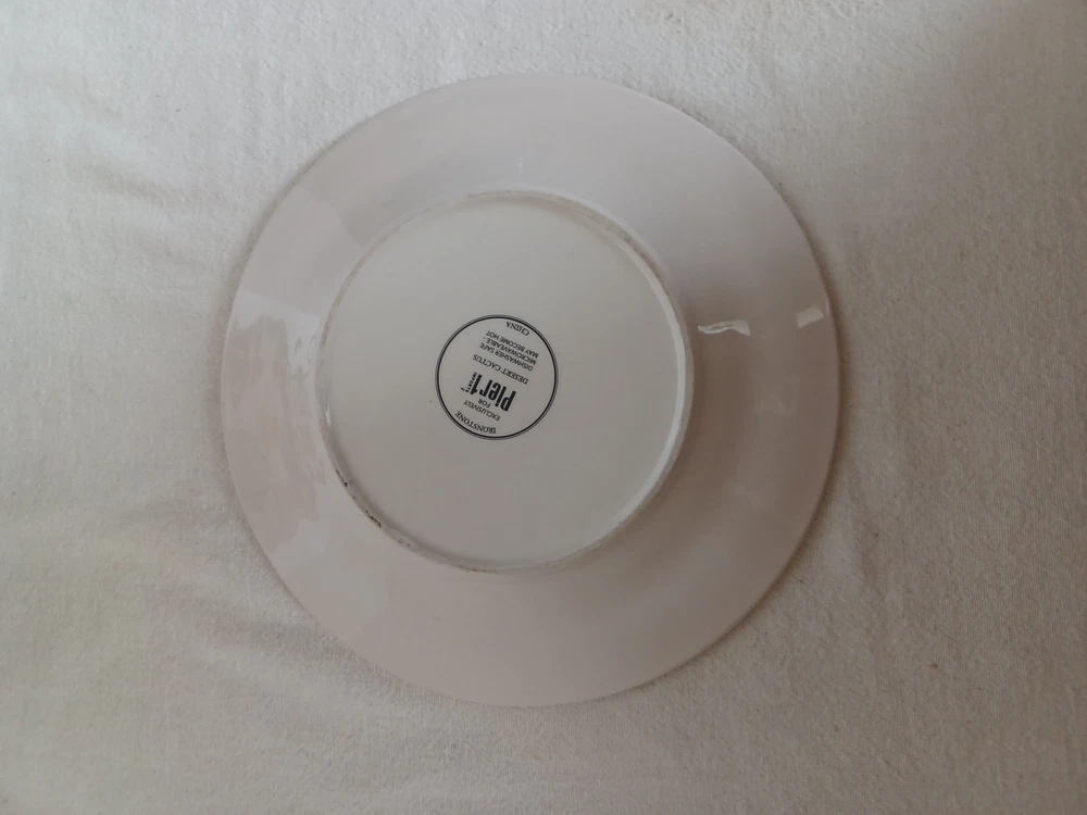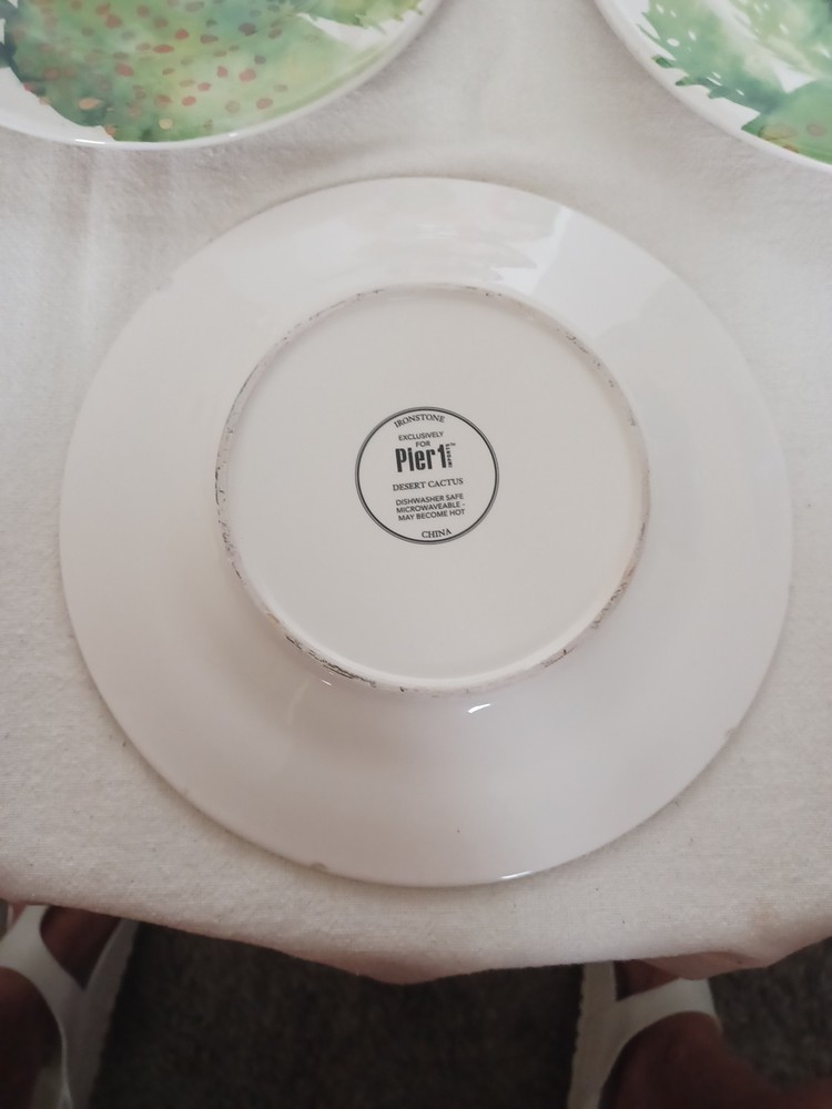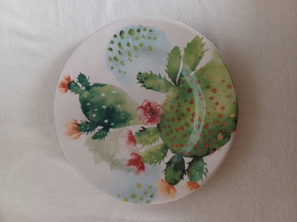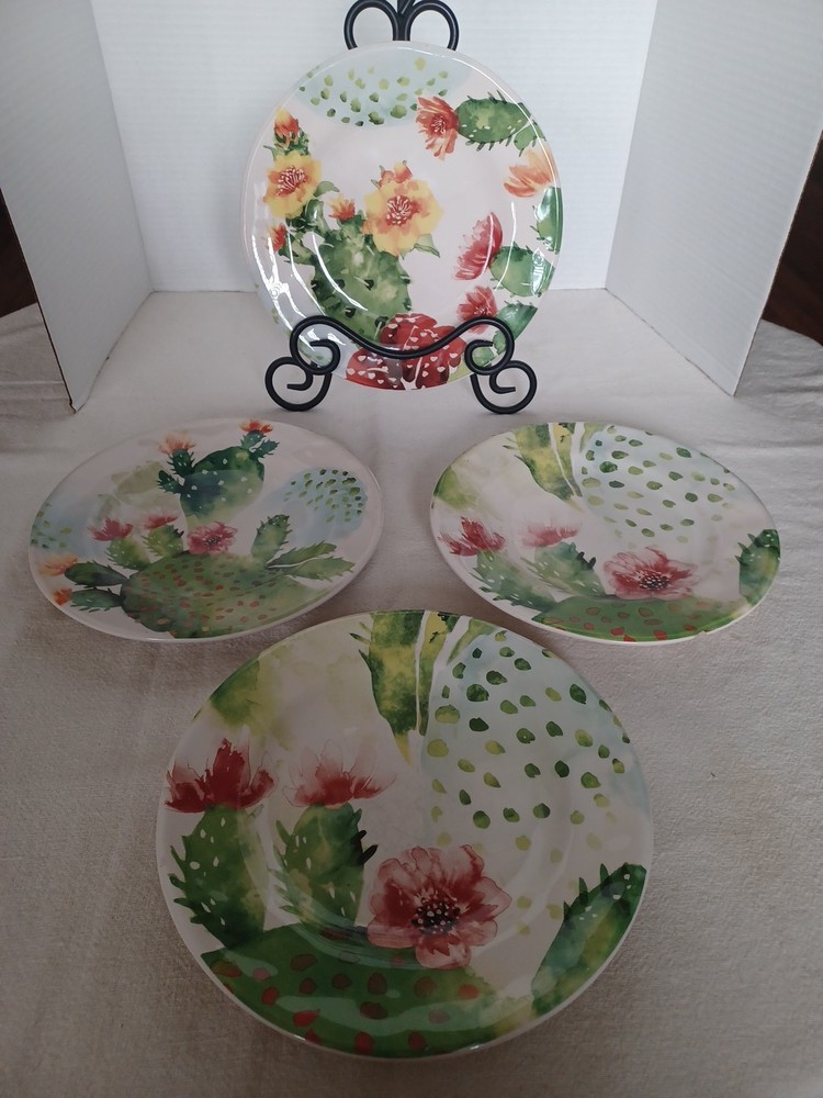 The Pier 1 Imports "Desert Cactus" Ironstone 9" Salad Plates set includes four contemporary-style plates featuring a cactus pattern in a multicolor finish. Made of stoneware using pottery production technique, these round salad plates are dishwasher safe and perfect for all occasions. With a glossy finish and printed backstamp, this original set from the 21st century adds a unique touch to your table setting. 2 plates have chips see photo.