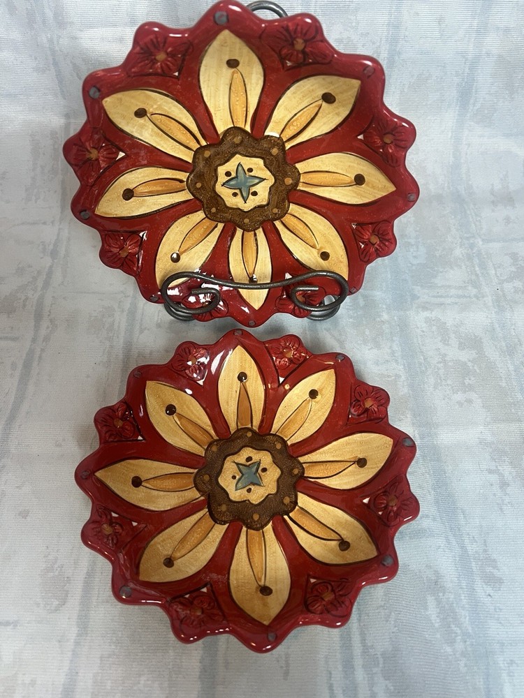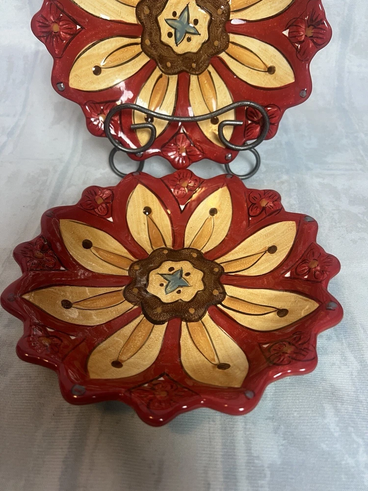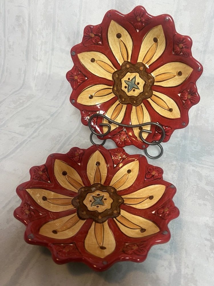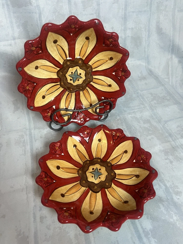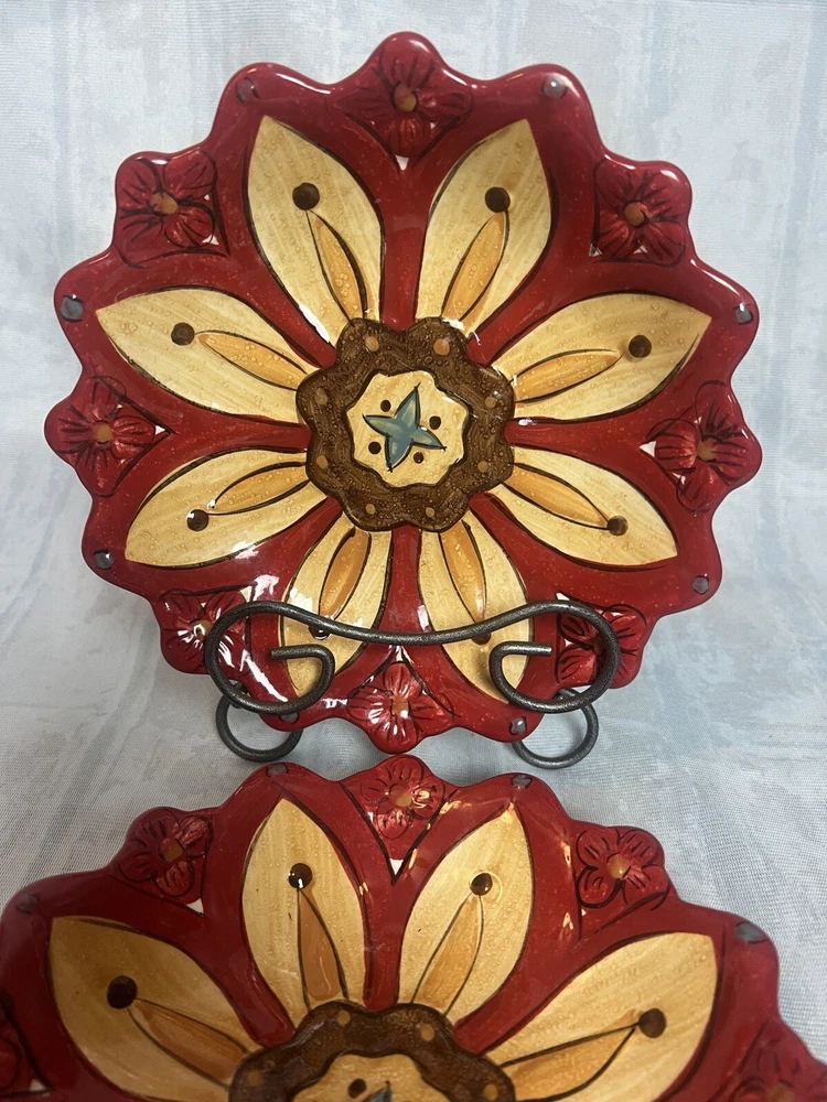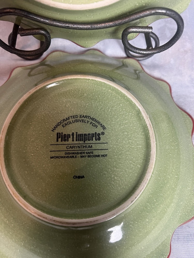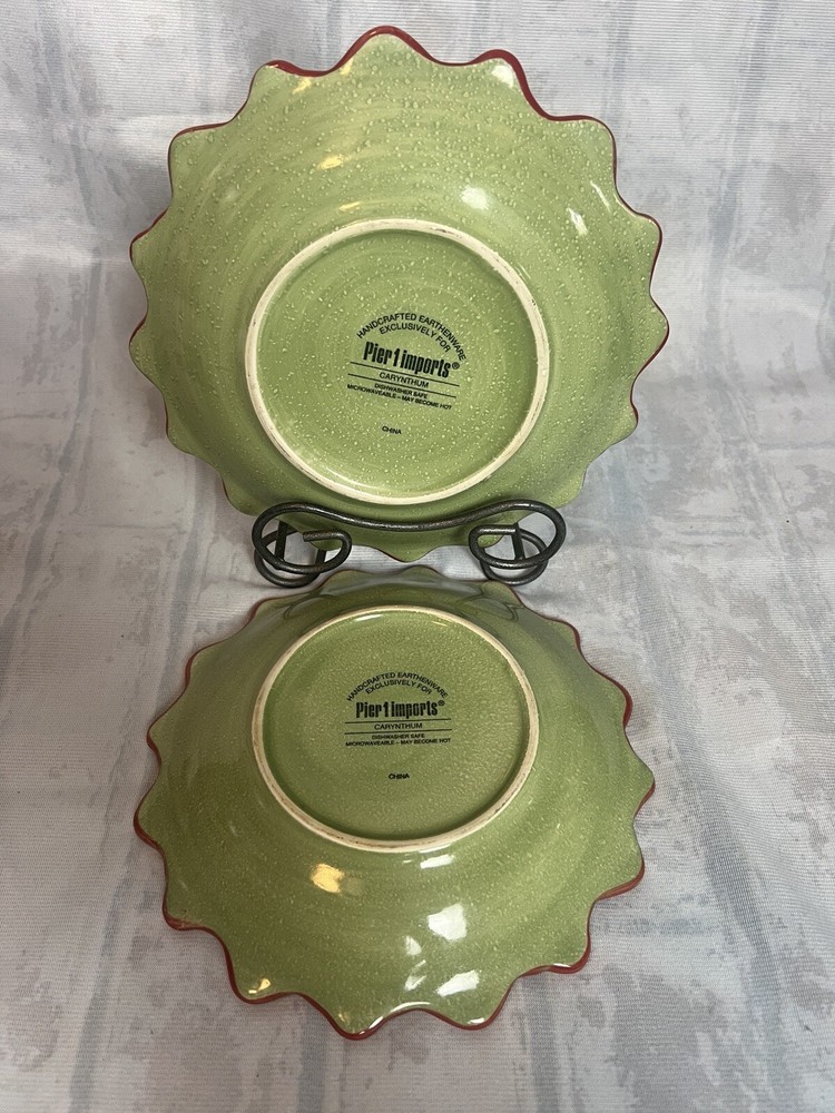 Add a touch of contemporary style to your dining experience with this Set of 2 Pier 1 Imports Dessert Salad Plates in the Carynthum pattern. The plates feature a beautiful floral design, with a round shape and multi-color palette that will suit all occasions. Made of high-quality stoneware, these plates are perfect for serving desserts or salads. These plates are part of the Pier 1 product line, are an original production style from 2000-2009, and were made in China using a pottery production technique. They are printed with the Pier 1 backstamp and are handmade. The plates are perfect for any flower-themed party or even as an everyday item. Get your hands on this beautiful set today!