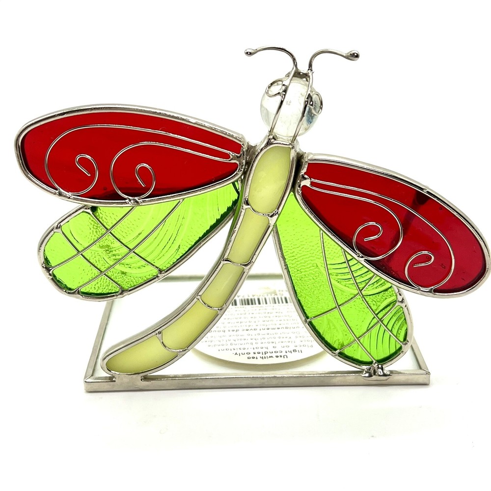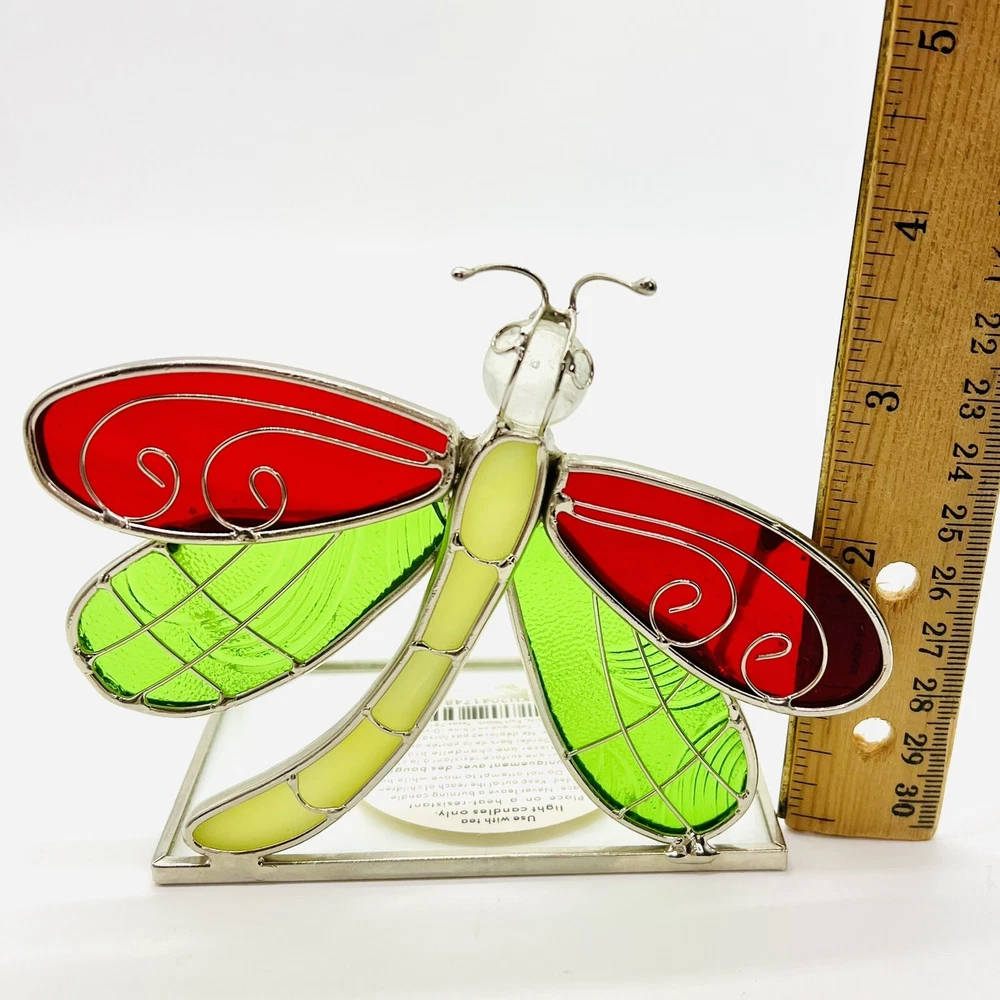 Pier 1 Imports Dragonfly Red and Green Stained Glass Votive or Tea Light Candle Holder, 3.75 in Tall...