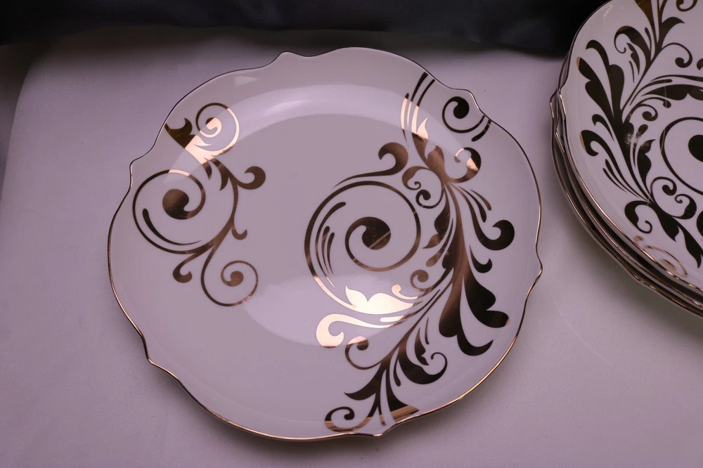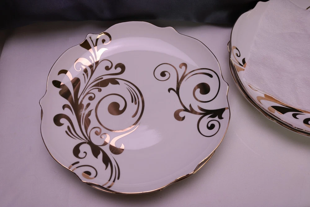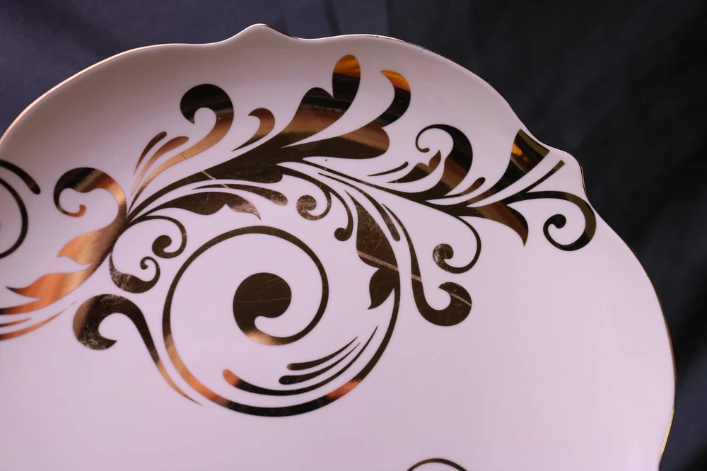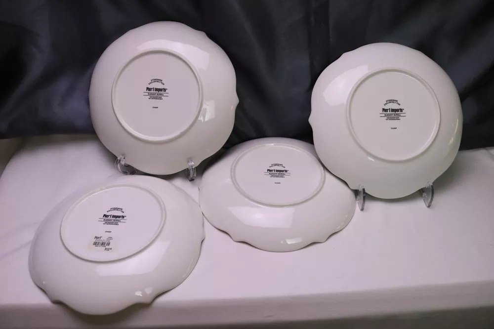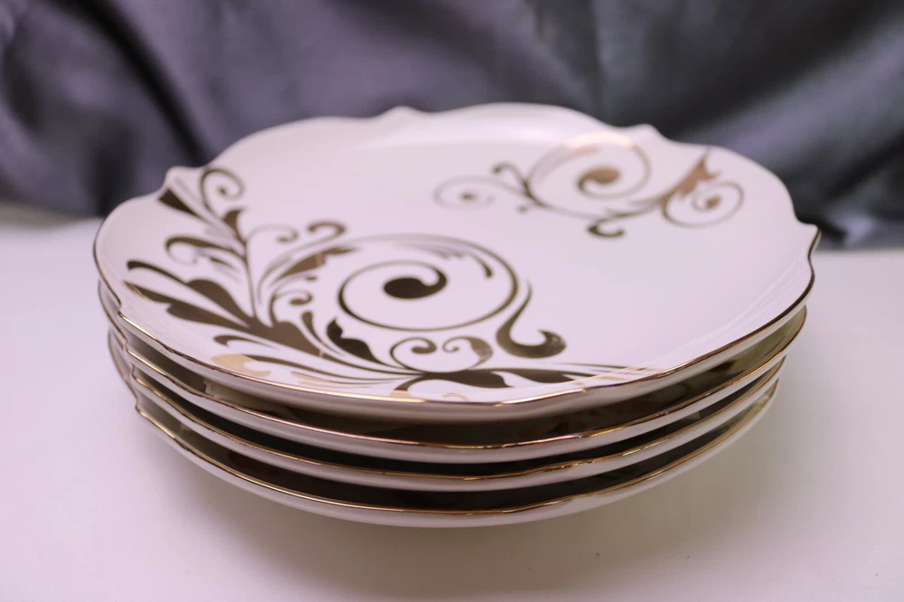Set of 4 ELEGANT SCROLL Salad Plates Pier 1 Imports White porcelain plate with gold swirl design and scalloped rim Measurements: (4) 8 1/2 " rim diameter, weigh 15.5 oz each Condition: Very good, no chips, no cracks, no utensil marks, a few stacking marks on gold scroll (see photos one of each plate) Thanks For Looking