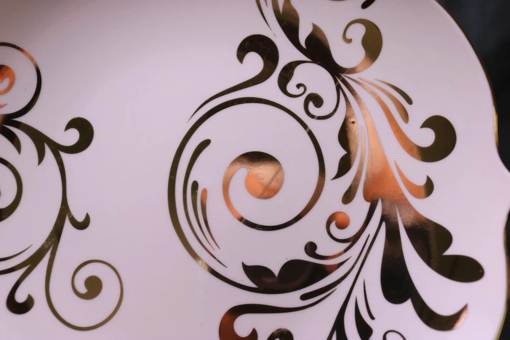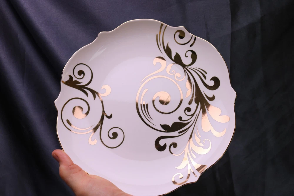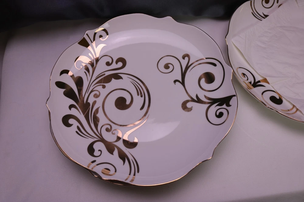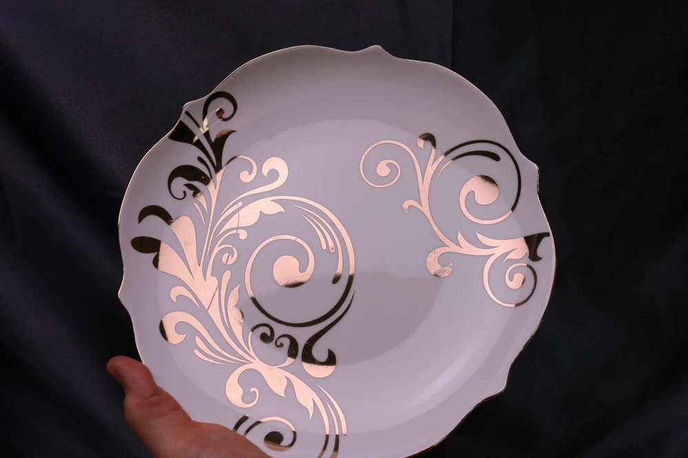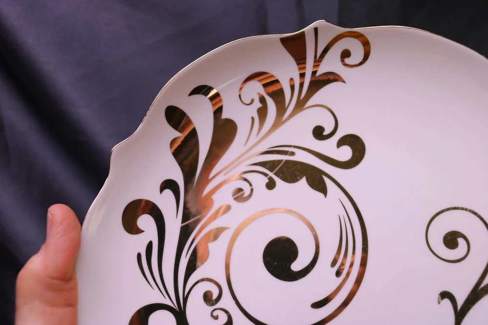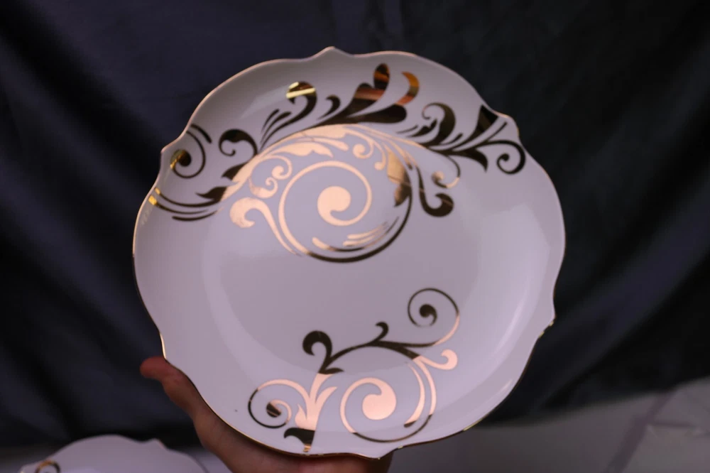 Set of 4 ELEGANT SCROLL Salad Plates Pier 1 Imports White porcelain plate with gold swirl design and scalloped rim Measurements: (4) 8 1/2 " rim diameter, weigh 15.5 oz each Condition: Very good, no chips, no cracks, no utensil marks, a few stacking marks on gold scroll (see photos one of each plate) Thanks For Looking