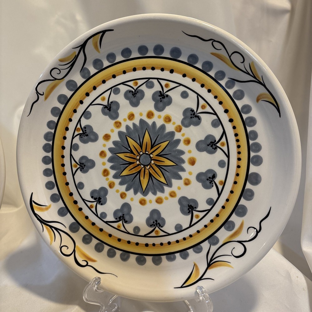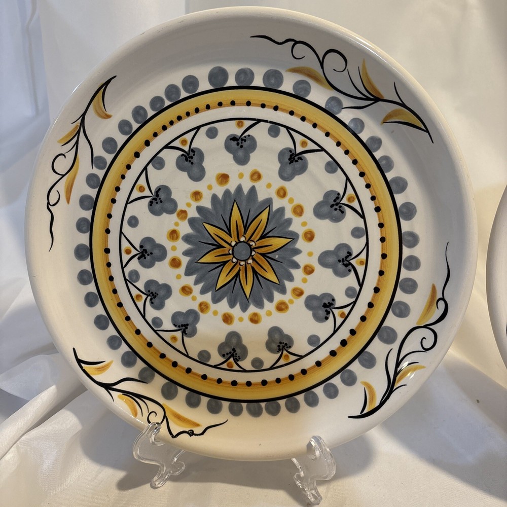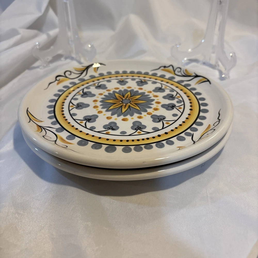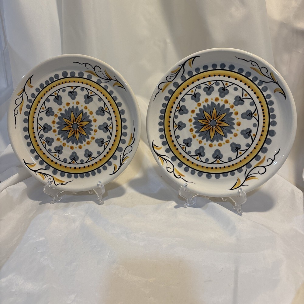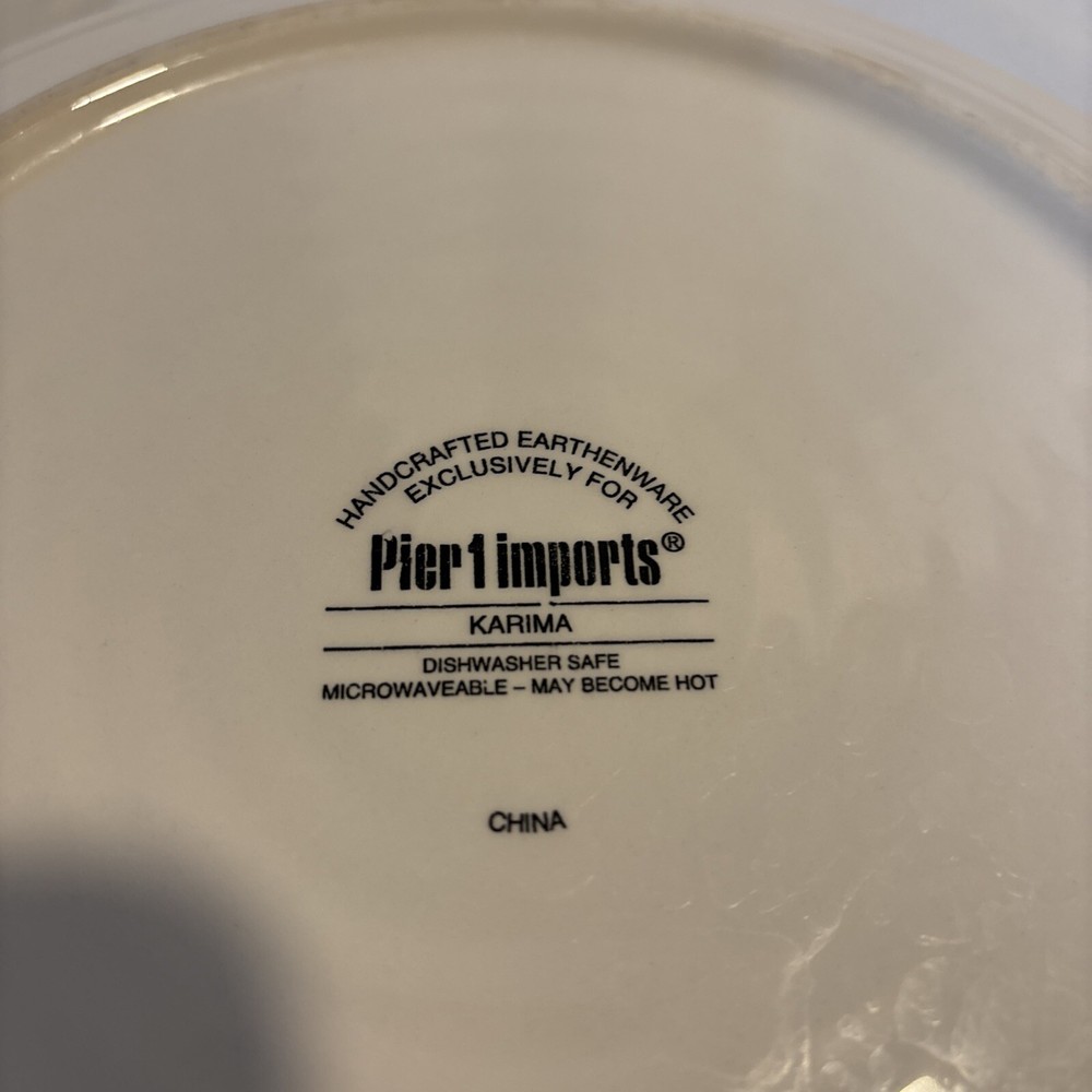 Pier 1 Imports Earthenware Karima 9” Salad Plates Geometric Flower - Set of 2. Excellent condition as they have never been used, only sat on a shelf in a smoke free home for years. They have been hand wiped and dried. They each measure 9" in diameter. Marked Pier 1 Imports Karima Handcrafted Earthenware Exclusively for Pier 1 Dishwasher Safe Microwaveable - May Become Hot. If you have any questions, please just ask. Thanks for looking!