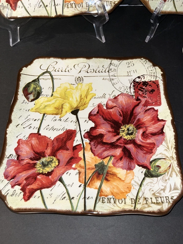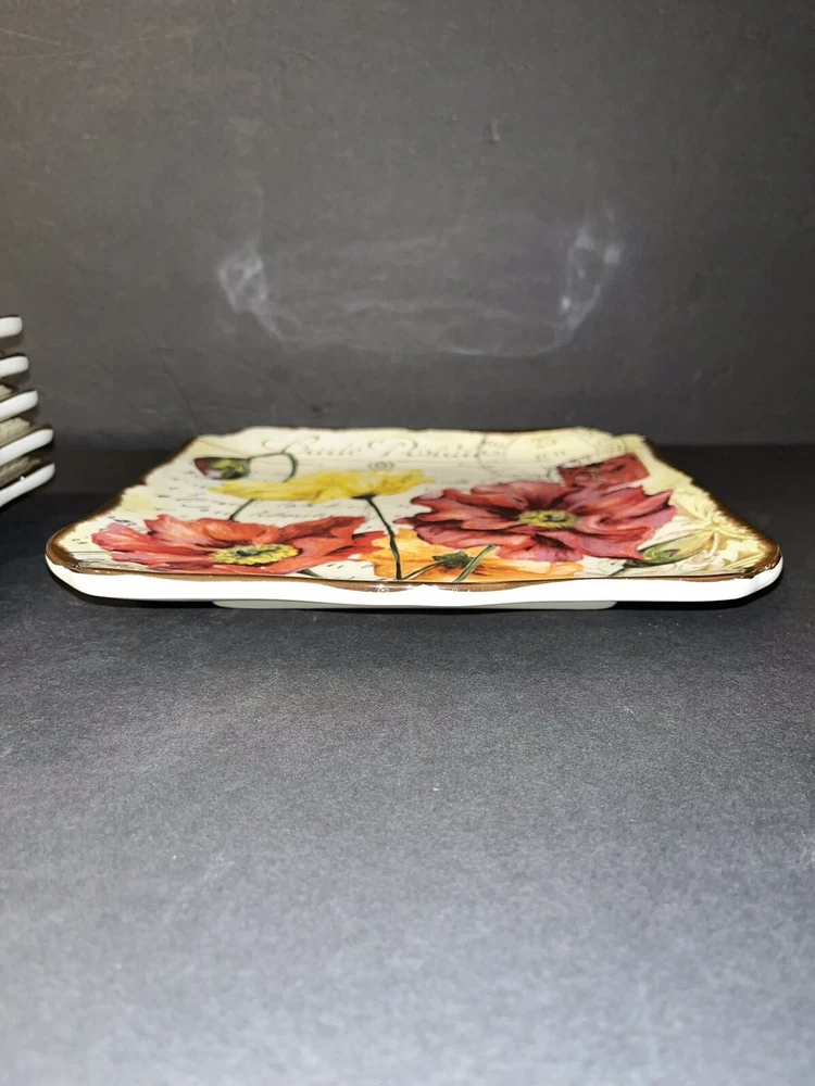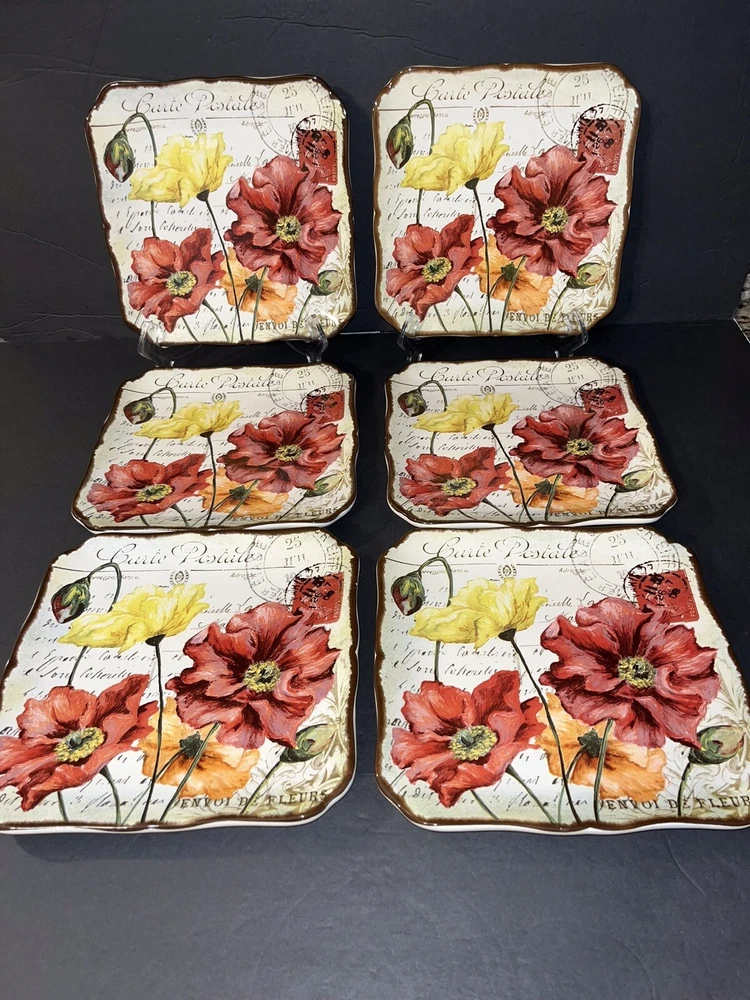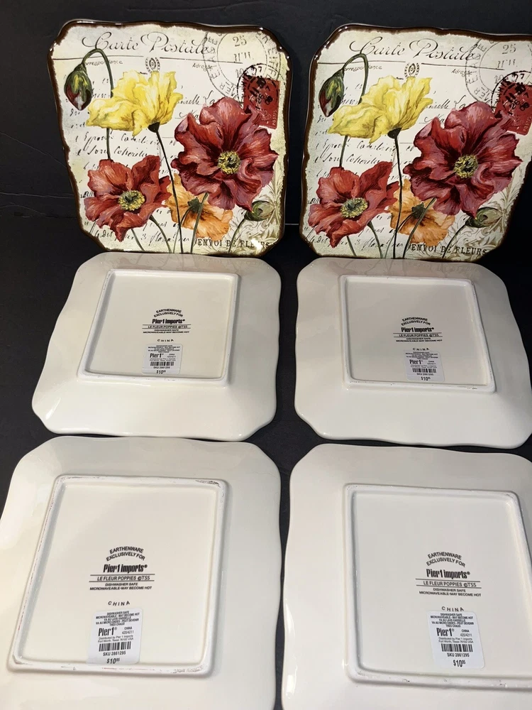 Add a touch of elegance to your dining experience with this six-piece set of Pier 1 Imports earthenware salad plates. The floral pattern and glossy finish of these 8.5" square plates make them perfect for all occasions. The set includes plates with a stackable and decorative design, featuring the Le Fleur Poppies product line. Crafted from high-quality earthenware material, these plates are durable and dishwasher safe. The printed backstamp and production style of these plates ensure that they are a perfect addition to your collection. Ideal for serving salads and other dishes, this set of plates is a must-have for any kitchen.