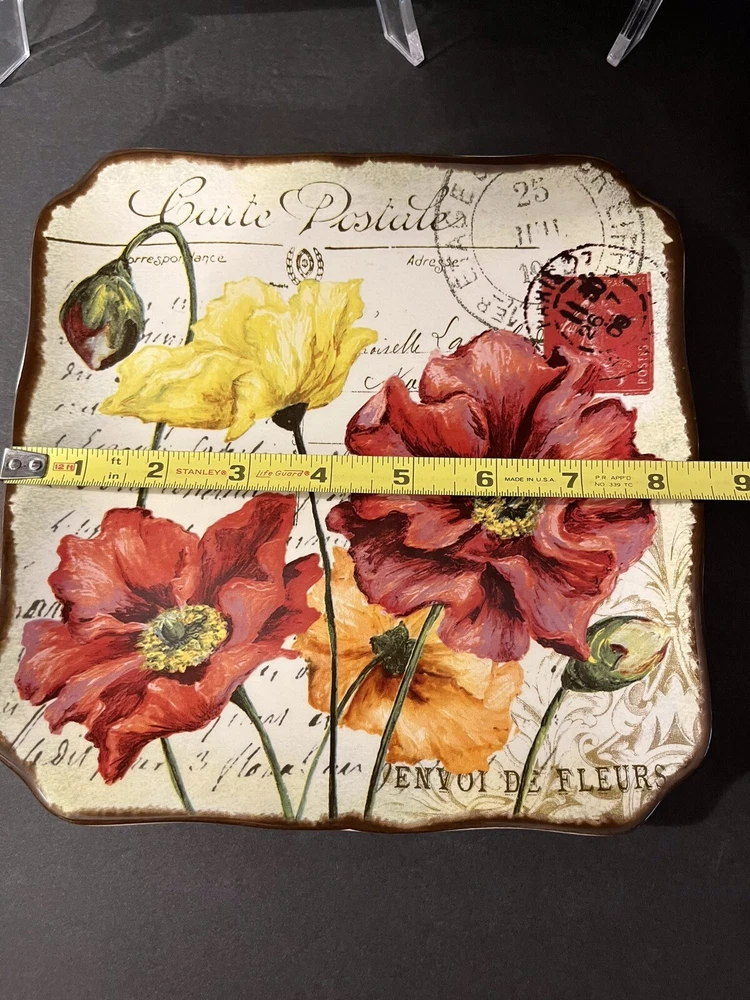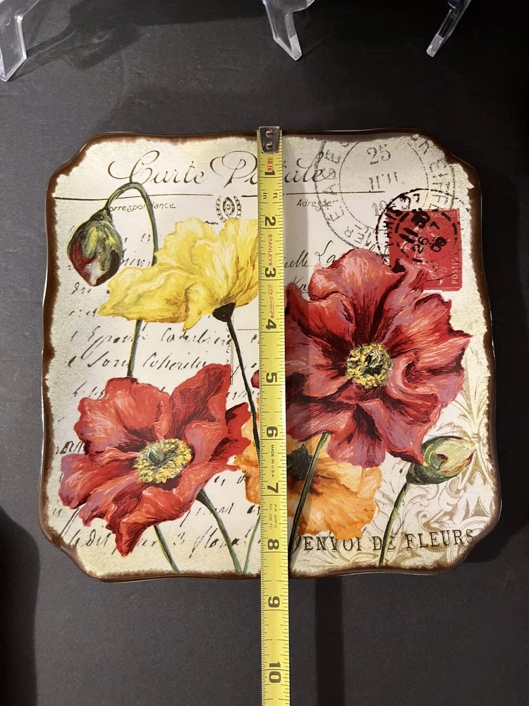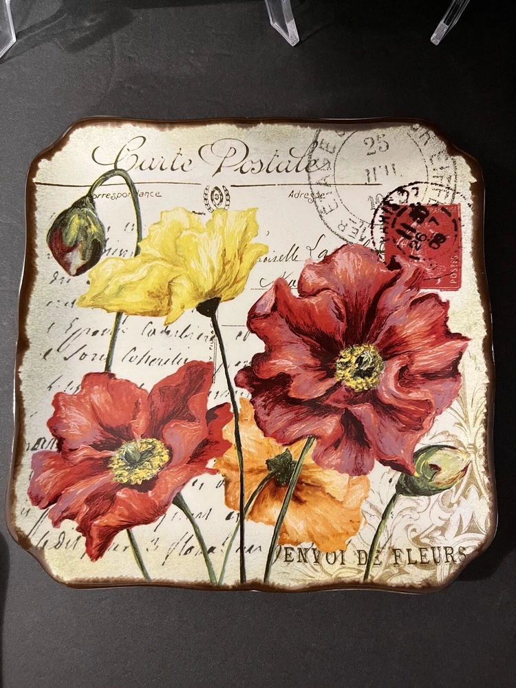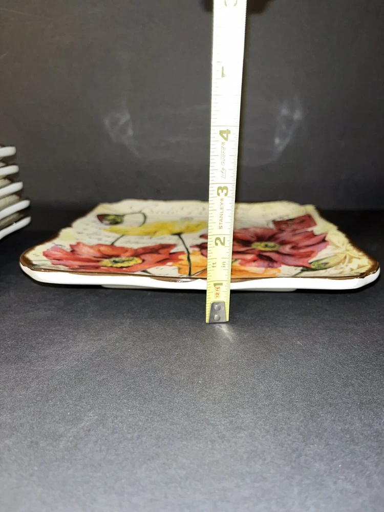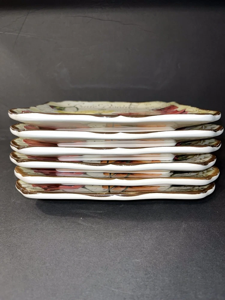 Add a touch of elegance to your dining experience with this six-piece set of Pier 1 Imports earthenware salad plates. The floral pattern and glossy finish of these 8.5" square plates make them perfect for all occasions. The set includes plates with a stackable and decorative design, featuring the Le Fleur Poppies product line. Crafted from high-quality earthenware material, these plates are durable and dishwasher safe. The printed backstamp and production style of these plates ensure that they are a perfect addition to your collection. Ideal for serving salads and other dishes, this set of plates is a must-have for any kitchen.
