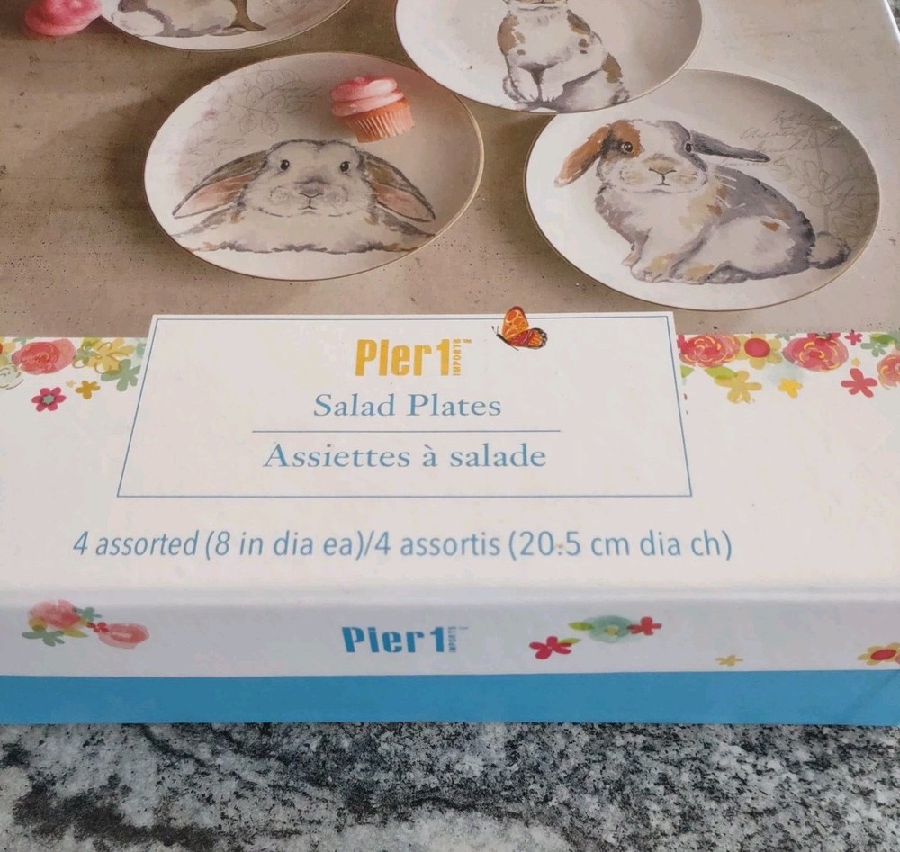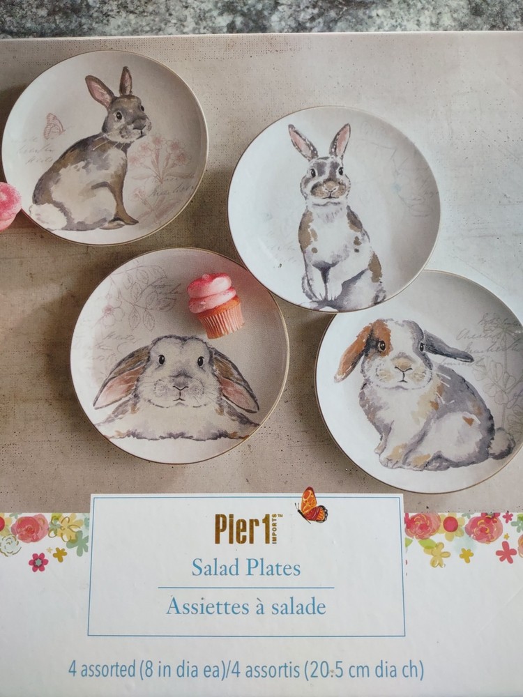 This is a set of 4 salad plates from Pier 1. Each plate is 8" diameter and has a picture of a grey bunny. See pictures for details on condition.