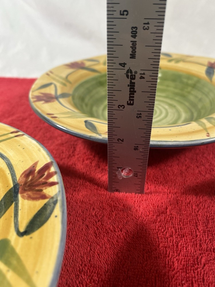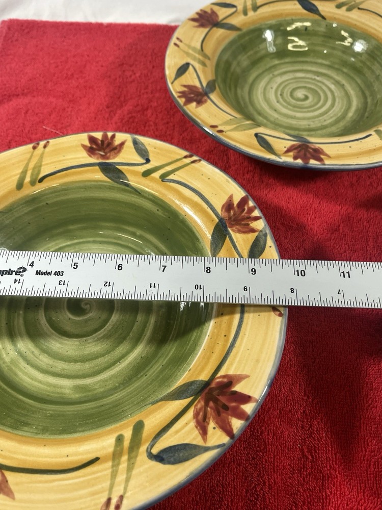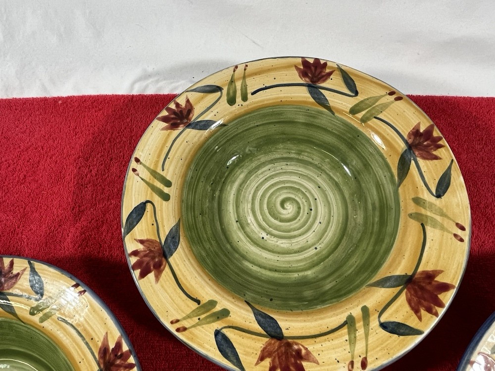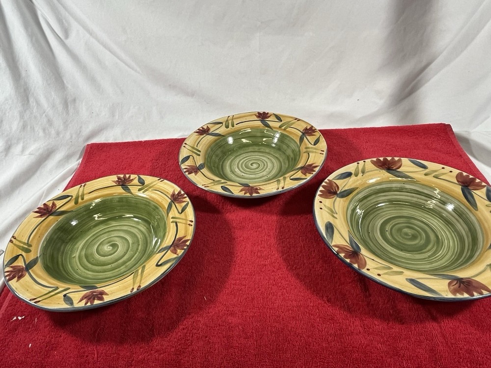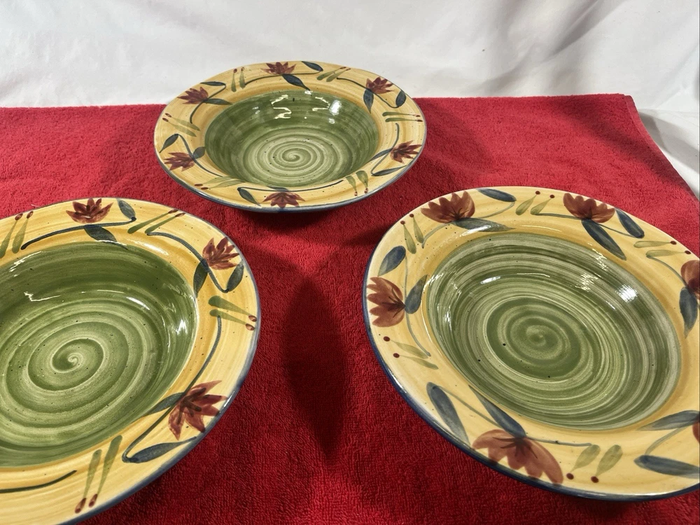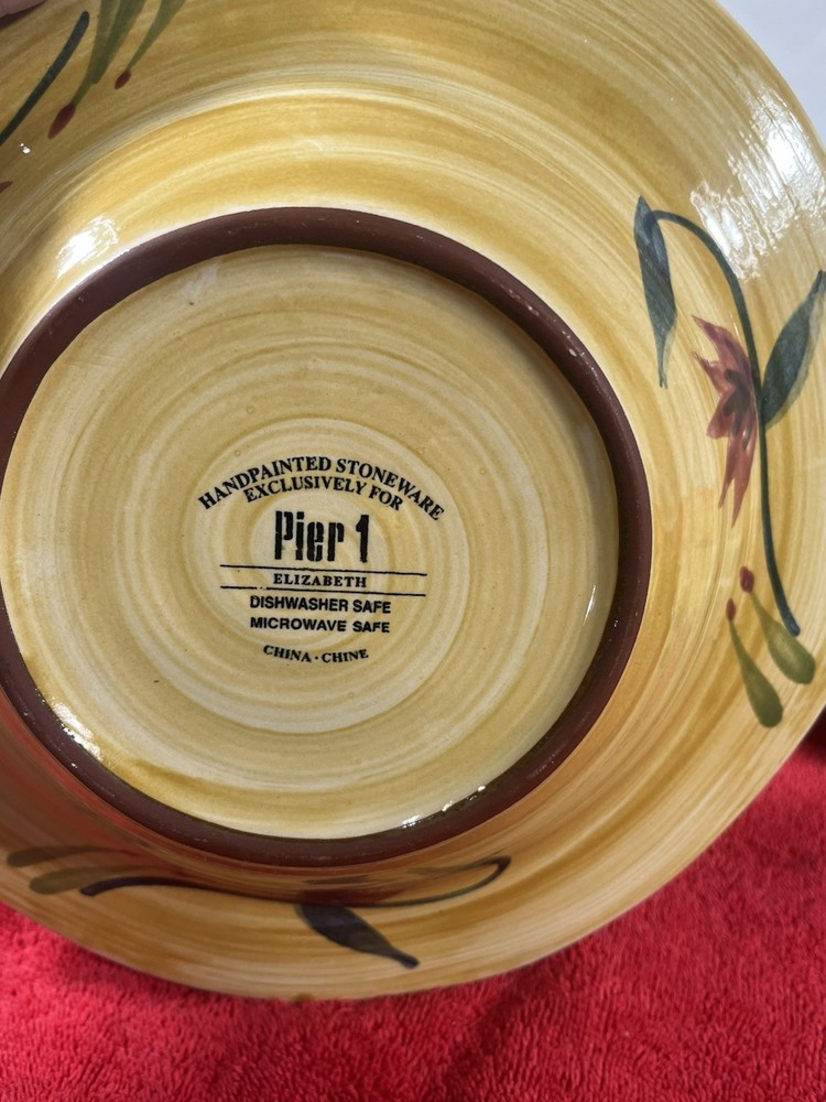 Add a touch of elegance to your dining table with this set of three Pier 1 Imports Elizabeth salad plates. The plates have a beautiful floral pattern that will complement any occasion. They are made of sturdy stoneware and have a glossy finish. Each plate measures 10 inches in diameter and is microwave and dishwasher safe. The set includes three salad plates and is a great addition to your dinnerware collection. These plates are handmade and have a hand-painted design, making them unique and one-of-a-kind.