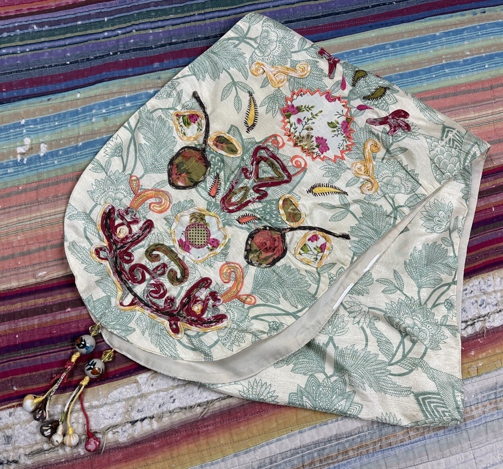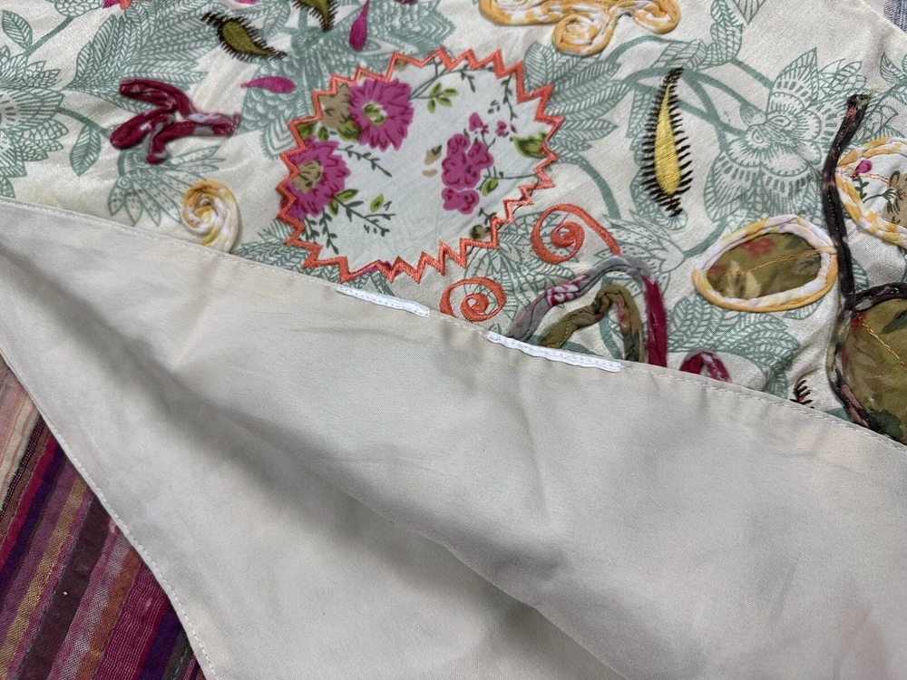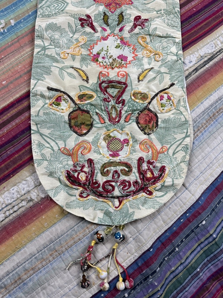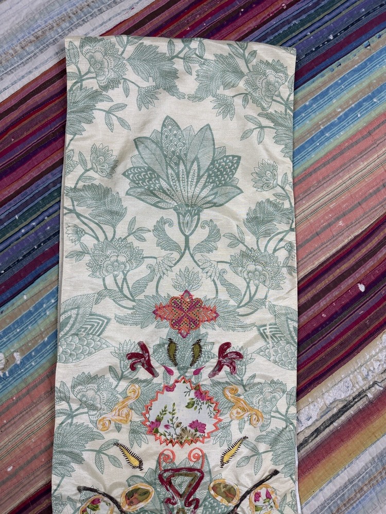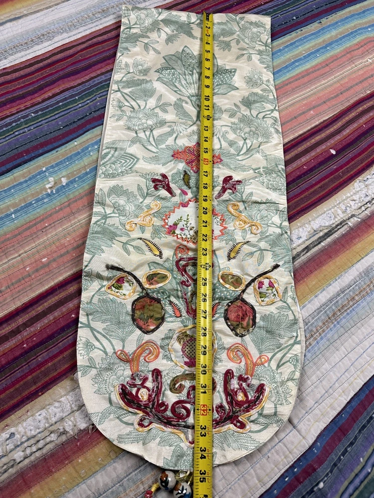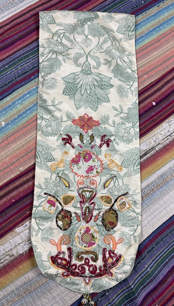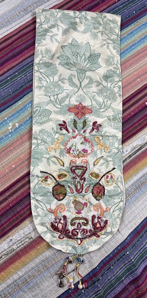 Pier 1 Imports Embellished Embroidered Floral Bird Cage Design Table Runner 69” Info tags previously trimmed. 2 balls on tassel strings missing on one end. One spot about halfway (lengthwise).