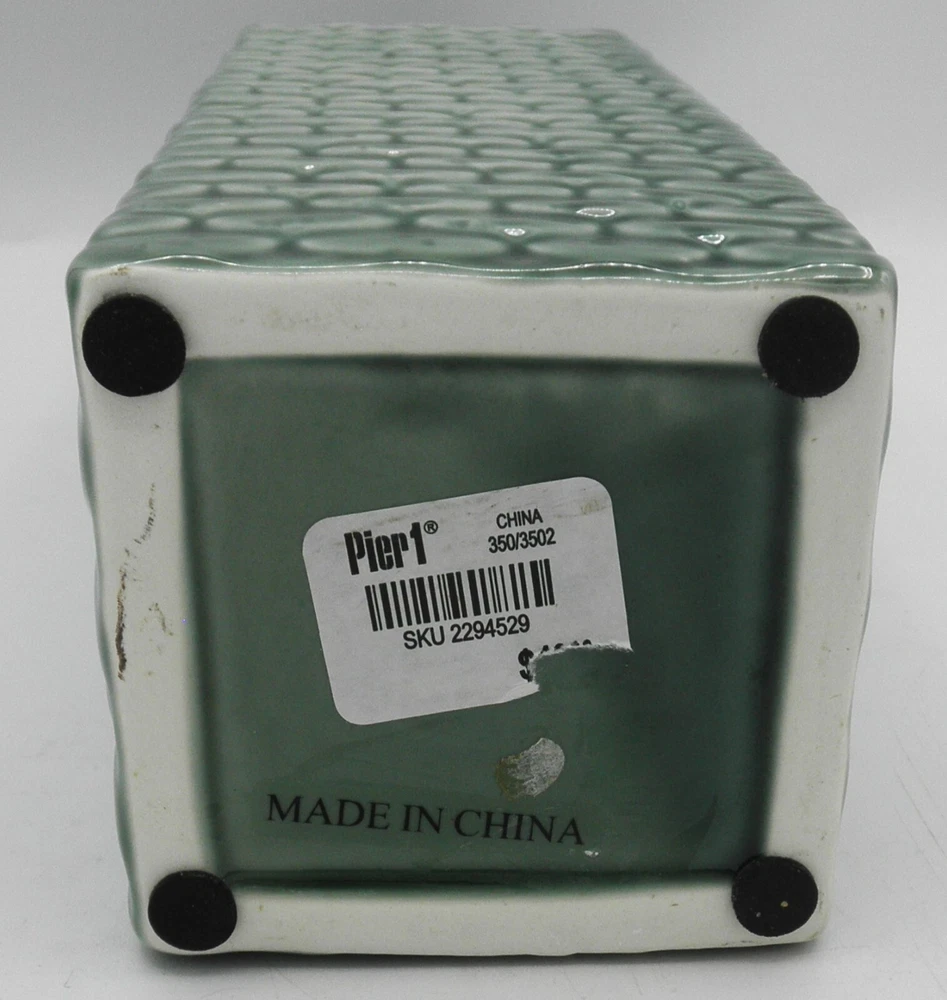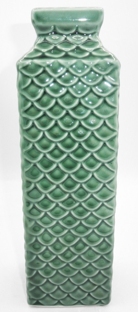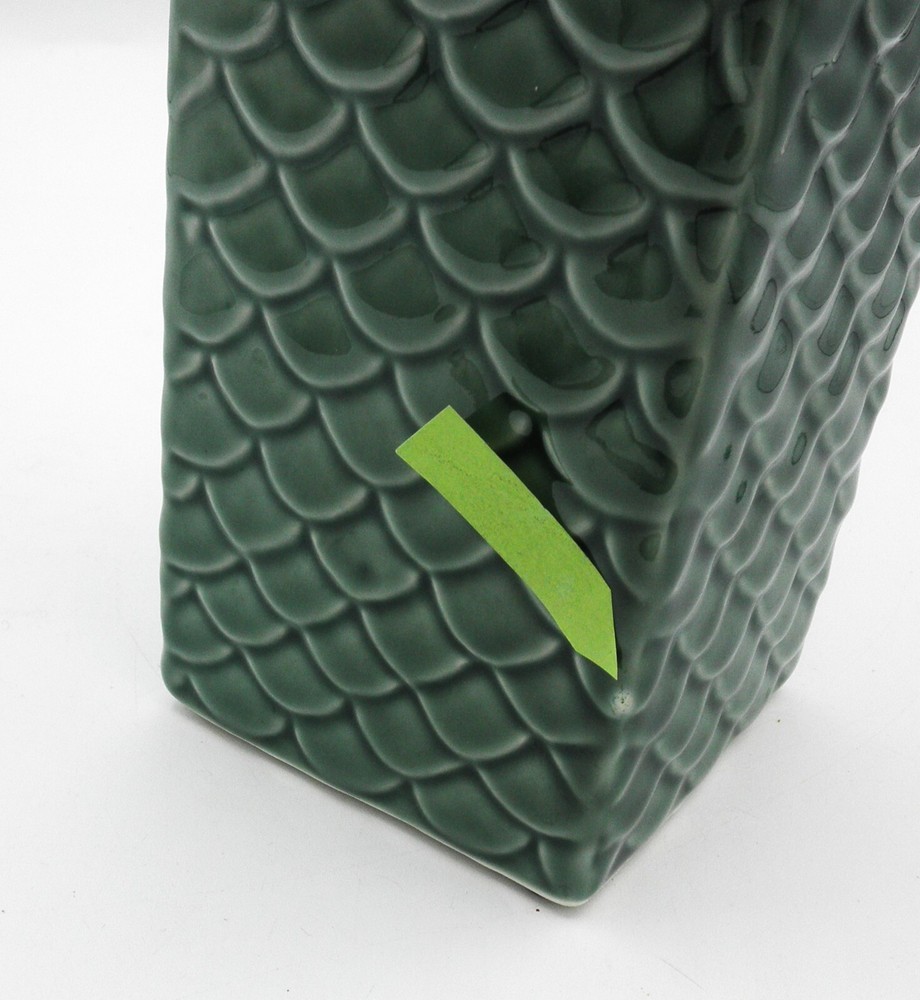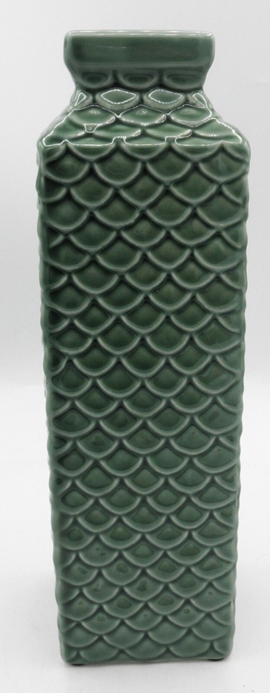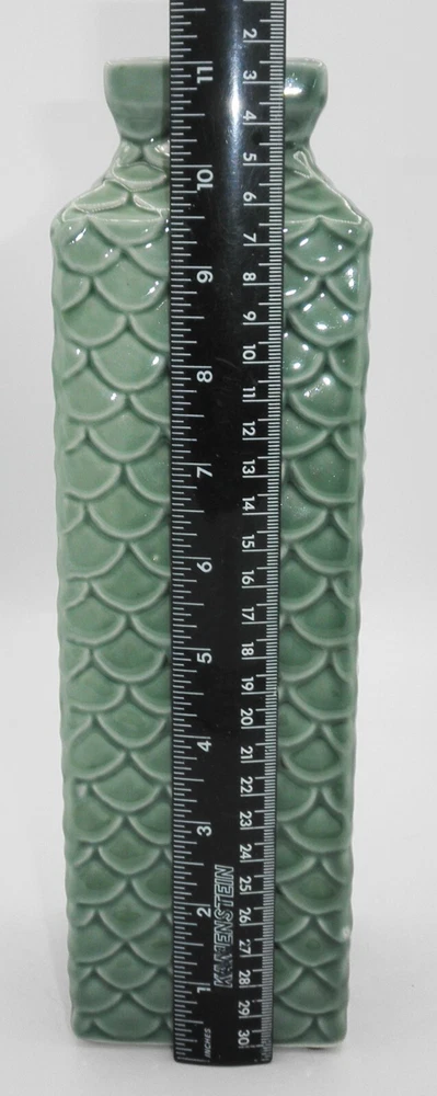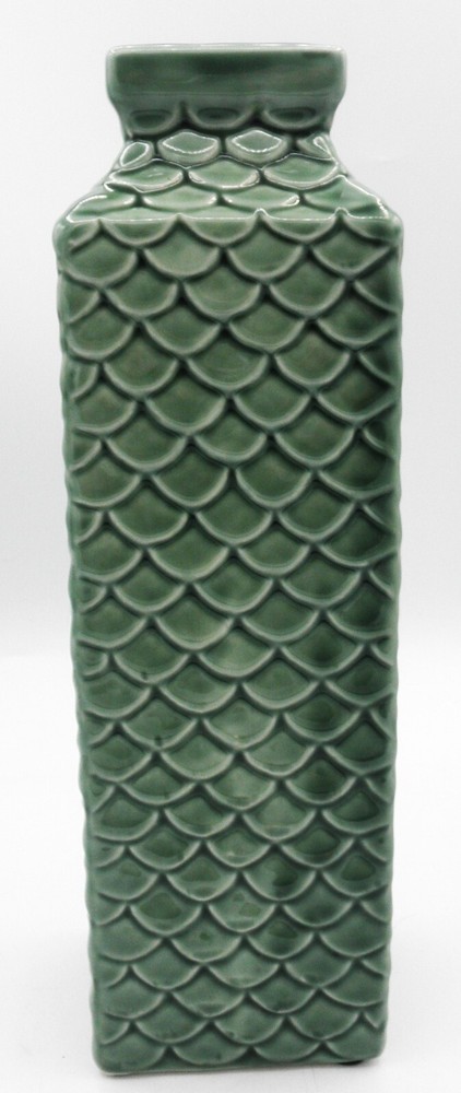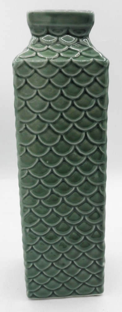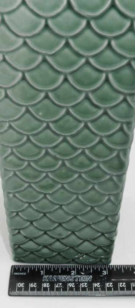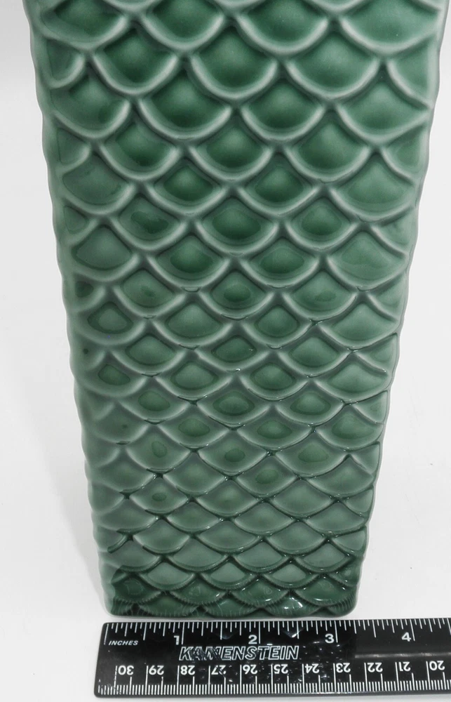 Pier 1 Imports Embossed Fish Scale Ceramic Vase 11 Inch Green Classic Design. Found in good used vintage condition. No chips, cracks, fleabites, crazing or repairs. There's 1 spot where the glaze was missed during the manufacturing process (see photo with arrow). This beautiful vase will make a great accent piece adding a pop of texture and color to any room decor!