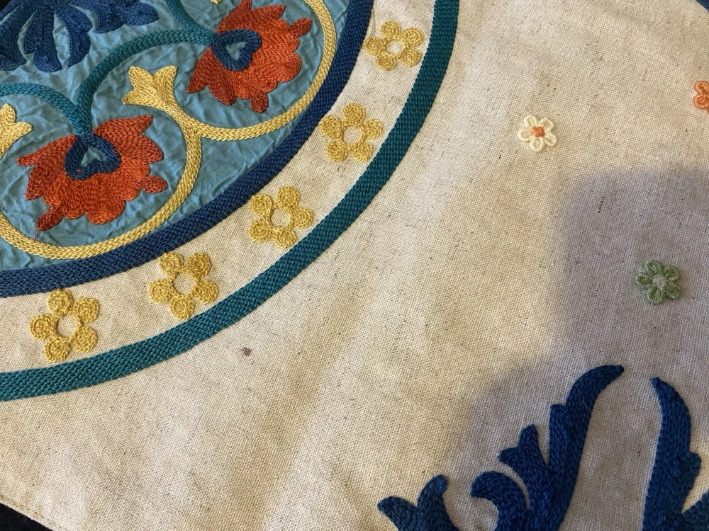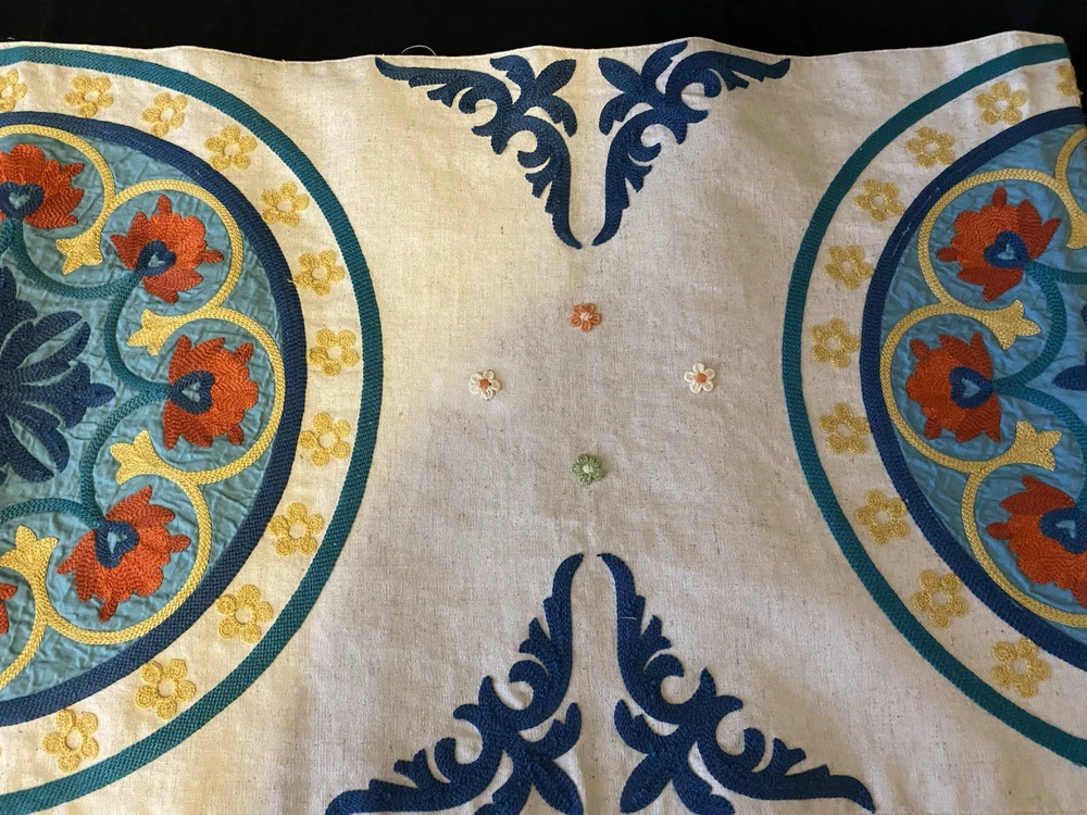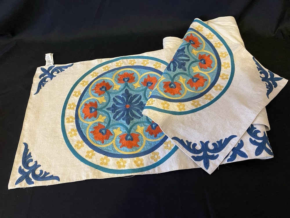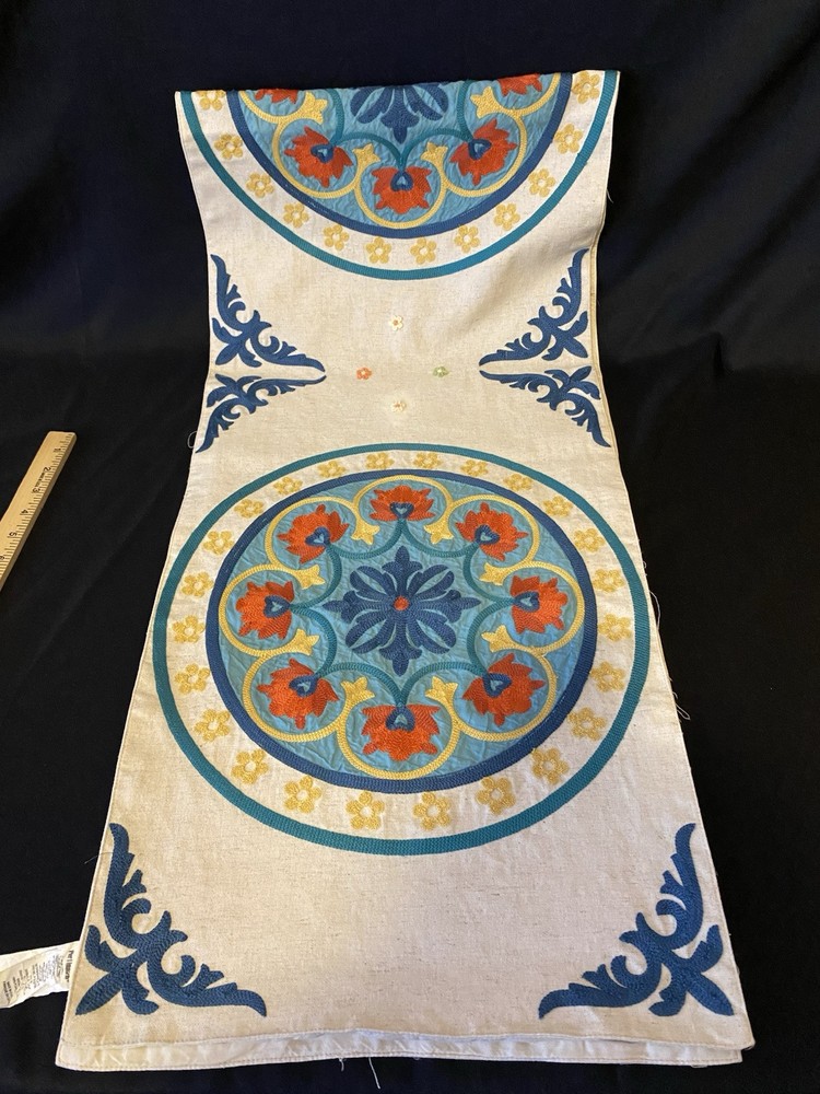 Very pretty embroidered table runner. About 15” x 68”. Good condition overall except there is a spot discolored a bit. Eight small daisies were added on. Please see all pictures for details.