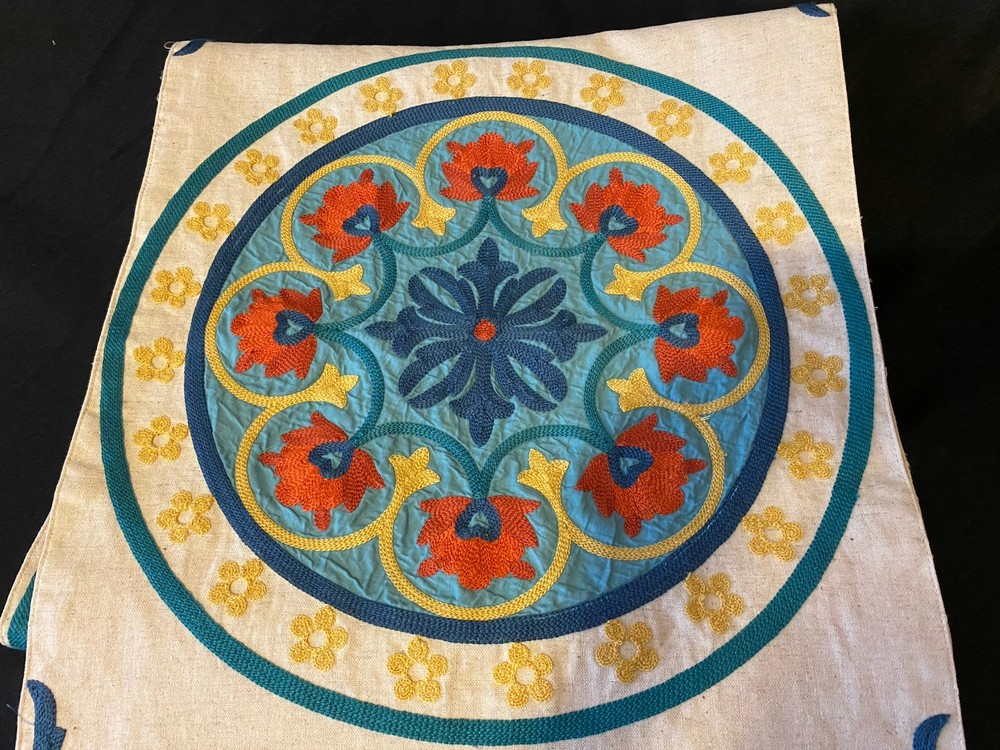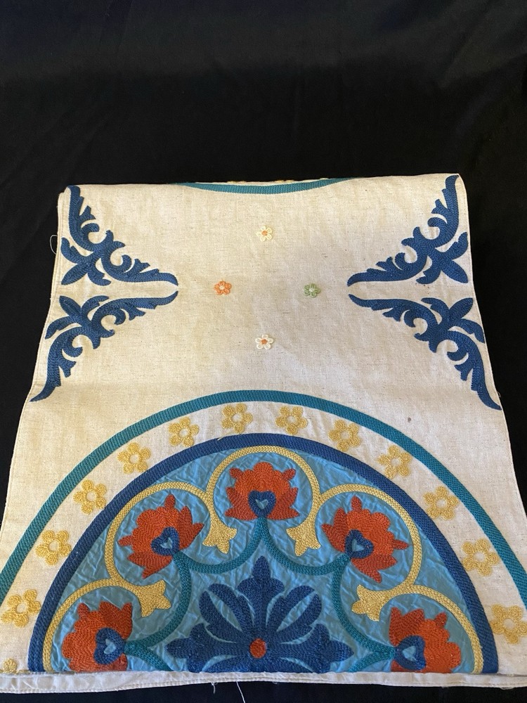 Very pretty embroidered table runner. About 15” x 68”. Good condition overall except there is a spot discolored a bit. Eight small daisies were added on. Please see all pictures for details....
