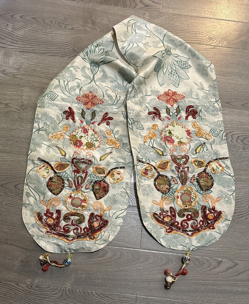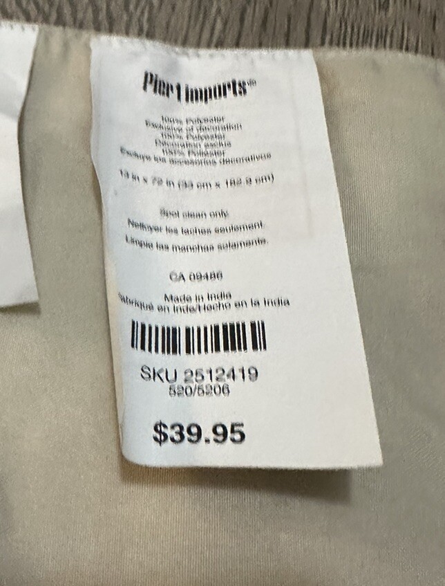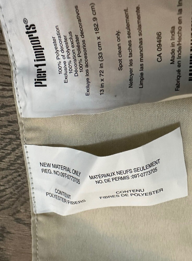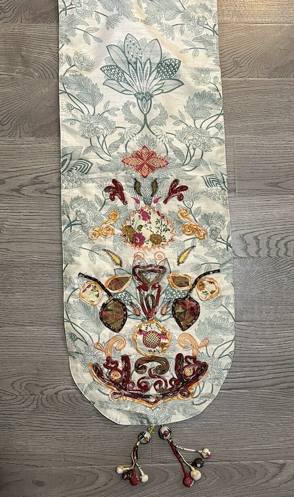 Add a touch of bohemian fashion to your dining table with this Pier 1 Imports table runner. Measuring 13 x 72 inches, it is adorned with an intricate paisley botanical pattern with applied fabric and embroidery. Made from 100% polyester material, it is durable and perfect for multipurpose occasions. This Indian-style table runner features a colorful design that will complement any home decor. It is crafted in India and offers a unique blend of style and quality. Whether you are hosting a dinner party or simply looking to upgrade your table setting, this embroidered table runner is a great choice. In great condition with no rips or tears, loose fabric or embroidery ,stains, or odors. please see photos for condition and details. Message me with any questions before purchasing. Thanks for looking!