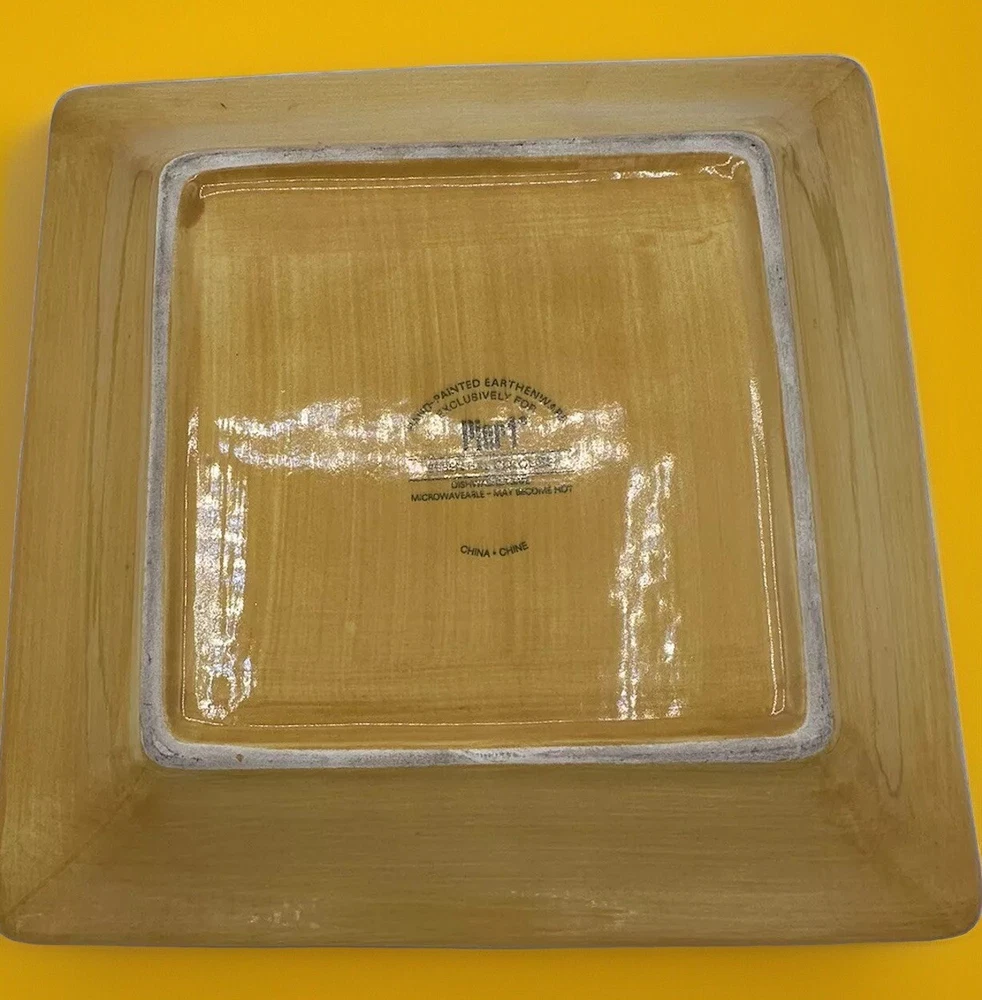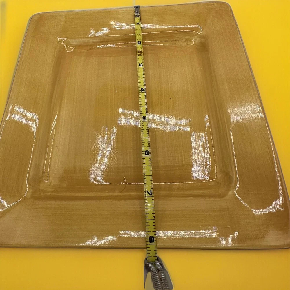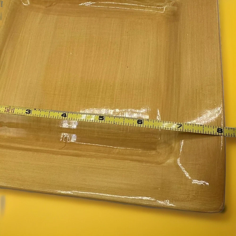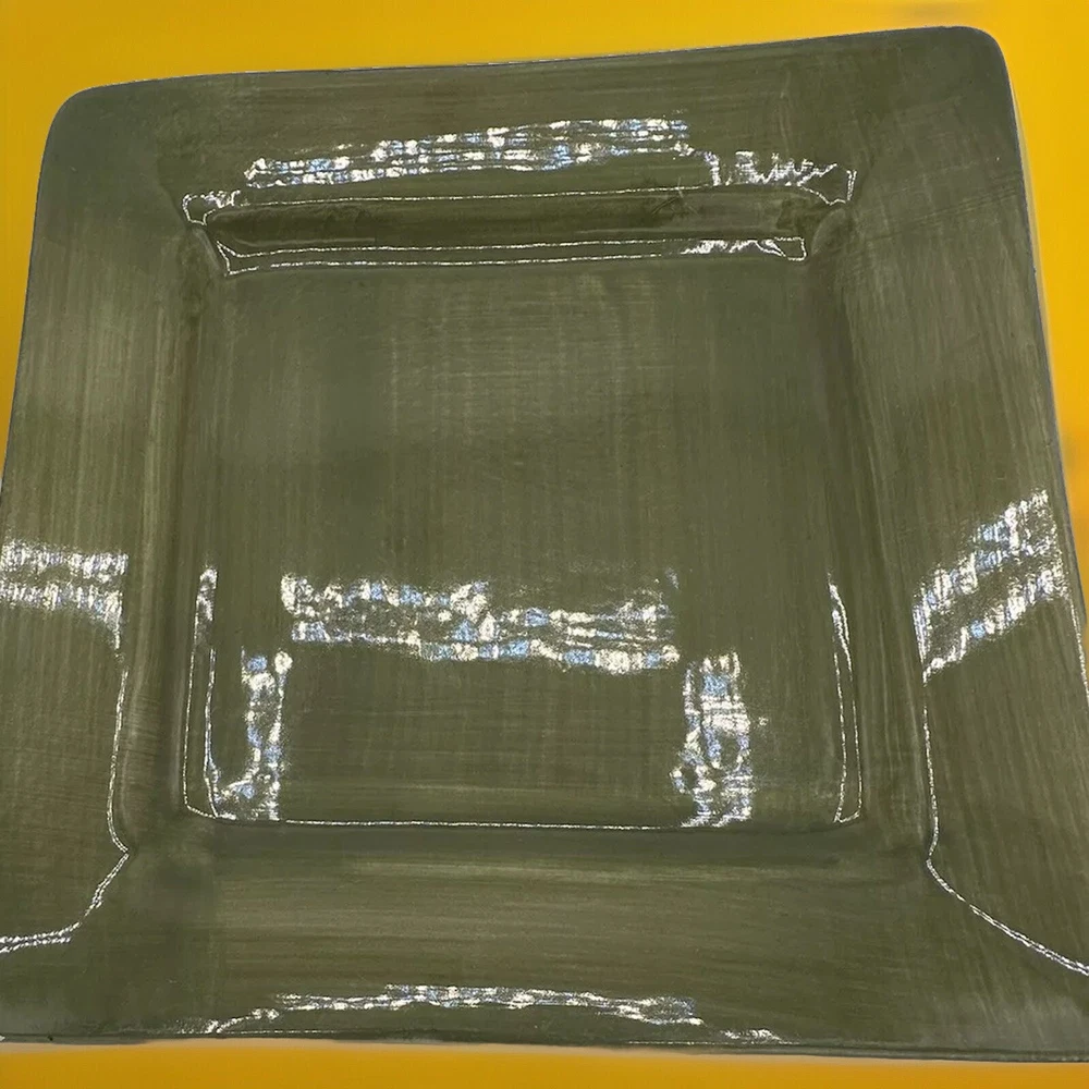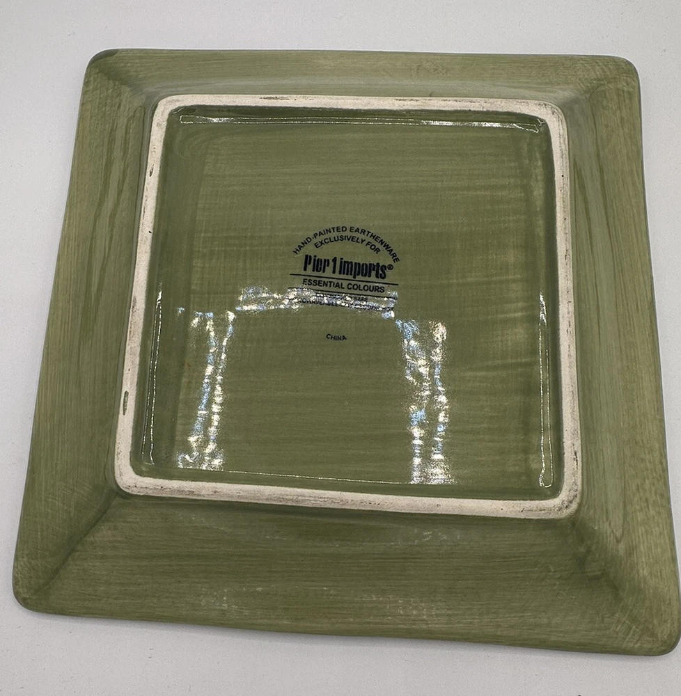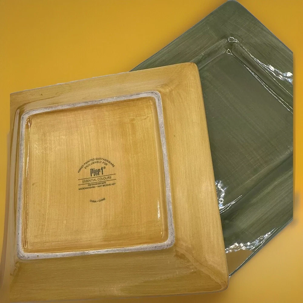 Add a pop of color to your dining table with this set of two Pier 1 Imports Essential Colors Earthenware Square salad Plates. These plates are perfect for all occasions, with a contemporary style and a solid yellow/green color. The 8" plates are hand-painted and dishwasher safe, making them both beautiful and practical. Crafted from clay and produced using pottery techniques, these plates feature a glossy finish and a printed backstamp. They are part of the Essential Colors product line and come from China. This two-piece plate set is perfect for adults who want to add some handmade charm to their table setting. See last picture which has a little flea bite on it. Both plates are in beautiful condition otherwise. I ship Monday through Friday My home is smoke free Thank you and please feel free to contact me anytime with concerns.