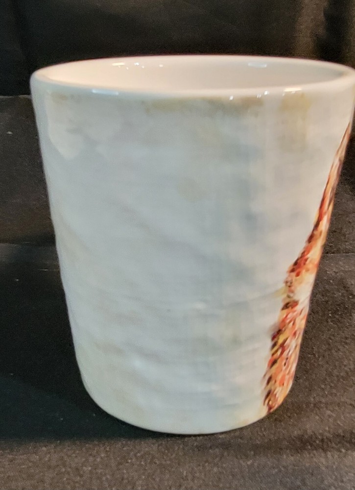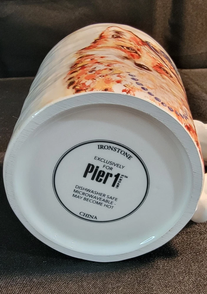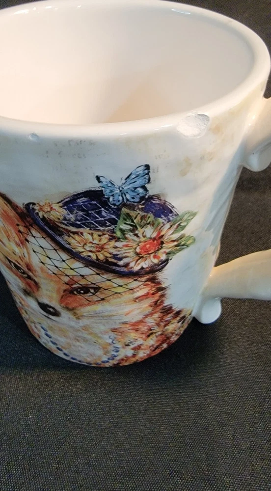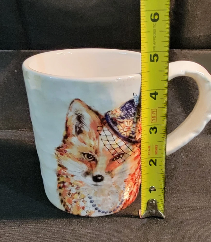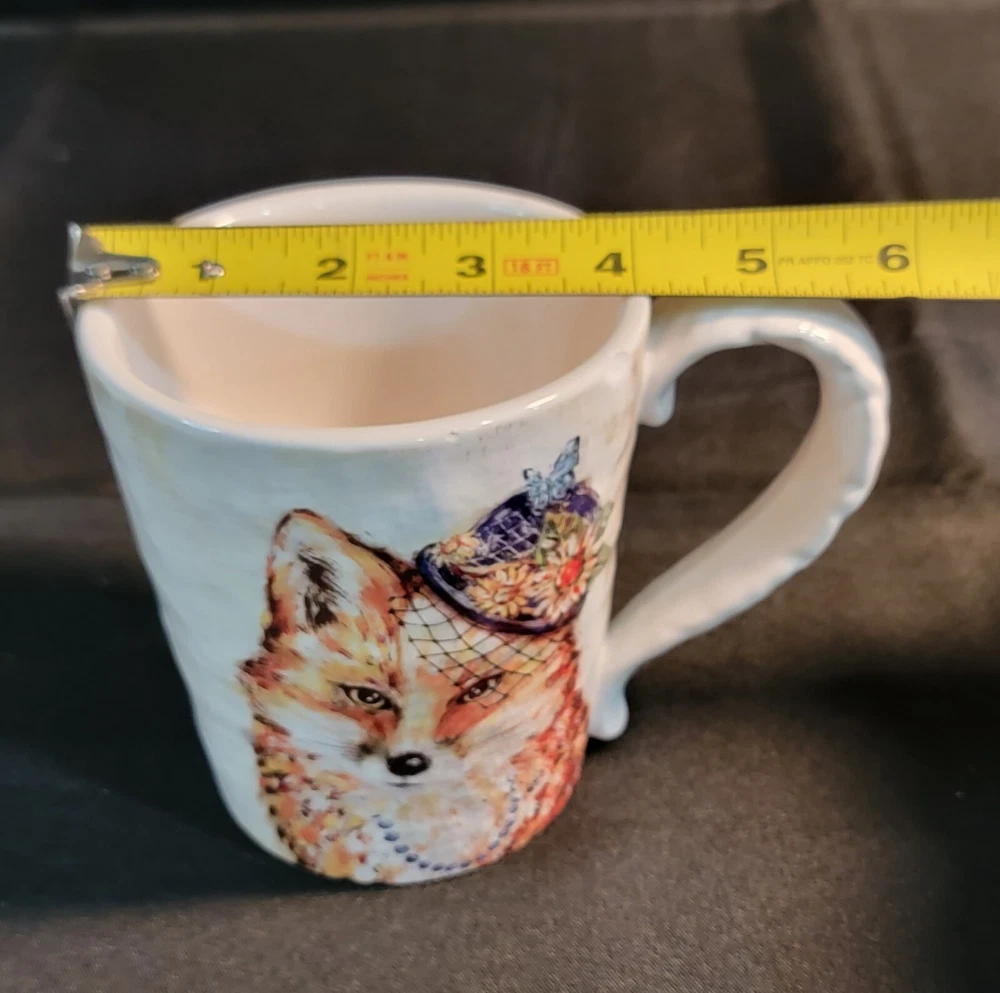 Add some whimsy to your morning routine with this Pier 1 Imports exclusive coffee mug featuring a charming fox wearing a fancy hat and necklace. The ceramic material provides durability and the glossy finish adds a touch of elegance to the contemporary style. Measuring 4.5 inches in height and with a round shape, this coffee mug is perfect for any occasion, whether it's your daily caffeine fix or a special occasion. The mug is also practical with features such as microwave and dishwasher safety, ensuring easy cleaning and reheating. The beautiful pattern and production technique of pottery make it a lovely addition to any collection. Bring some character to your kitchen with this Pier 1 Exclusive Fox Mug, an original and licensed reproduction that is sure to impress. Chip on Rim- see pictures for details