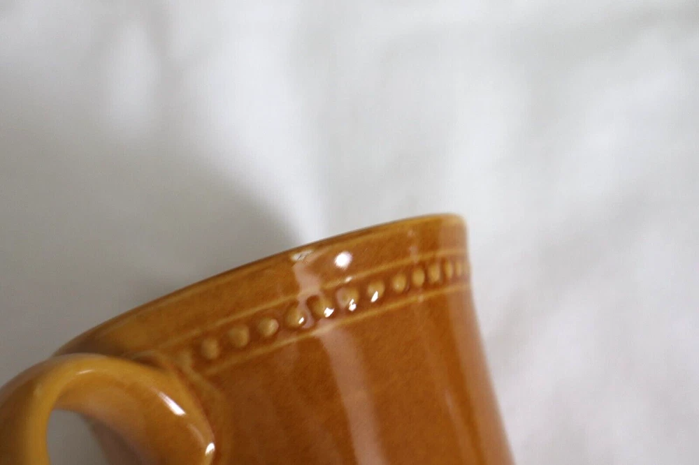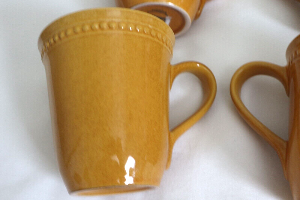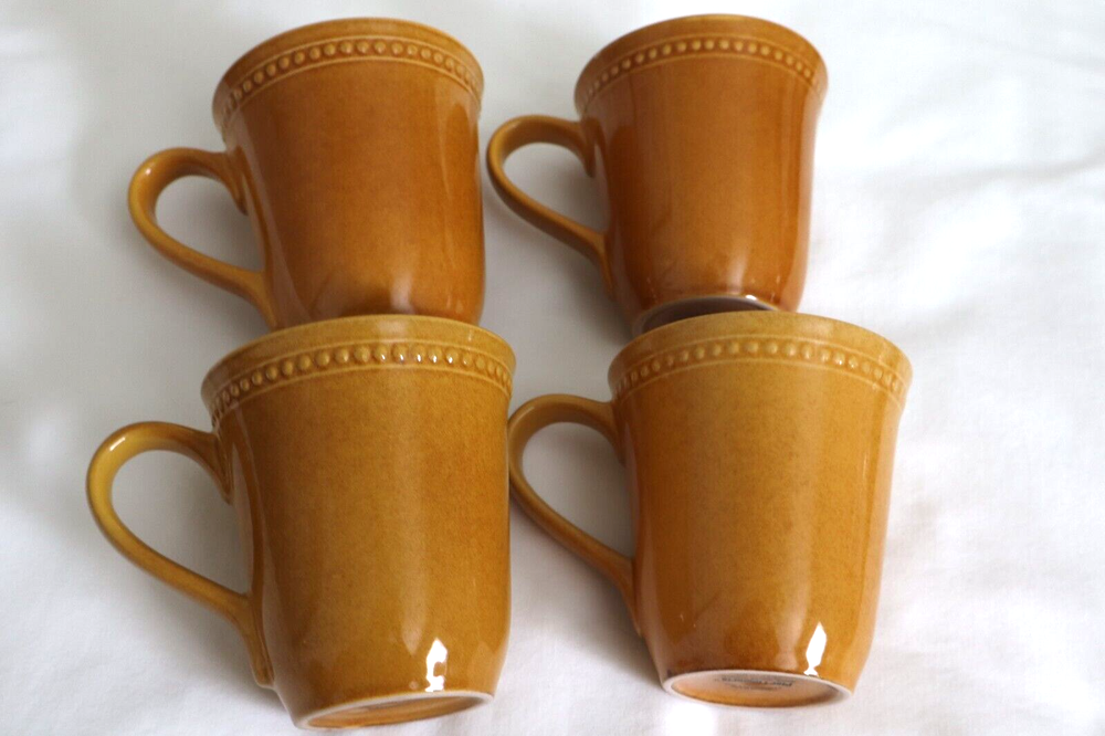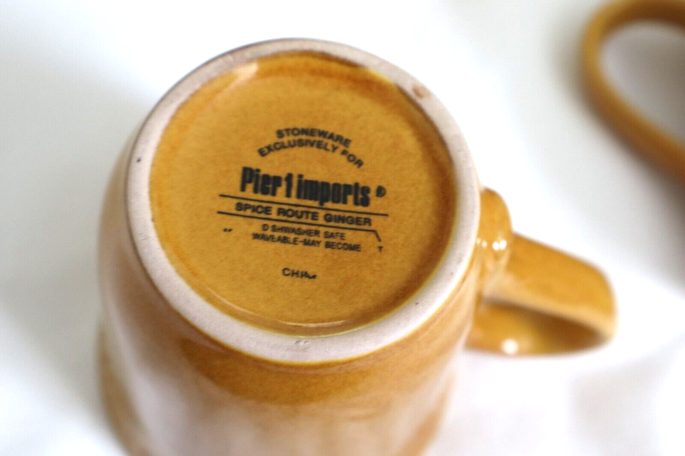 Add a touch of contemporary style to your mug collection with this four-piece set of Pier 1 Imports Exclusive Spice Route Ginger beaded stoneware mugs. These round mugs feature a glossy finish and are perfect for all occasions. Crafted in China using art pottery techniques, these mugs are microwave and dishwasher safe. Each mug has a height of 4 1/4 inches and a diameter of 4 1/8 inches. The set includes four mugs with a mustard color and a printed backstamp. Ideal for Unisex Adults, these mugs are an original production style of Pier 1 Imports. Inventory #20240903 bnrkkr 1525-30
