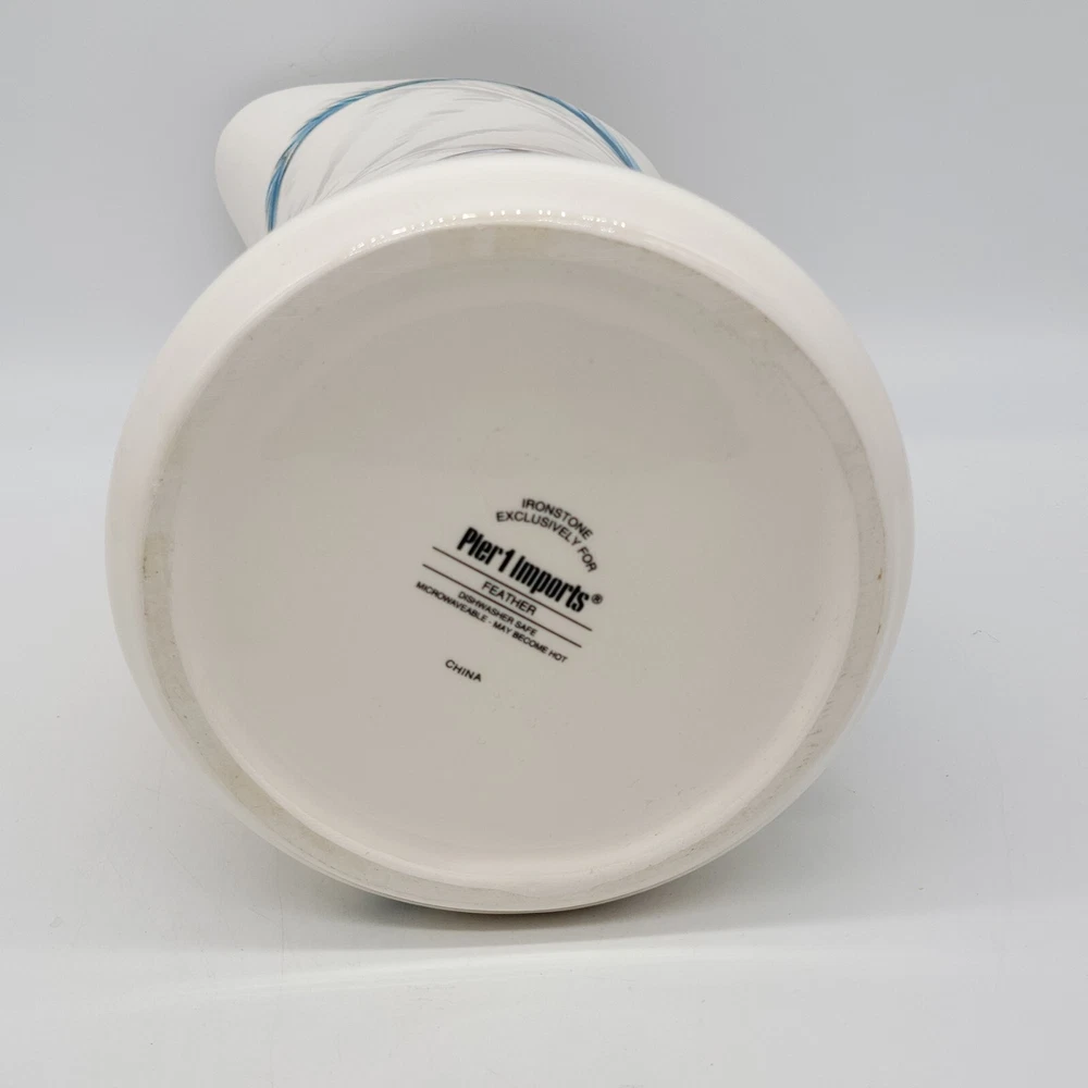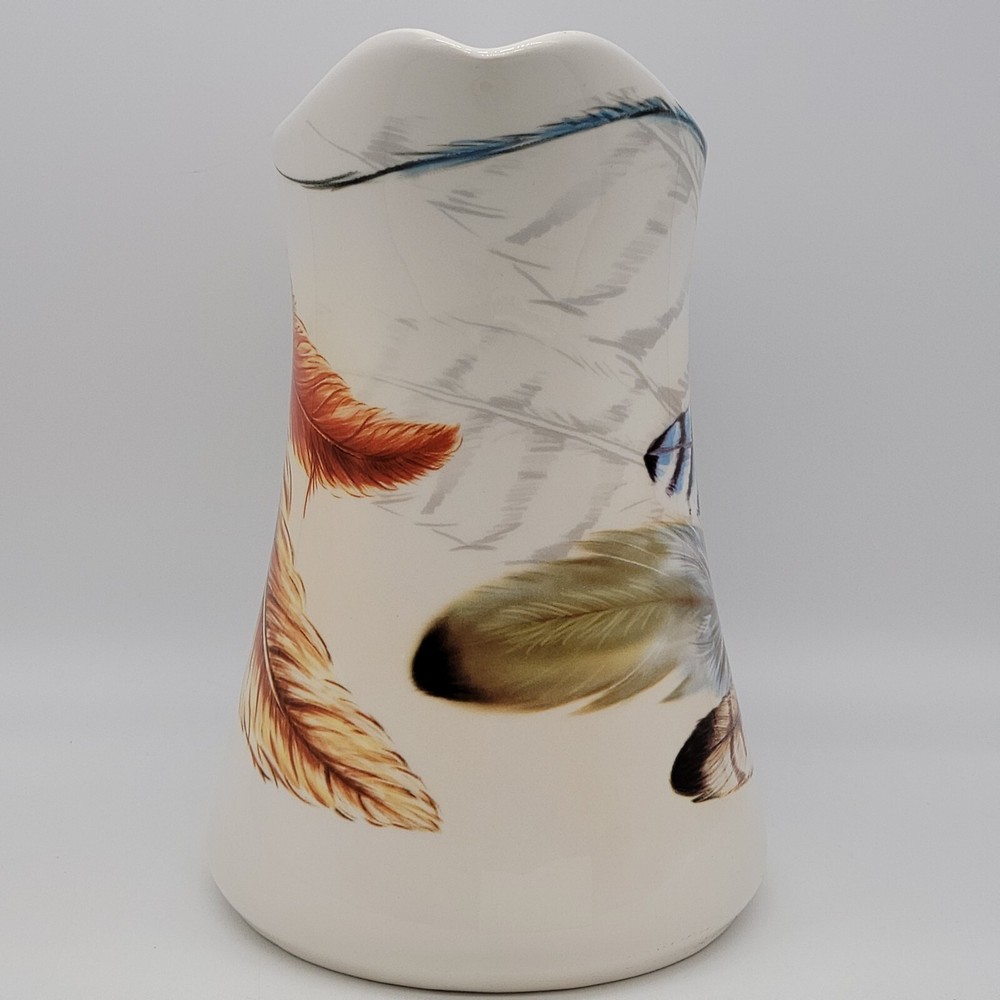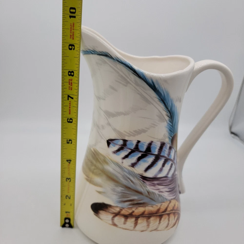 Ironstone Exclusively for Pier 1 Imports Multicolored Feather Design Water Pitcher Retired Exclusive. No chips or cracks, clean inside and out. Measures approx. 9 5/8" tall and 7 1/2" spout to handle ...