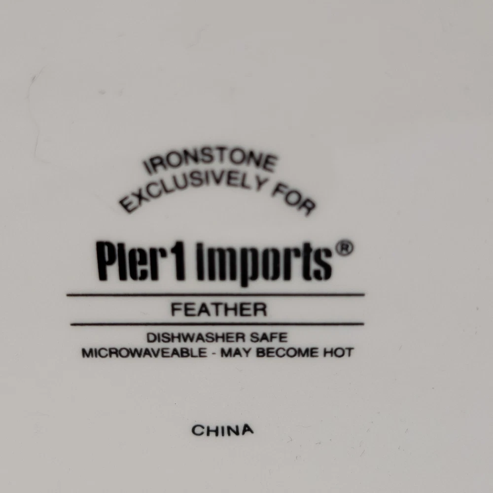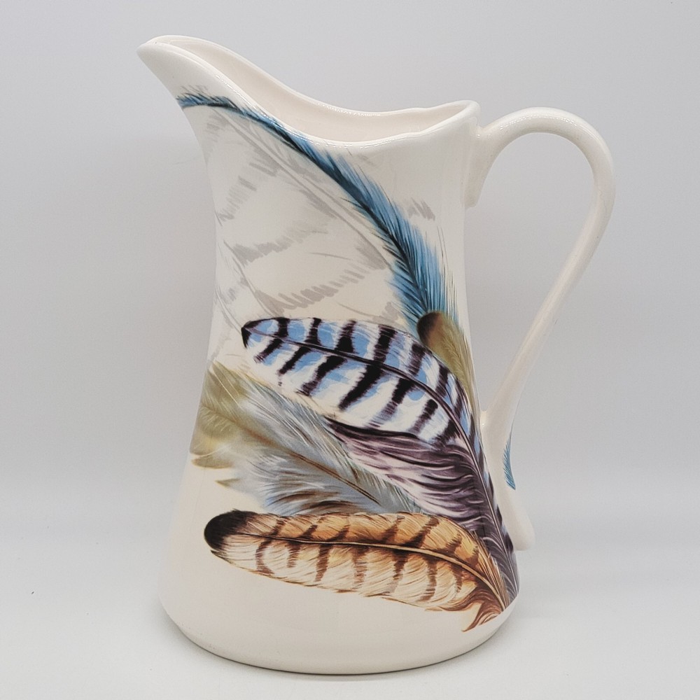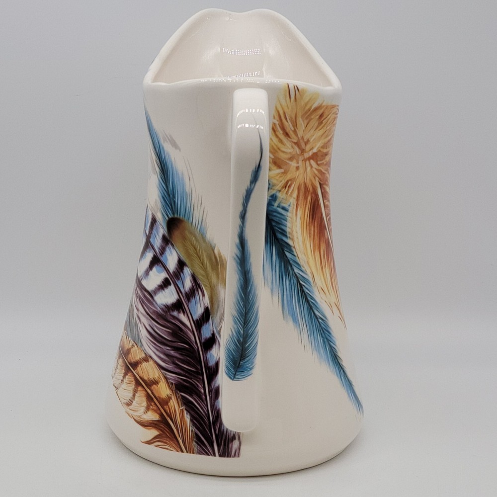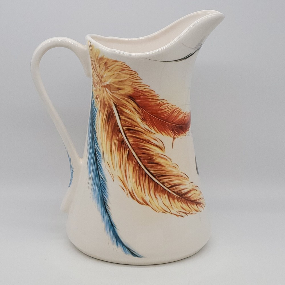 Ironstone Exclusively for Pier 1 Imports Multicolored Feather Design Water Pitcher Retired Exclusive. No chips or cracks, clean inside and out. Measures approx. 9 5/8" tall and 7 1/2" spout to handle ...