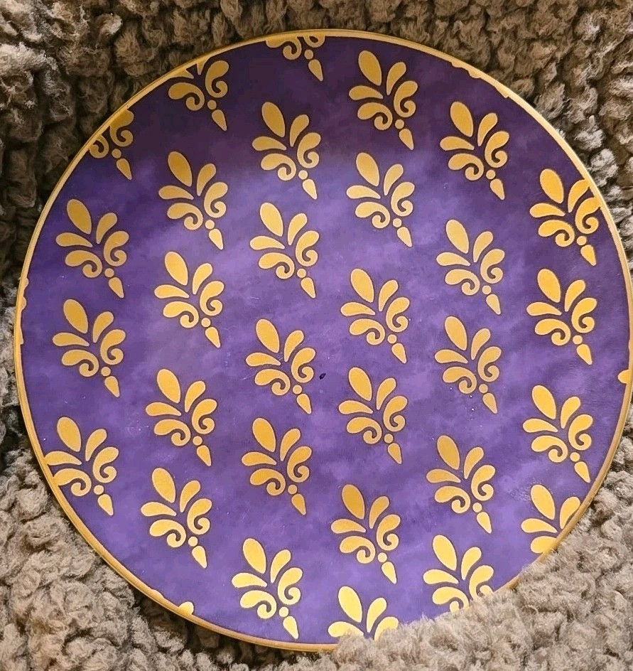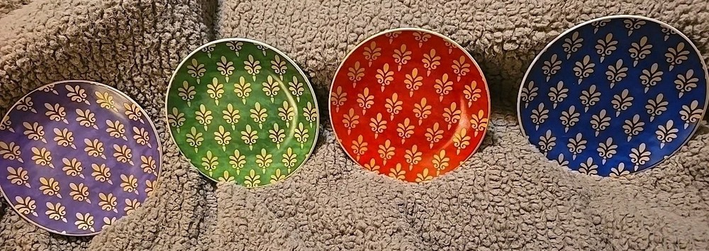 Pier 1 Imports Festive Design Porcelain 6" Appetizer Dessert Plates Set of 4 fleur-de-lis style red, purple, blue, green, vibrant color. New without box....