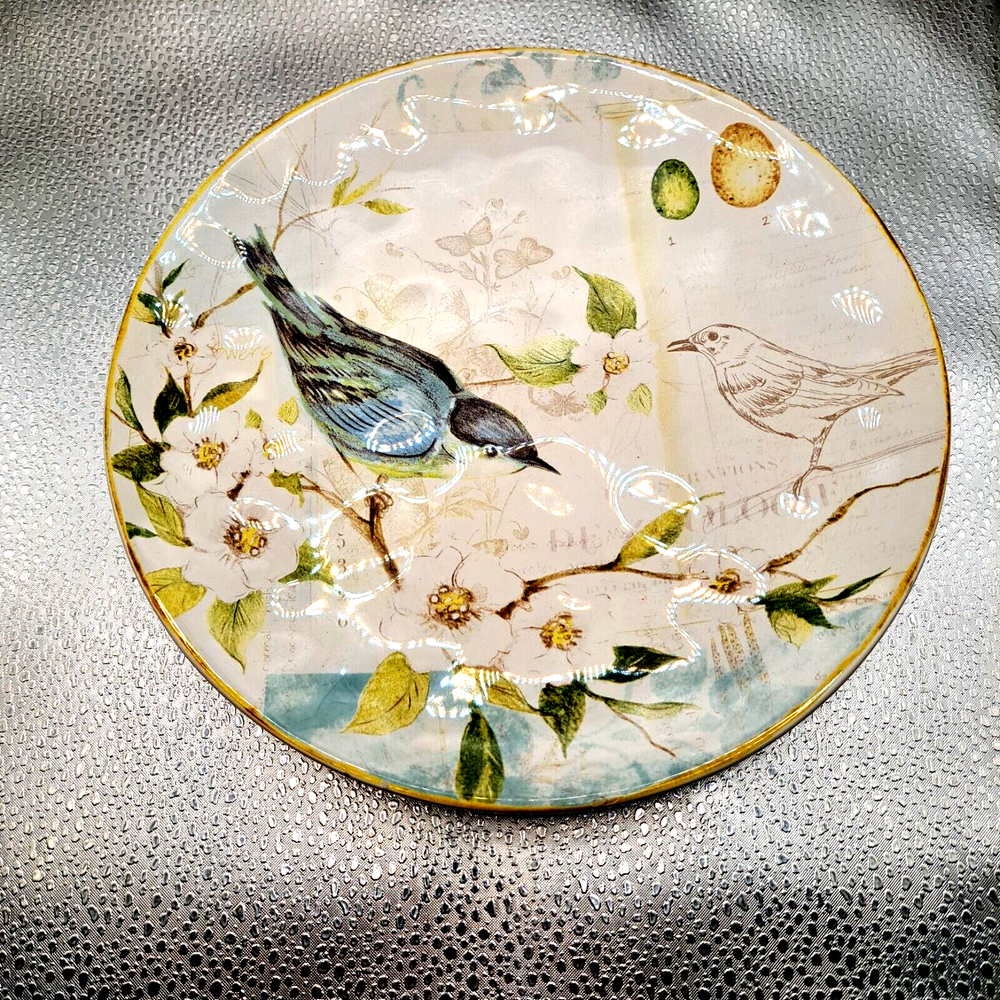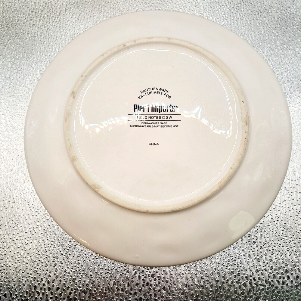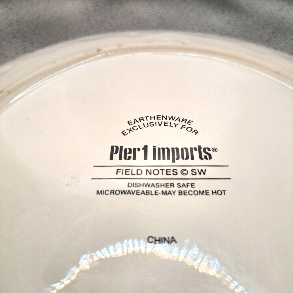 Add a touch of contemporary elegance to your dining table with this beautiful Pier 1 Imports Field Notes Bird Motif 9" Salad Plate. The round plate boasts a glossy finish and is made of high-quality earthenware material that is machine washable up to 140°F. The plate features a stunning blue color with a flower and bird theme, making it perfect for all occasions. This original art pottery plate was manufactured in China in 2016 and has a printed back stamp. It is a single item in the set and is perfect for serving salads or other dishes. The plate measures 9 inches in circumference. Make your dining experience more enjoyable with this stylish and durable plate.