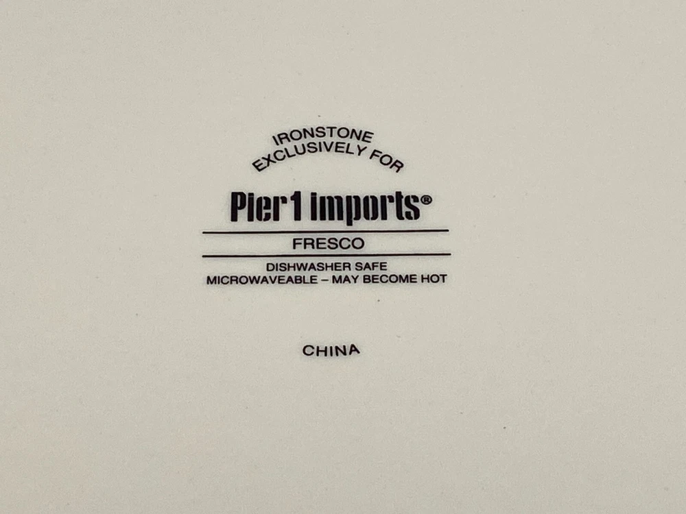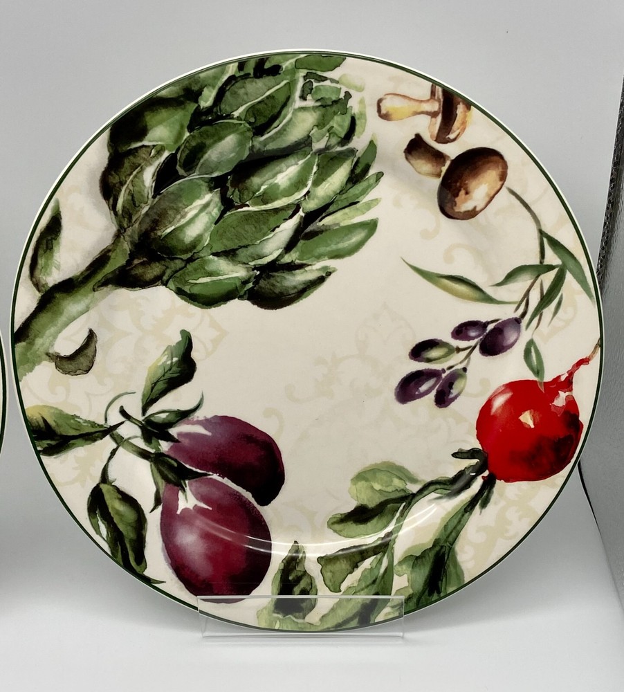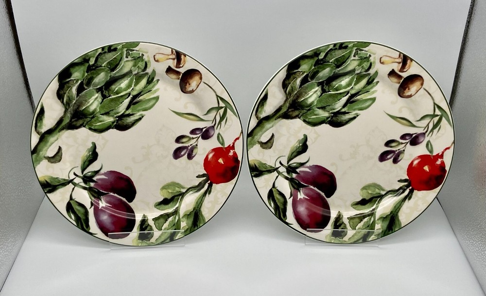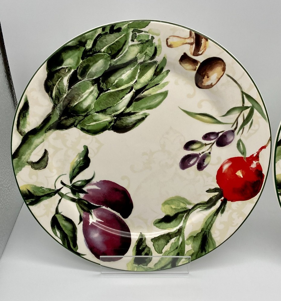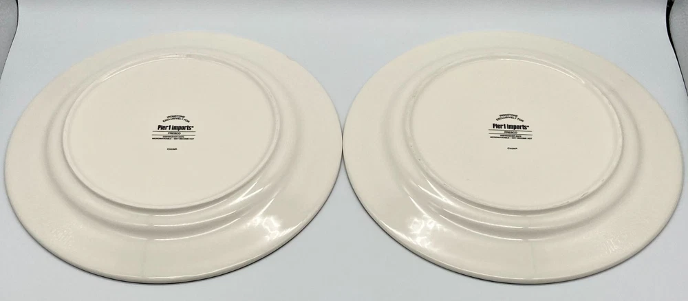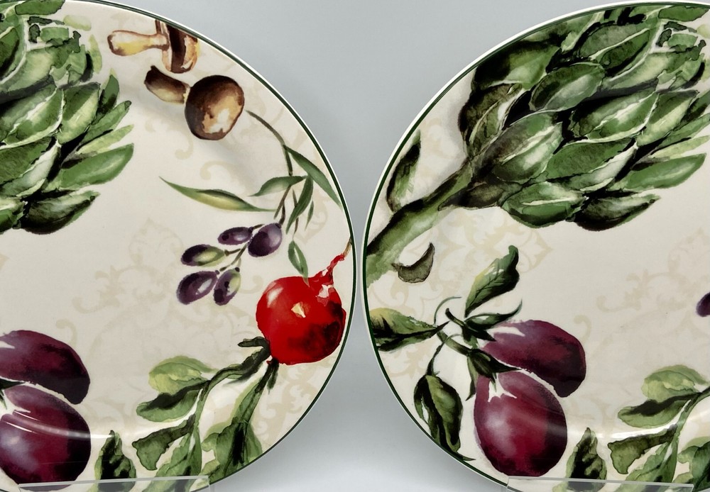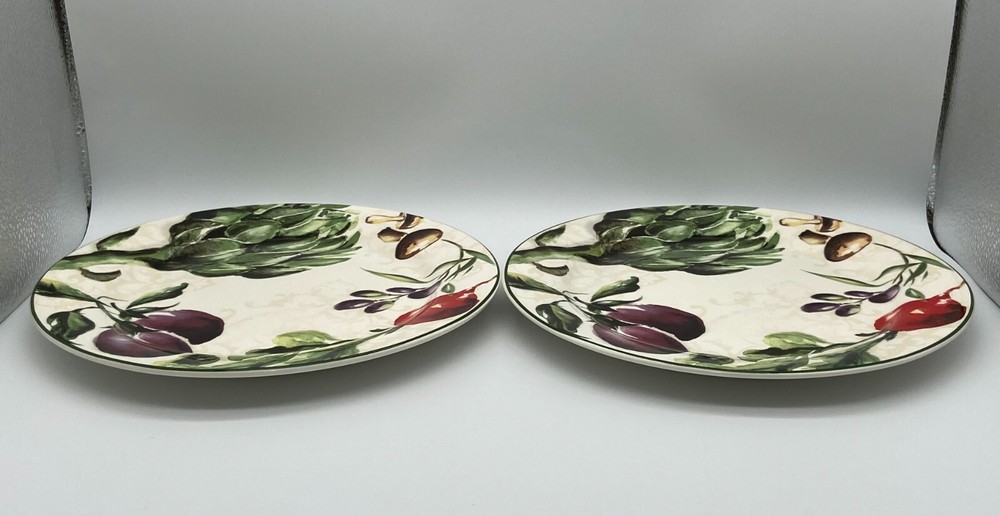 Pier 1 Imports "Fresco" set of 2 Dinner Plates. Heavy Ironstone with Mushrooms, Eggplants, Artichokes, Radish and Olives Design,. Circa 2014 to 2016. Very nice dinnerware. Measurements: 10 3/4" diamater. Weight: 3 pounds, 5 ounces. Used Condition. With very little to no utensil wear. One plate has a small chip on the back rim area, which is not seen from the top of the plate, seen in the last closeup photo. ***Please message me with any questions, review all photos and description. I do not accept returns or exchanges, all sales are final. In the event that the item arrives damaged a full refund will be issued upon my receipt of photos of the damaged item, all contents/packaging material, box and label. *** Thank you!