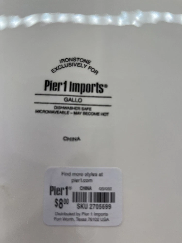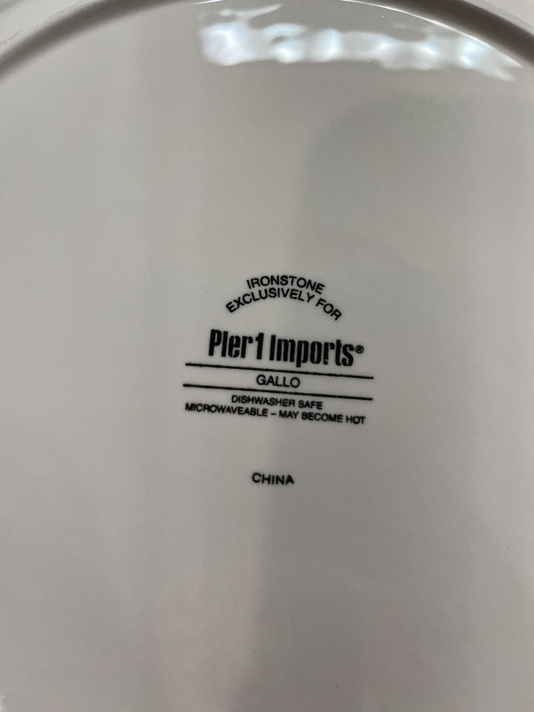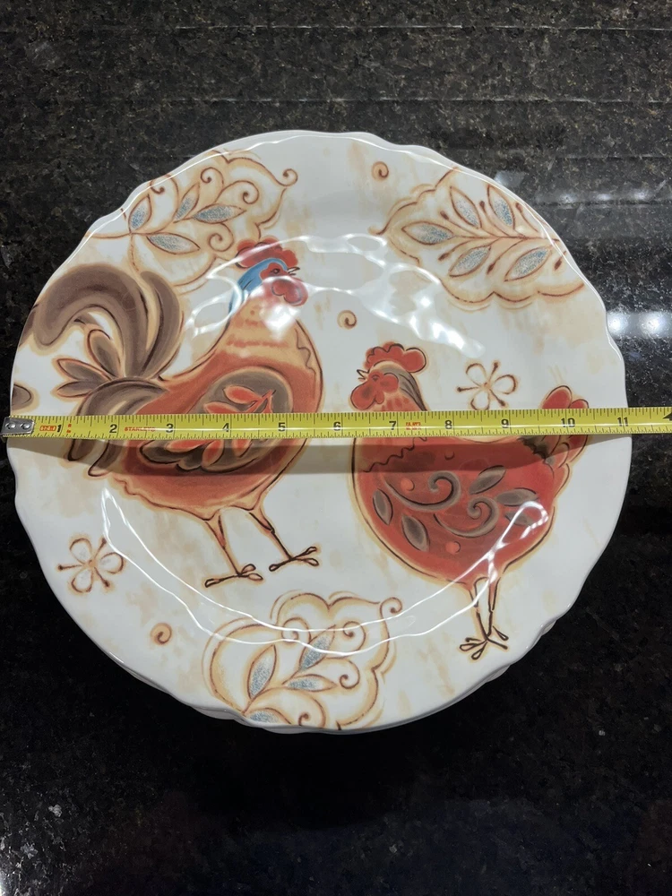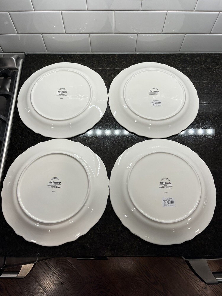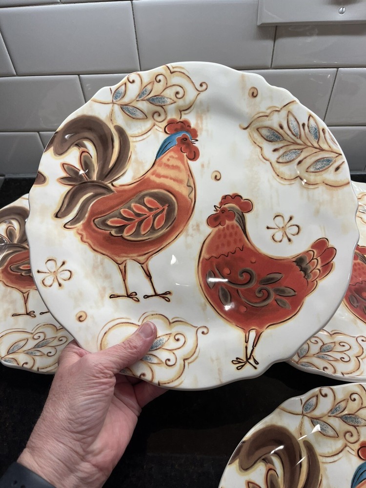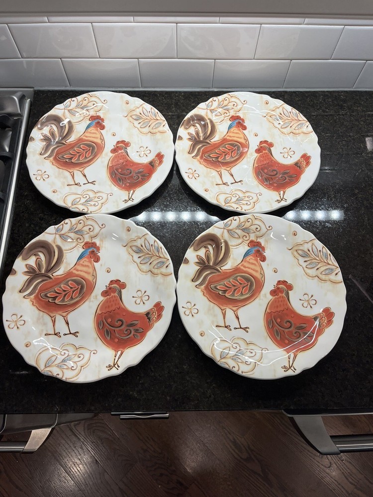 Add a touch of farmhouse charm to your dining table with this four-piece dinner plate set from Pier 1 Imports. Each 11-inch plate features a colorful pattern of roosters, perfect for all occasions. Made of durable ironstone and finished with a glossy surface, these plates are both microwave and dishwasher safe for easy cleaning. In excellent new unused condition—2 plates still have the original Pier 1 stickers on the bottom.