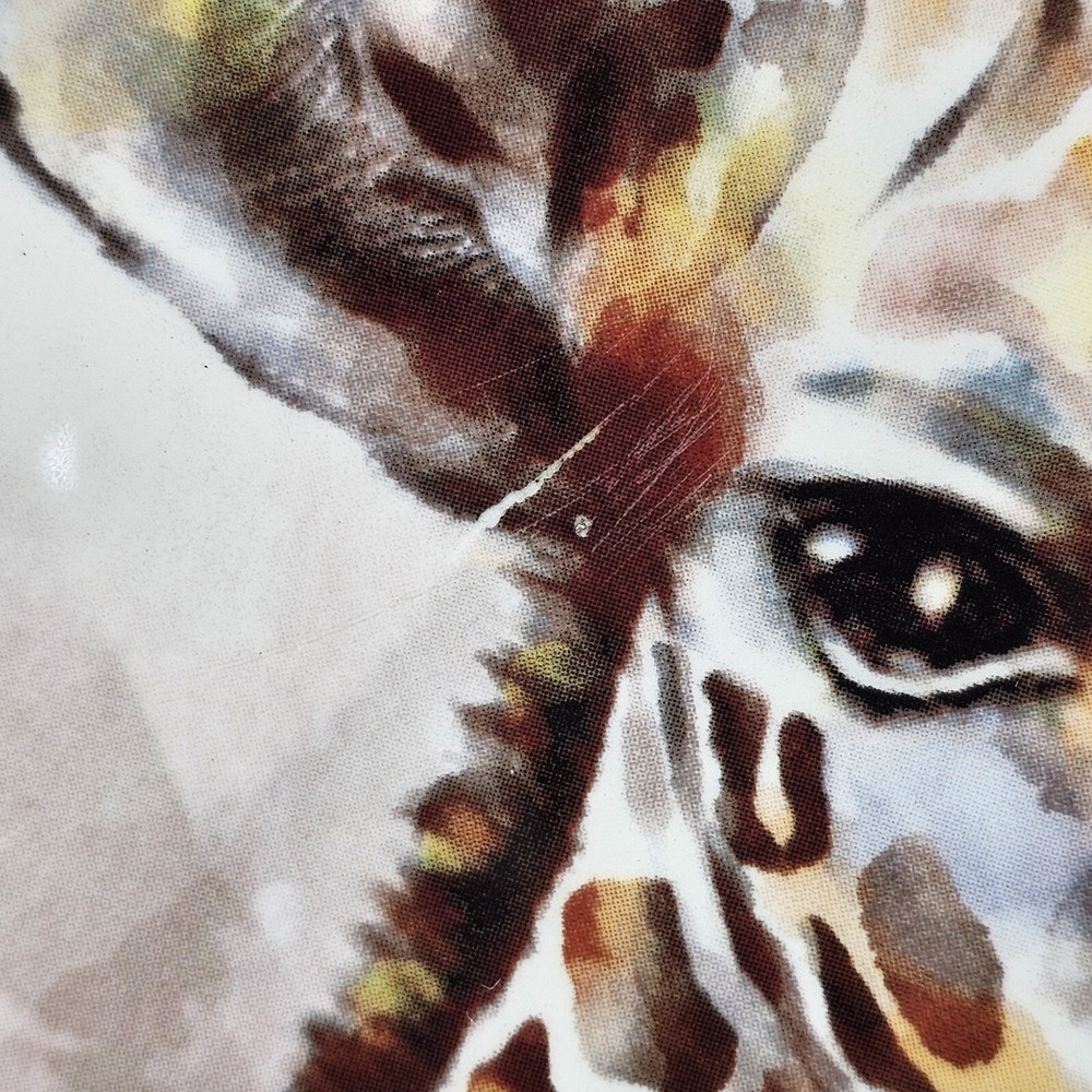 The giraffe plate in this set does have a scratch in the design. SEE PHOTOS If you have any questions about this item, please feel free to contact me. Thanks for looking!