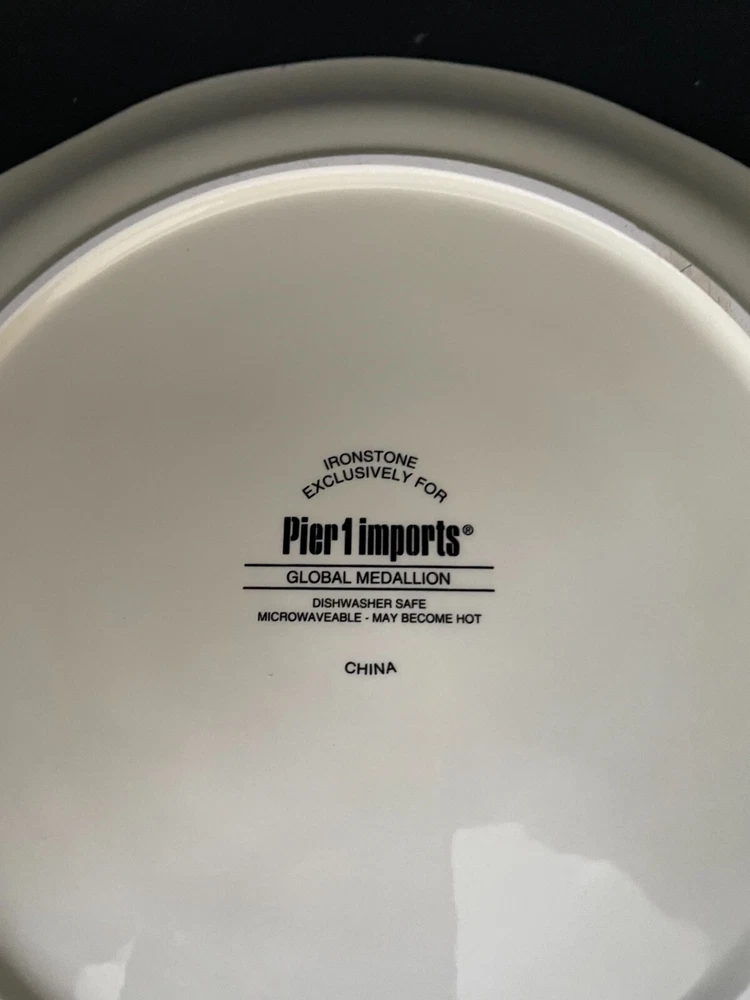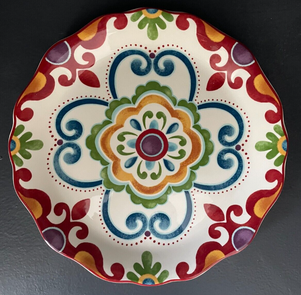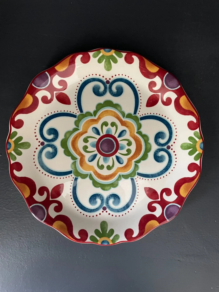 This beautiful 9" salad plate from Pier 1 Imports features a stunning Global Medallion pattern in red, blue, and green. Made of high-quality stoneware, this plate is perfect for all occasions and adds a touch of boho and contemporary style to your table setting. The round shape and 9" diameter make it ideal for serving salads, sandwiches, or snacks. The earthenware production style gives it a unique texture, and the backstamp is printed for a polished look. This set includes one salad plate, and it's part of the Global Medallion product line.