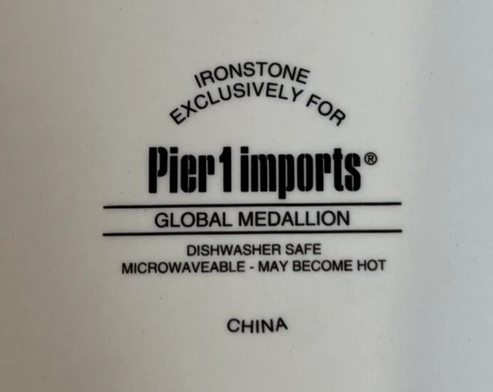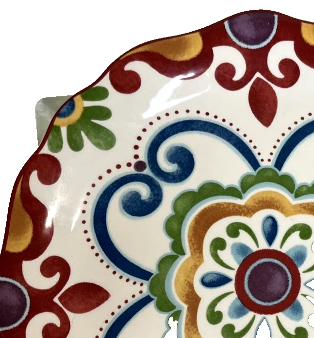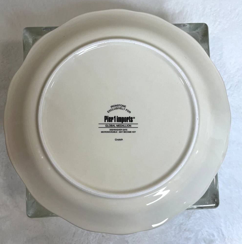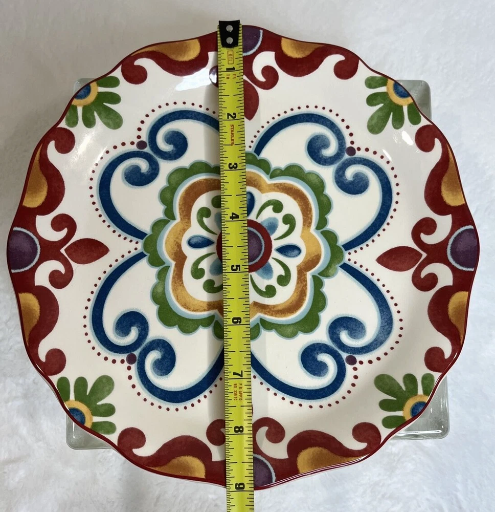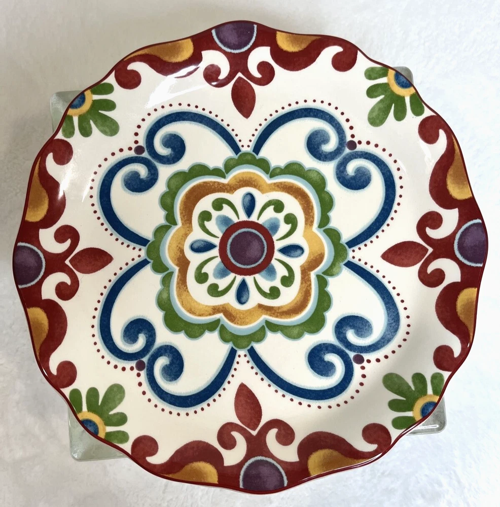 Add a touch of boho chic to your dinnerware collection with this Pier 1 Imports "Global Medallion" salad plate. The round plate has a diameter of 9 inches, making it perfect for salads or small meals. It features a colorful medallion pattern in shades of green, red, and blue, adding a pop of color to any table setting. This can be used as a replacement for a broken dish! Crafted from durable stoneware, this salad plate is perfect for all occasions and can be used in both contemporary and boho-themed settings. It comes with a printed backstamp and is part of the Global Medallion product line. Whether you're hosting a dinner party or simply adding to your collection, this plate is sure to impress. Shipped USPS Priority
