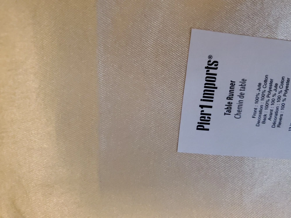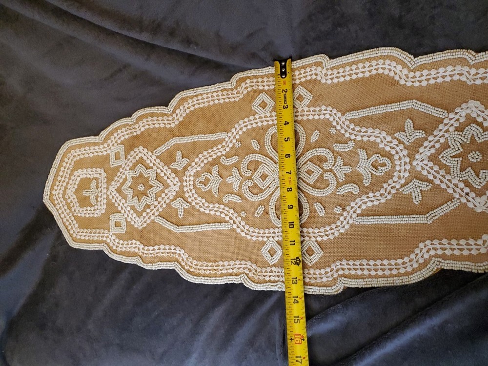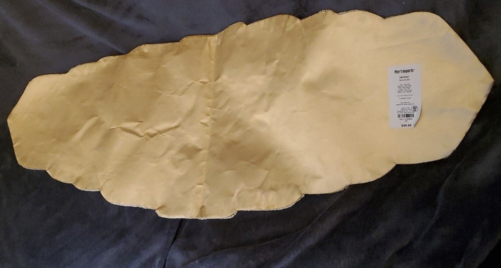 Add a touch of elegance to your dining table with this beautiful table runner from Pier 1. The oblong shape and geometric pattern in white and gold make it a perfect addition to any multipurpose occasion. Made of 100% polyester beaded material, this table runner is both stylish and durable. It is recommended to hand wash only to maintain its quality. Measuring less than 40 inches in length and 10-15 inches in width, this table runner is perfect for any table setting. . Most of the items I sell are used items. I don't take the time to deep clean them. I leave that up to the buyer because in some cases this detracts from the value. Please ask all questions before buying. Thanks! Item#1711