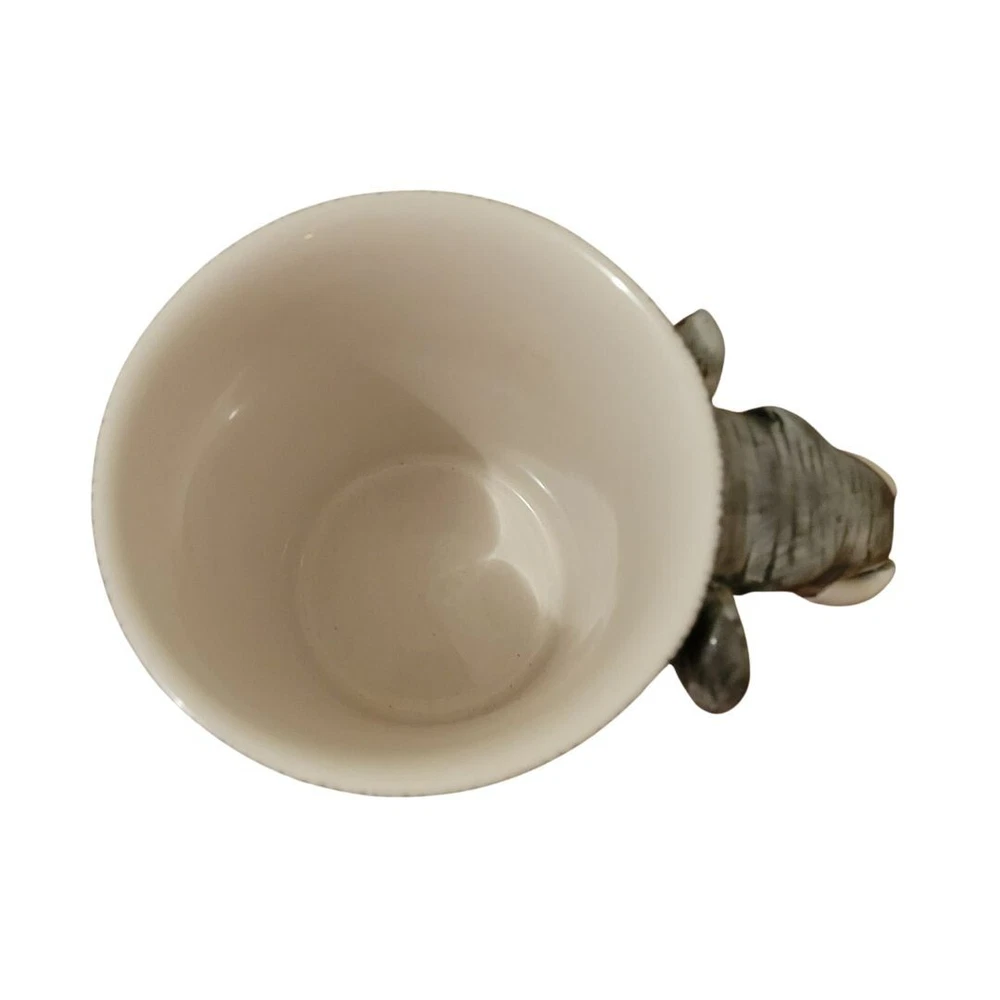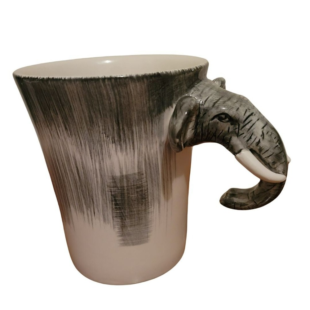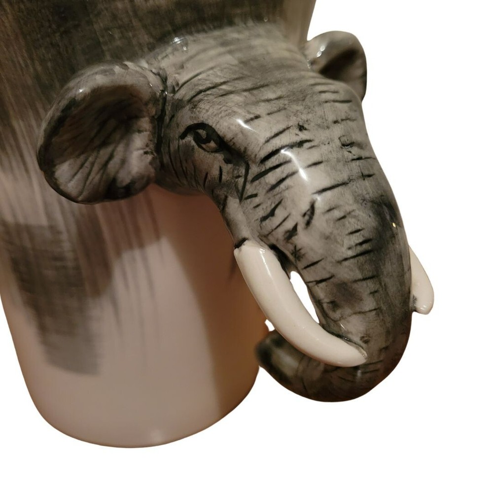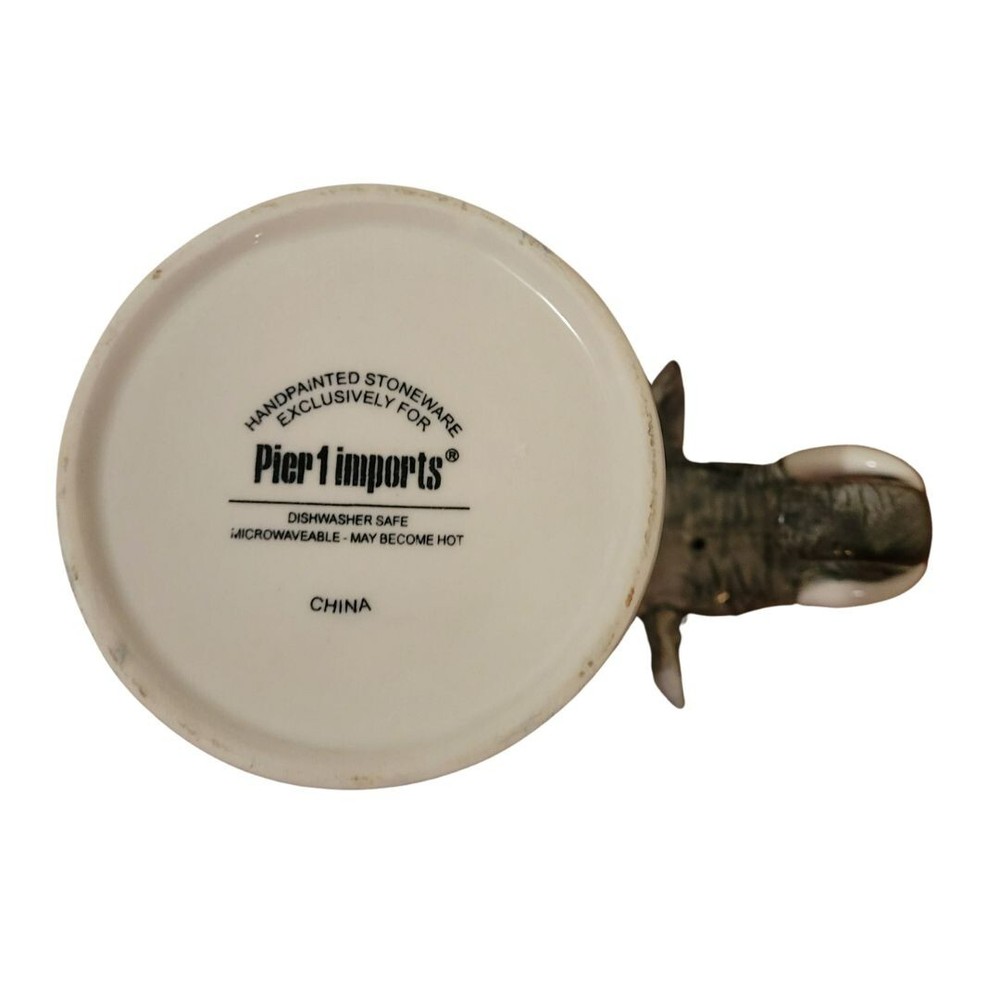 One Pier 1 Stoneware gray hand painted mug with a 3D elephant head for a handle. The handle also features the tusks, elephant ears, and trunk. Height is almost 5" and width with handle is about 6". Based diameter is 3". Great condition. Nice & glossy. No chips or cracks.