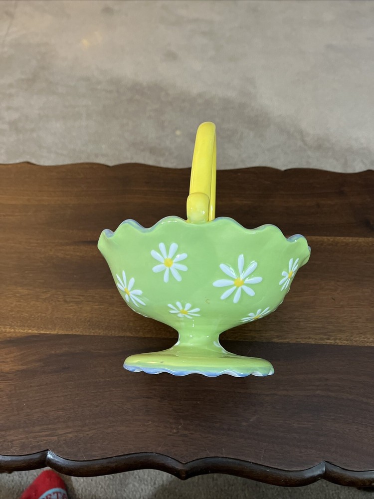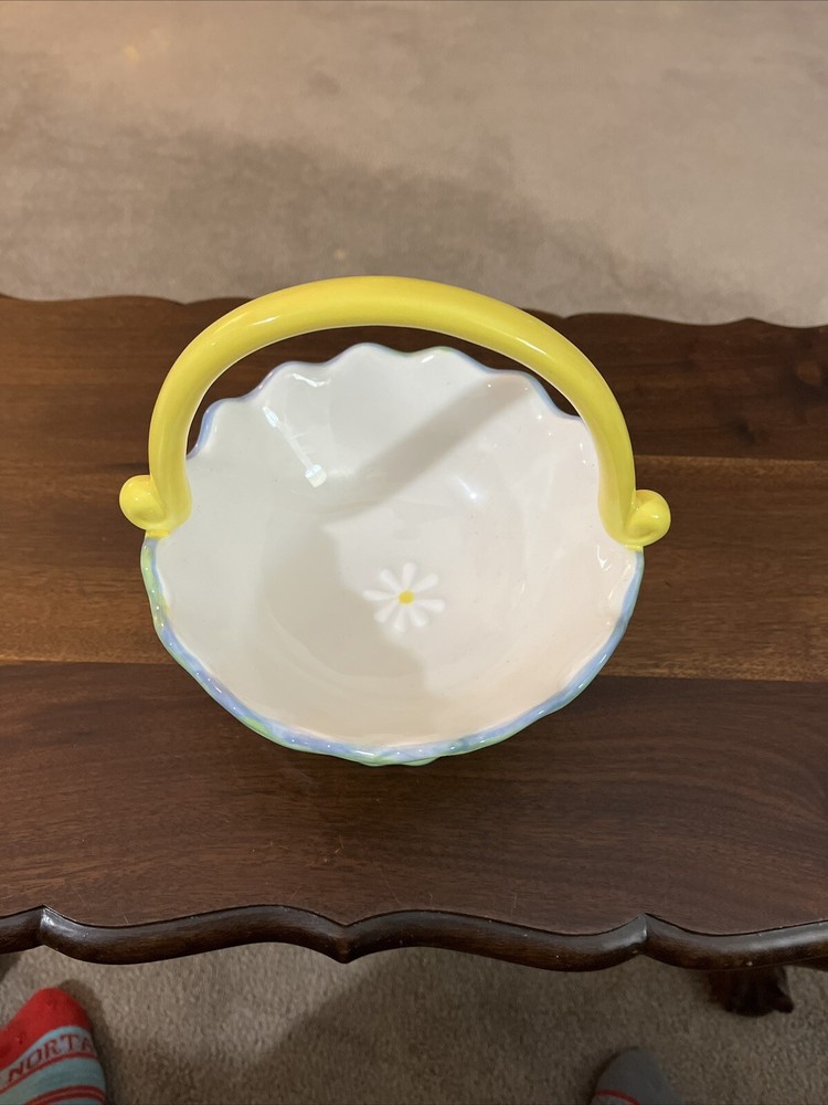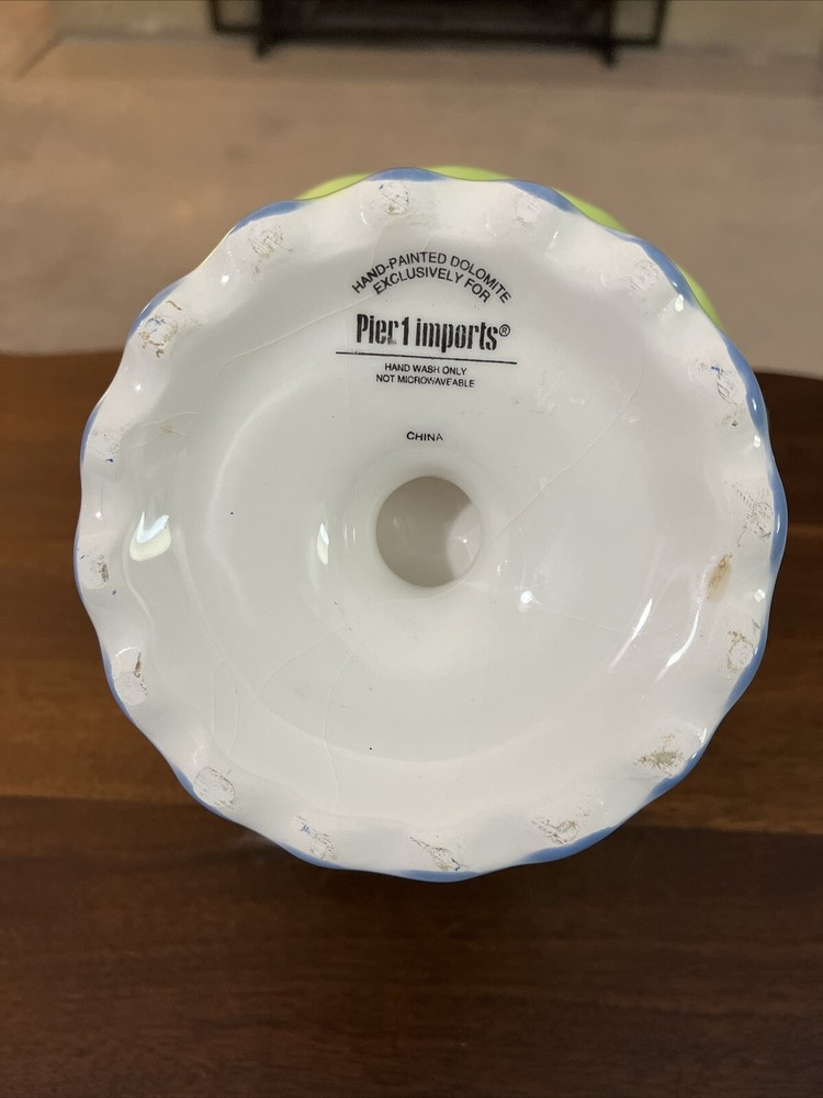 Add a touch of elegance to your table setting with this stunning green ceramic basket from Pier 1 Imports. The basket features a scalloped rim and base and is footed for stability. The beautiful daisies add a touch of spring to any occasion and the Italian Summer pattern is perfect for all occasions. This handmade basket is perfect for serving or displaying your favorite fruits, vegetables, or desserts. Its 9” height and 7” width make it an ideal size for any table. The backstamp is printed and the vintage is no. This item includes a bowl and is part of the Pier 1 Imports product line.