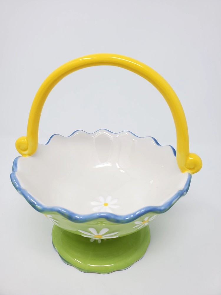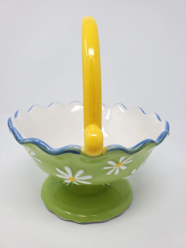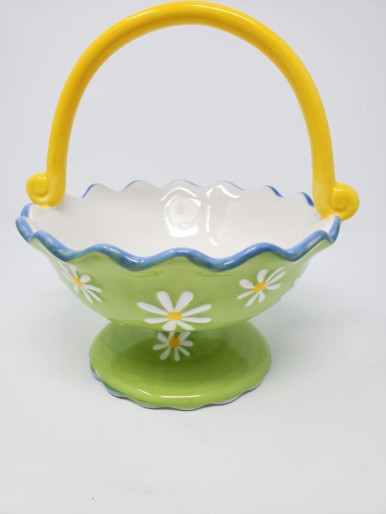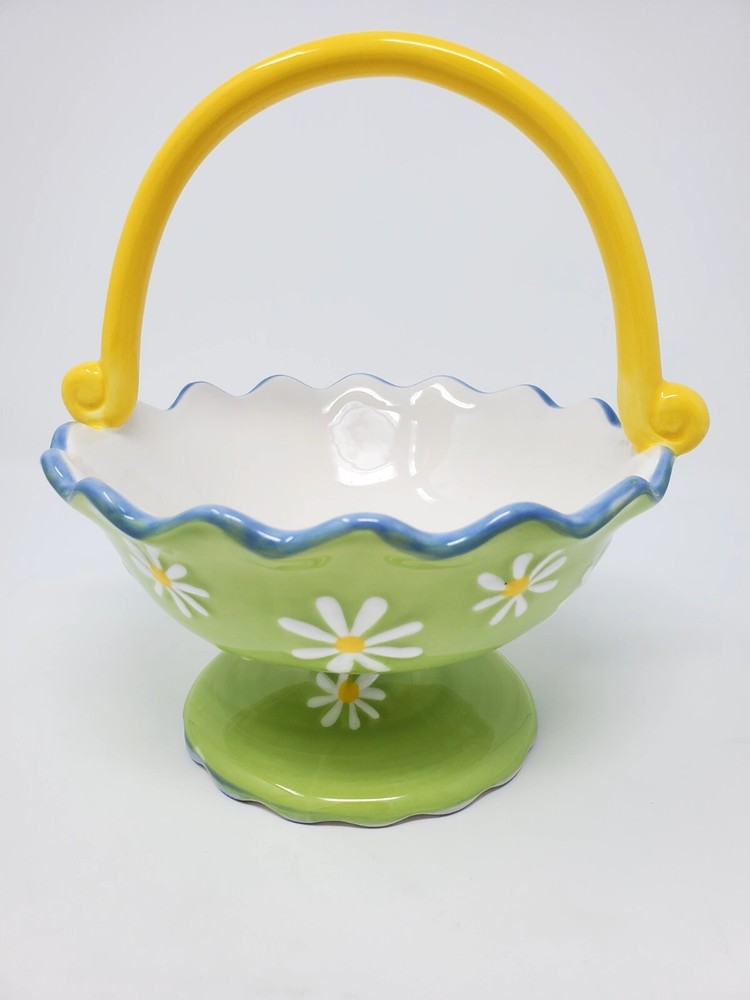 This beautiful ceramic basket from Pier 1 Imports is perfect for any occasion. With a lovely Italian Summer pattern and a green color, it features daisies on a footed base with a scalloped rim. The bowl set includes a basket, making it a versatile addition to your home decor. It is a handcrafted product, with a printed backstamp, and is not vintage. The basket is made of ceramic material, and is part of the Pier 1 Imports product line. Whether you're using it for decorative purposes or for serving food, this basket is sure to impress your guests.