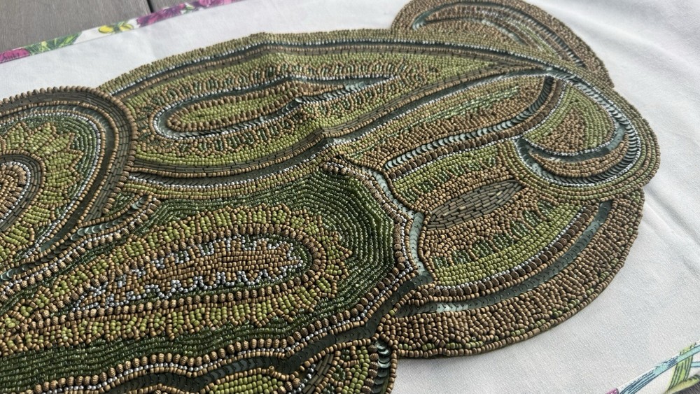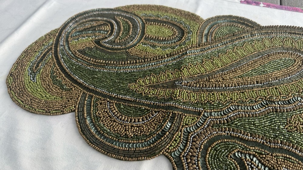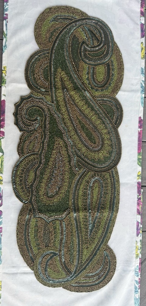 Pier 1 Imports Green Paisley Beaded/Sequin Table Runner Tropical 13” X 34”. Condition is New with defects. This Green Paisley Table Runner is magnificent for your every day or Autumn decor. The multi shades of green and gold will look perfect on any vanity, table or buffet setting! You can see that the runner is beaded and sequin to perfection with the quality we know Pier 1 prides itself on. It is 100% Polyester so be sure to spot clean only! The runner is approximately 13” wide x 34” long with a beautiful satin green backing. THE DEFECT: On back of runner as seen in photo, there is a small water stain from when purchased. If purchased, I will ship within 3 days of payment BUT usually same day as payment clears. Thank you for stopping and hopefully shopping! Enjoy!