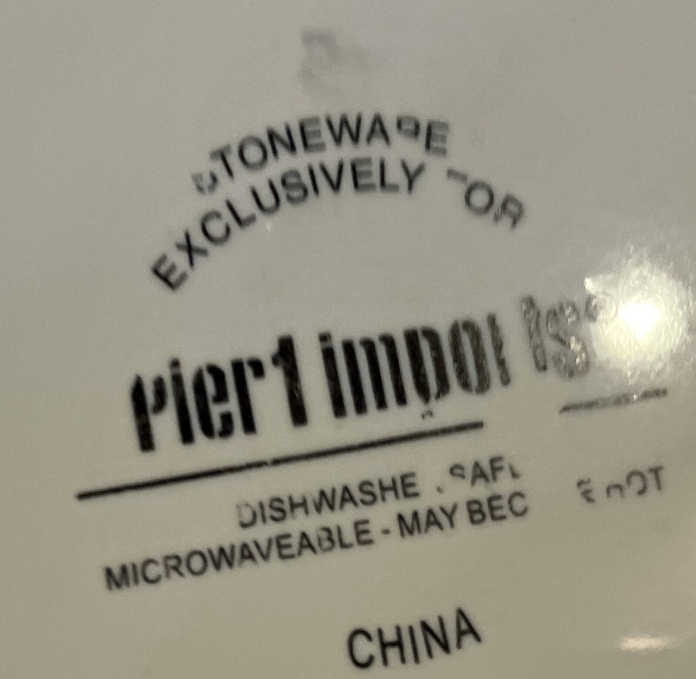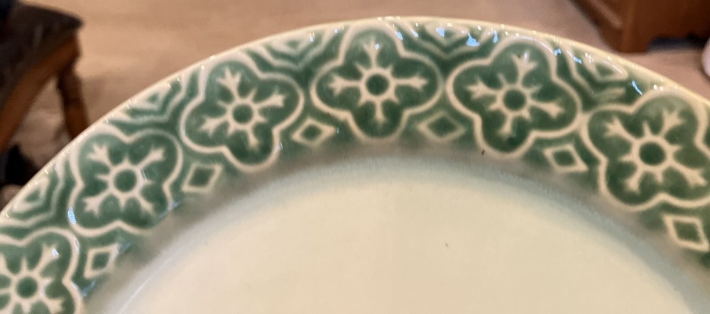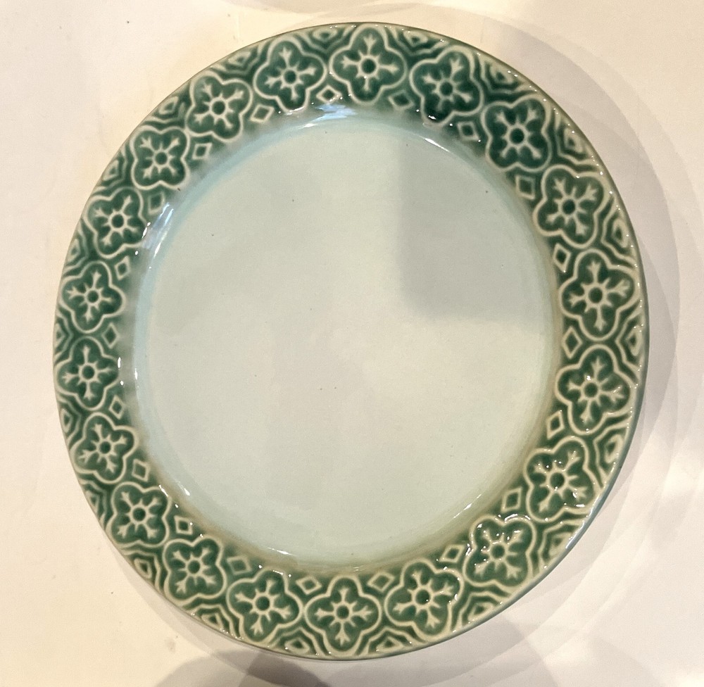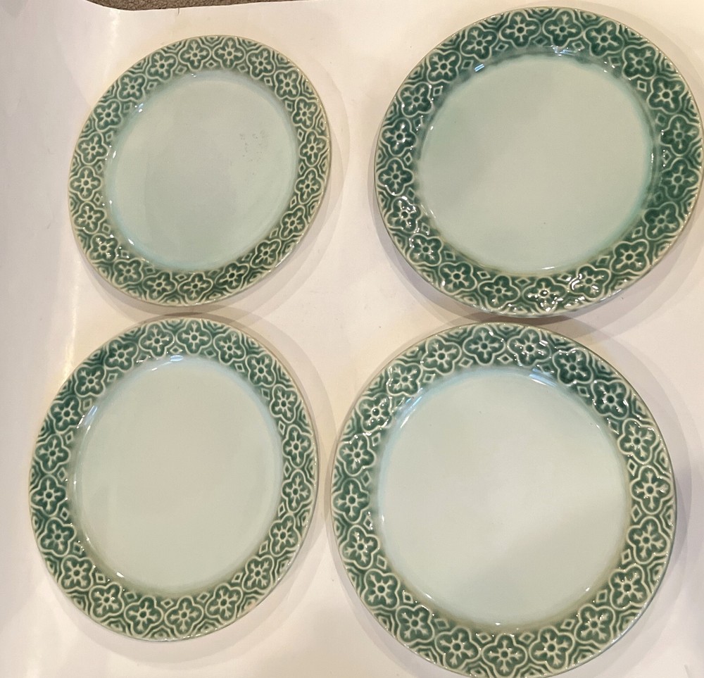 Set of four (4) Pier 1 Imports green scroll stoneware 9.25" luncheon or salad plates. The green design is raised up a little off the plates. Three of the four plates have some missing letters pertaining to manufacture on the back of the plates. They are in good condition with no chips or cracks. Thanks for your interest in my listing. Please feel free to ask any questions. Shipping is via Shuipping is via USPS Ground Advantage. PLEASE VISIT MY EBAY STORE FOR MORE VINTAGE AND UNIQUE ITEMS.