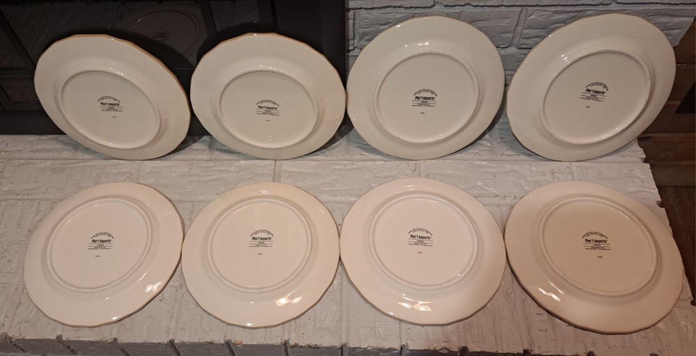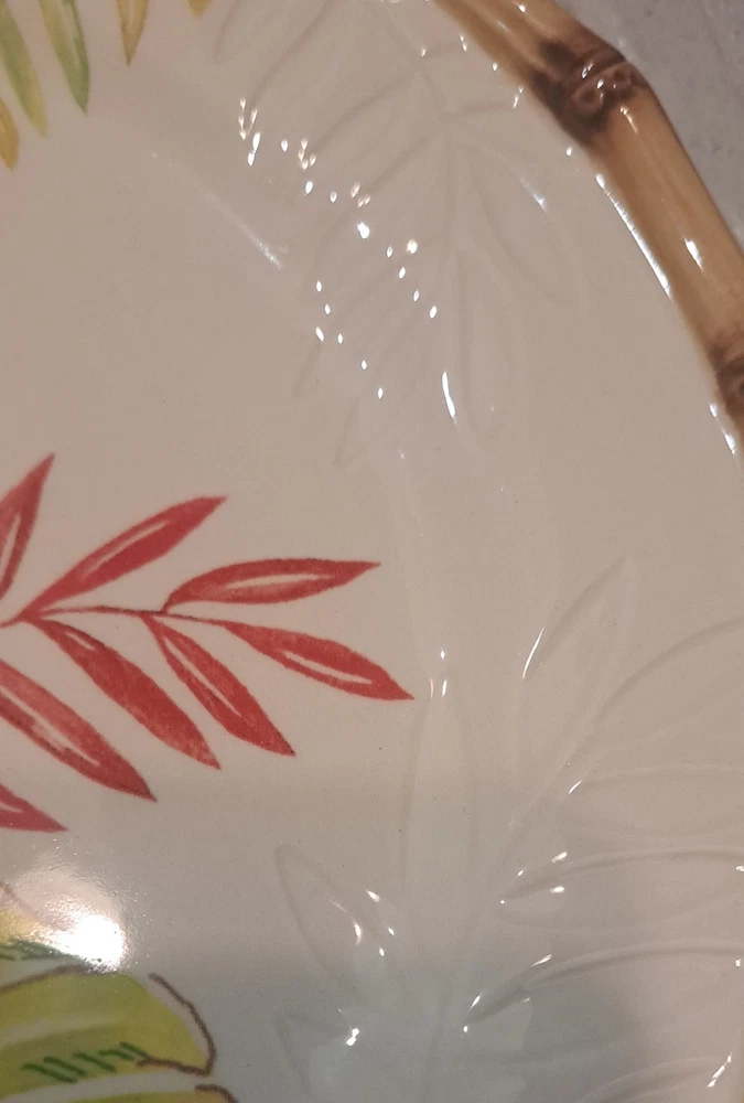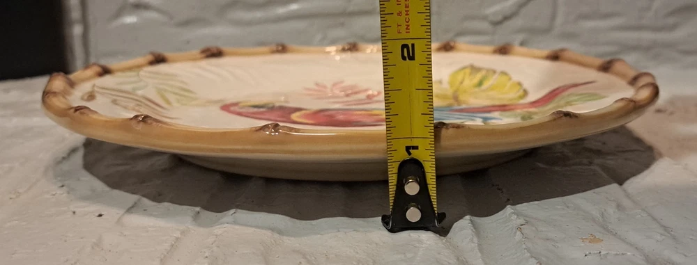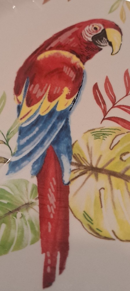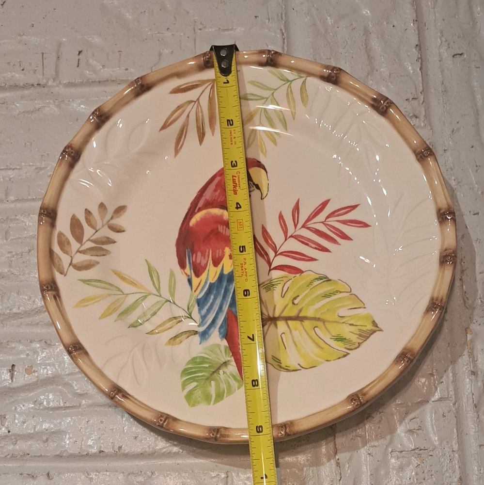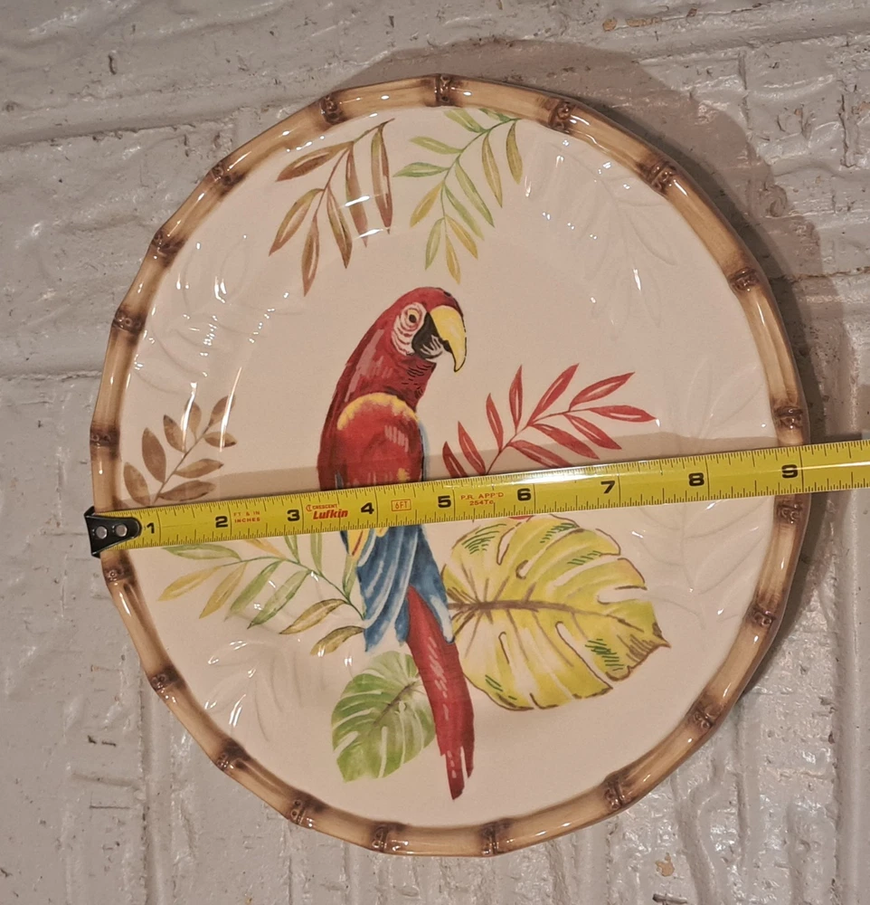 Elevate your dining experience with the Pier 1 Imports Hand Painted Cabana 9" Salad Plates. Each plate showcases a vibrant Macaw Bird & Bamboo design, bringing an exotic touch to your table. Crafted from high-quality ceramic, these round plates are both dishwasher and microwave safe, ensuring both durability and convenience. The multicolor palette and shiny finish make for a striking presentation, perfect for any dinner party or casual meal. With a set of eight, you can effortlessly serve a group of guests, making every bite as visually appealing as it is delicious. Bring the tropics to your kitchen with these eye-catching salad plates.