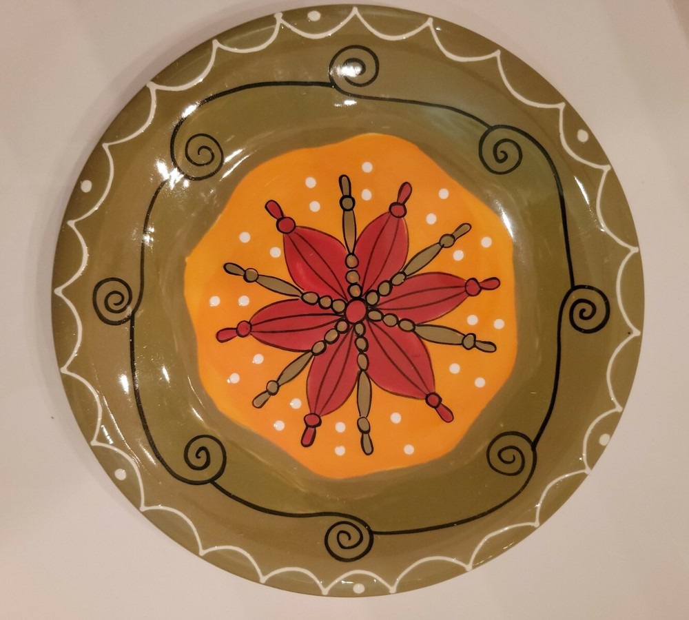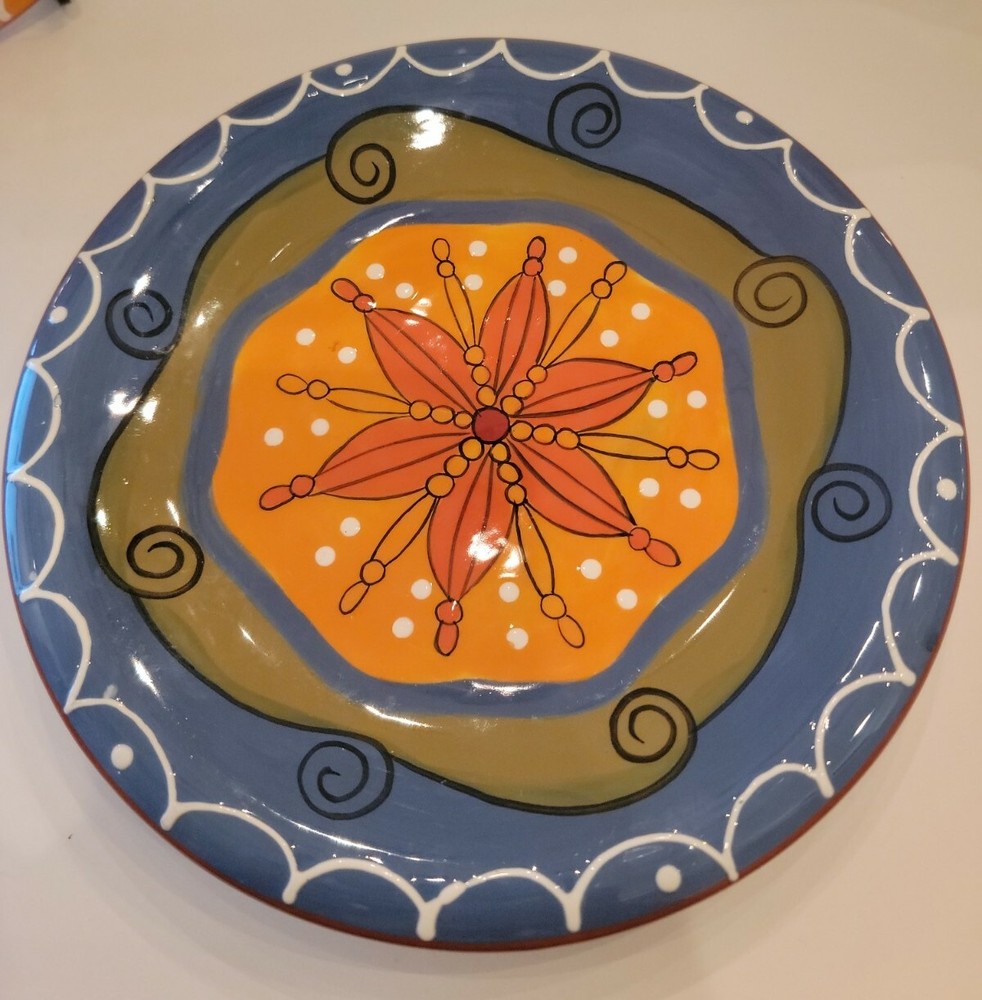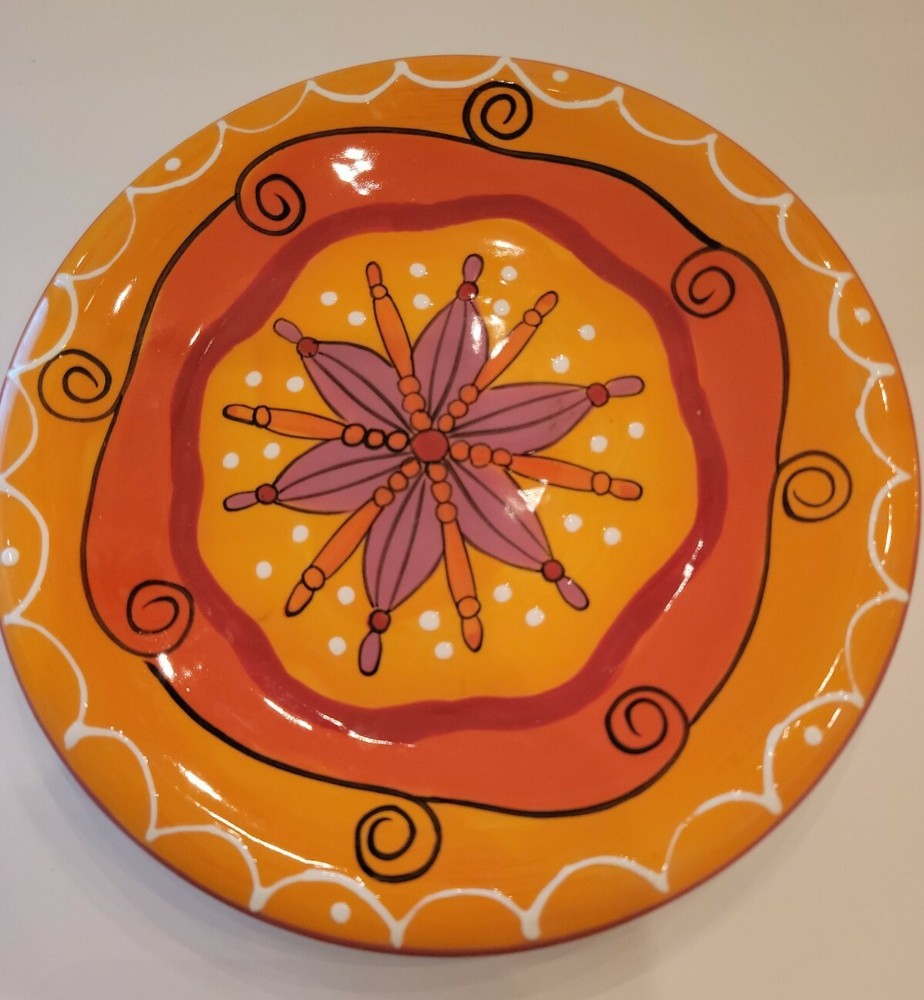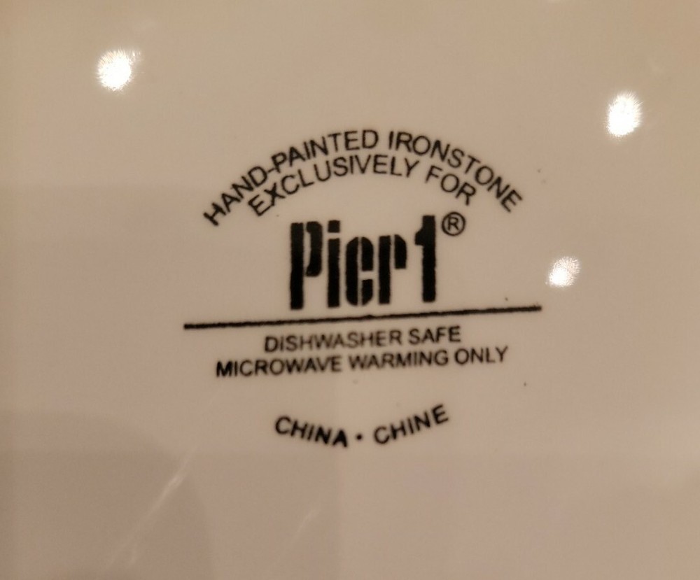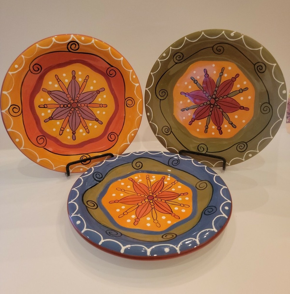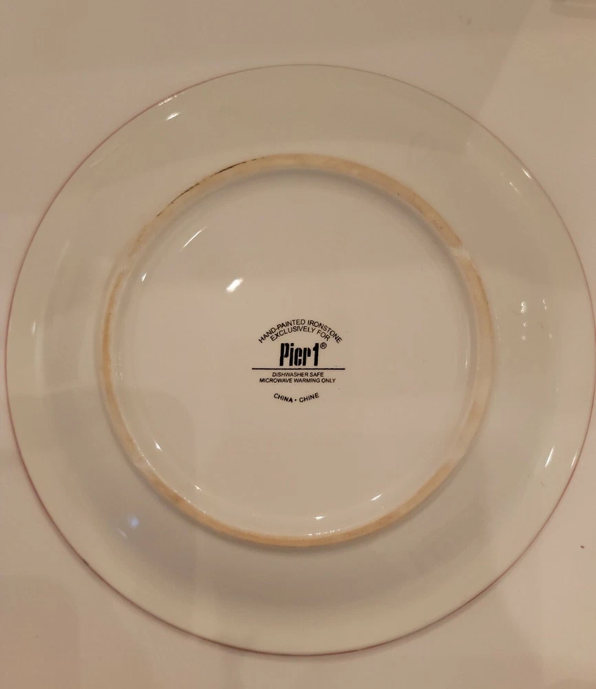 Pier 1 Imports Hand Painted Ironstone Salad Plates 8” Set of 3. These colorful 8" plates are dishwasher safe and good for reheating in the microwave. And they come with plate hangers if you prefer to brighten the walls and enjoy seeing them every day. Sturdy dishes and with charming designs and cheerful colors. Shipping by USPS Mail services or alternate shipping services.