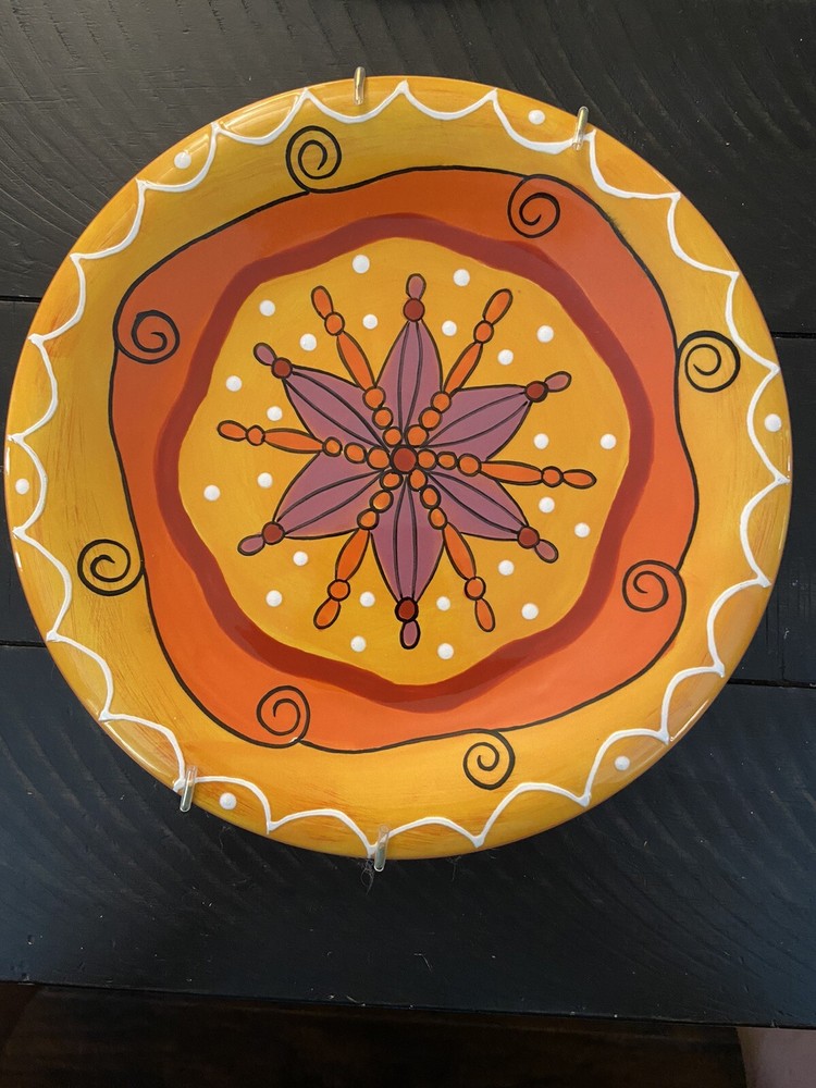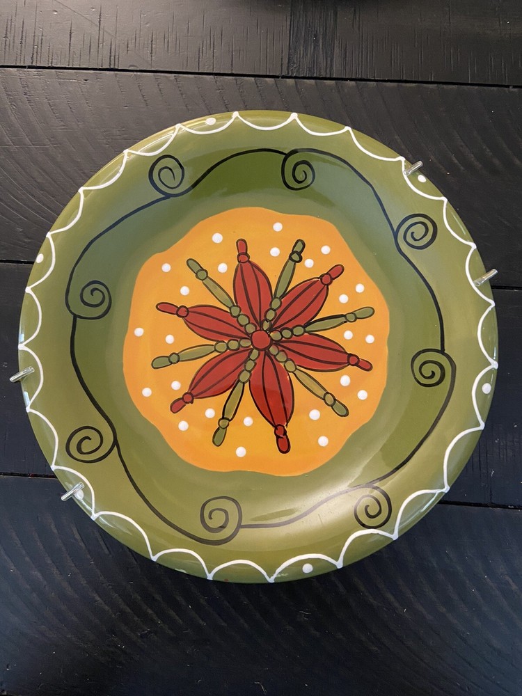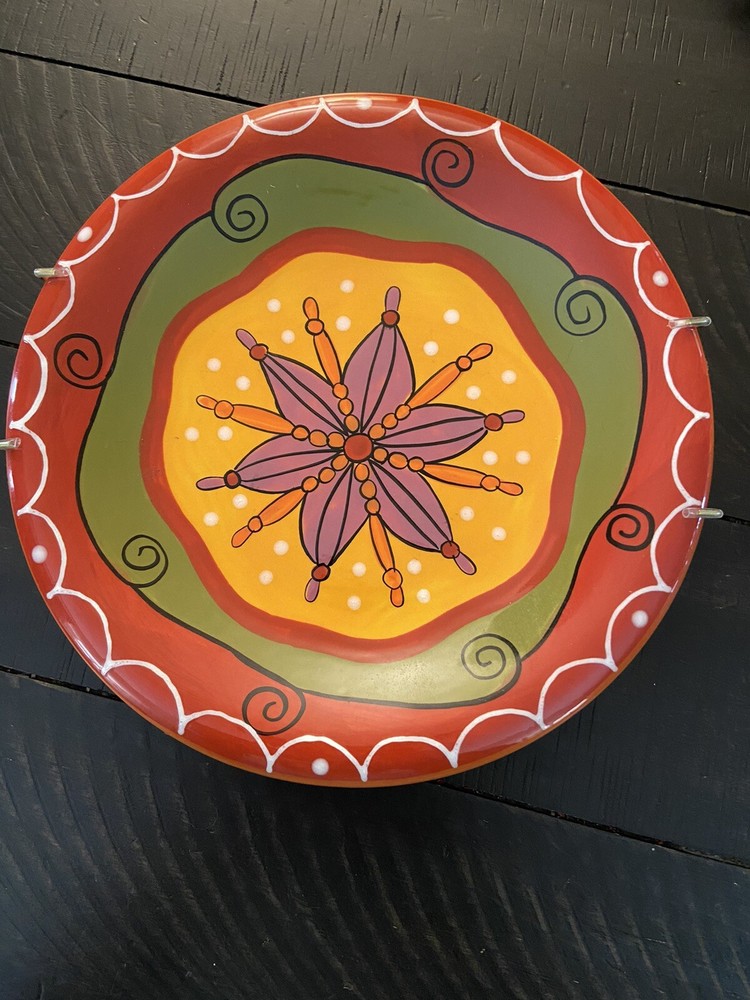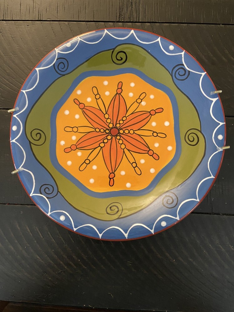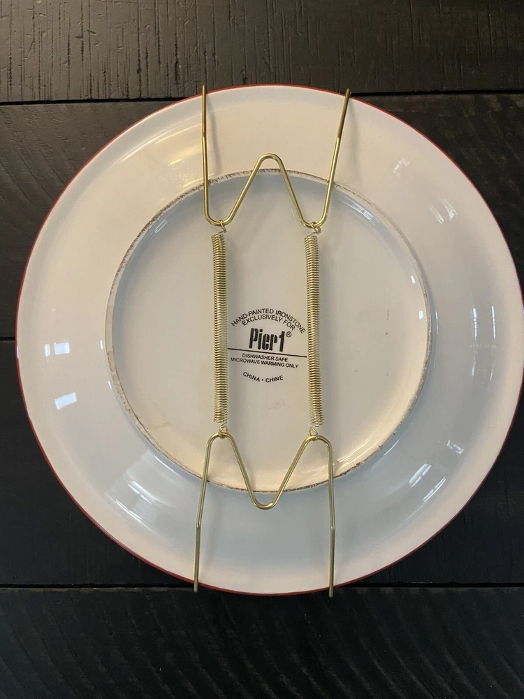 This set of four hand-painted, multi-colored floral Pier 1 Imports salad plates is a beautiful addition to any dinnerware collection. With an 8-inch diameter, these round stoneware plates are perfect for all occasions and feature a glossy finish. The set includes hangers for easy display. Crafted in China, these contemporary original plates are part of the Pier 1 product line and feature a printed backstamp. The plates weigh 5.1 pounds and are suitable for adults. The antique-inspired Art Deco style is complemented by the flower pattern, making them a lovely choice for any table setting or wall decor. Includes plate hangers.