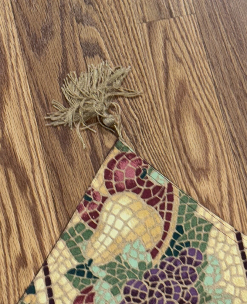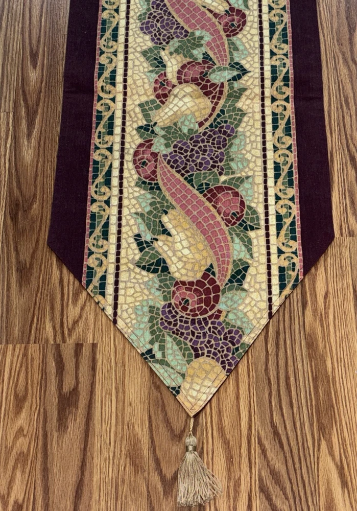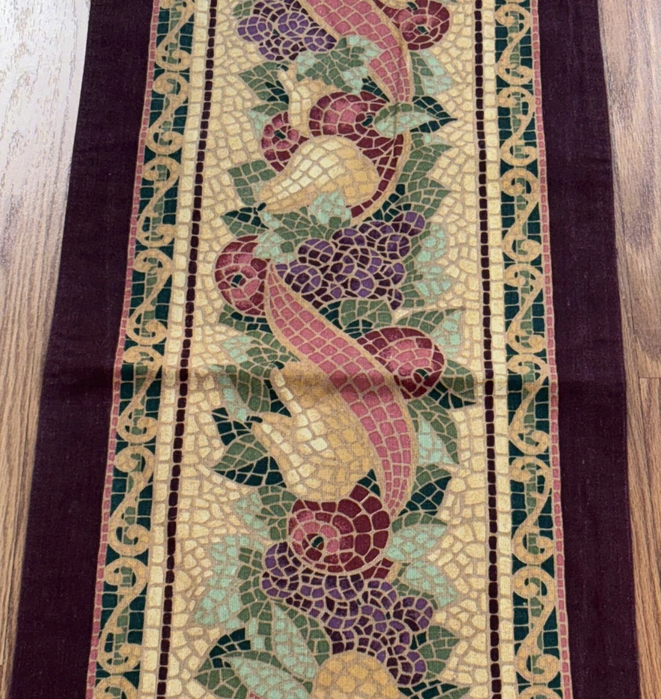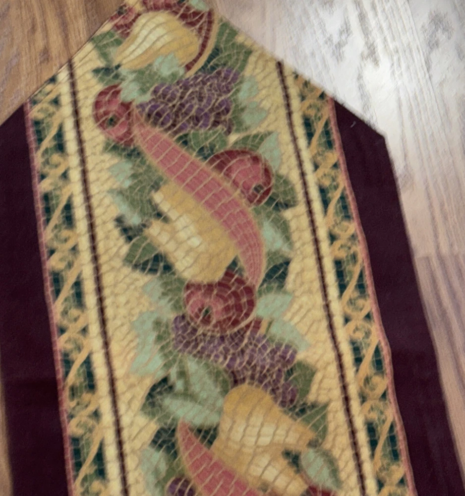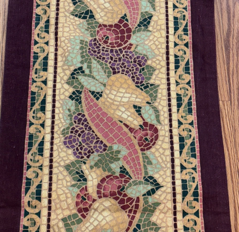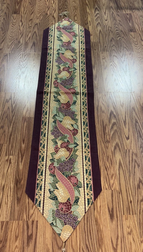 Elevate your dining experience with this stunning Pier 1 Imports Harvest Table Runner. The boho style runner features a beautiful Harvest Mosaic pattern in burgundy, gold, and green hues that perfectly capture the essence of Fall and Thanksgiving. Made from 100% cotton, this rectangular table runner measures 72 inches in length and 14 inches in width, making it perfect for any multi-purpose occasion. This hand-washable table runner is adorned with intricate details and features that add a touch of elegance to your dining table. The runner is machine washable for easy care and maintenance. The runner is ideal for those who appreciate unique and handmade items, and it is sure to impress your guests. Really pretty I don’t think it was ever used. I think it would be so pretty to use to set your table for a nice dinner or brunch with the ladies. 2