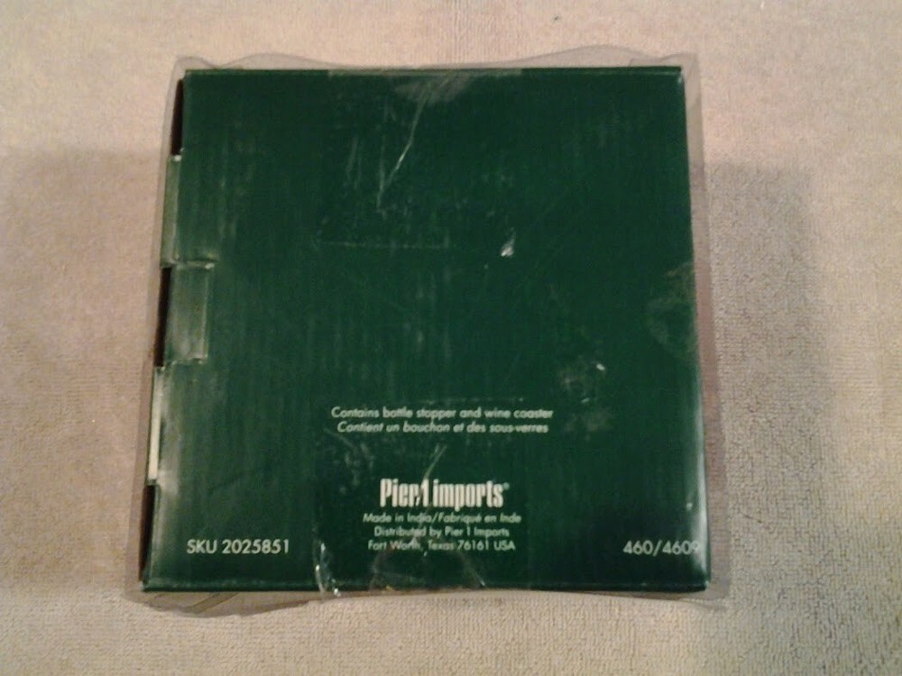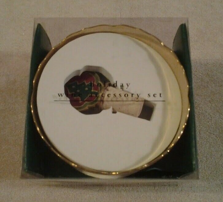 Pier 1 Imports Christmas Holiday "WINE ACCESSORY SET" Christmas Tree Design in excellent pre-owned condition. Contains metal bottle stopper and metal wine bottle coaster bowl. Coaster bowl is 2" tall and 5" across with scalloped edges. Thanks for looking and have a great day!