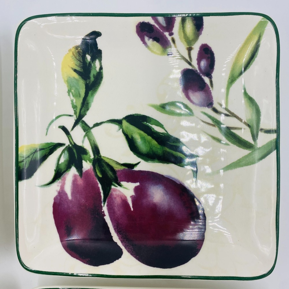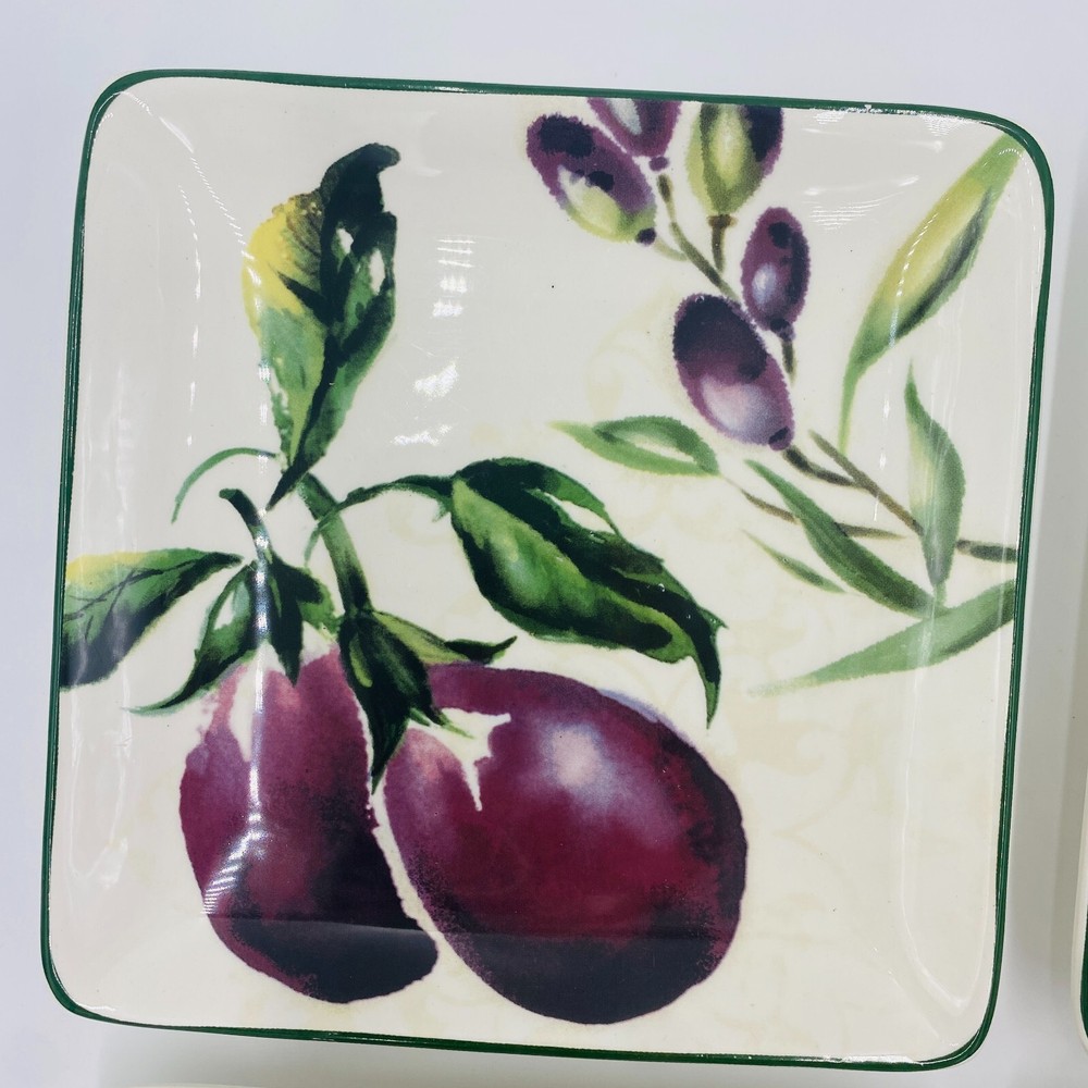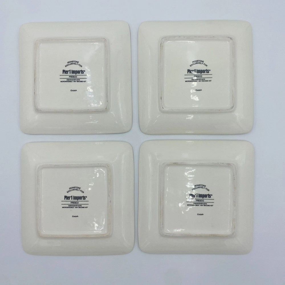 Pier 1 Imports Ironstone Fresco Plates Square Set of 4, Eggplant Mushroom Garlic Item Description Brand: Pier 1 Imports Size: Square, Wide 6" x 1" tall Features: Pier 1 Imports Ironstone Fresco Plates set of 4, see details. No tomato plate two eggplant plates (one has a tiny chip) Condition: Good overall condition**Mixed set --No tomato plate--two eggplant plates (one has a tiny chip). No cracks. See photos for details. SKU: O