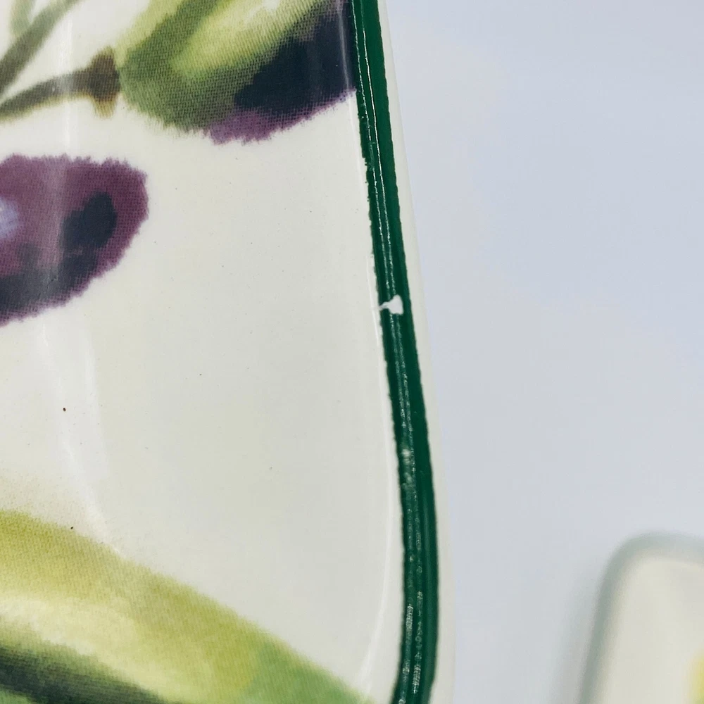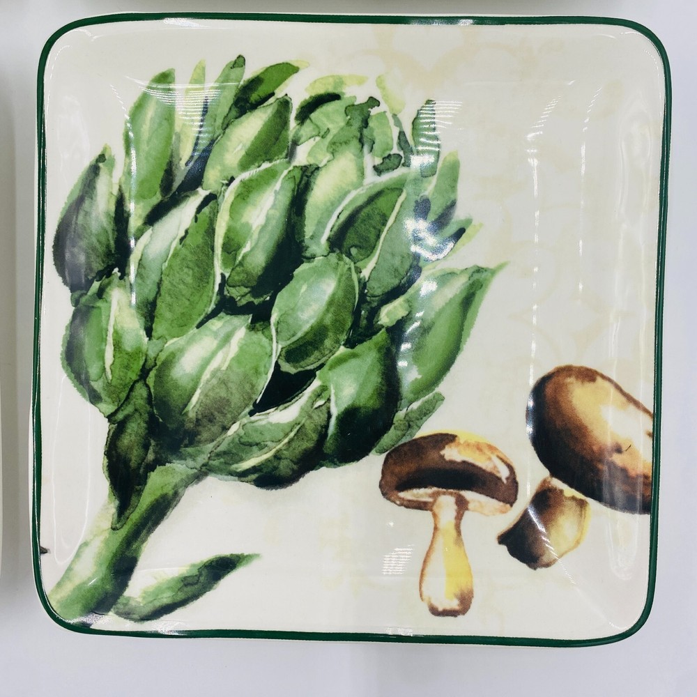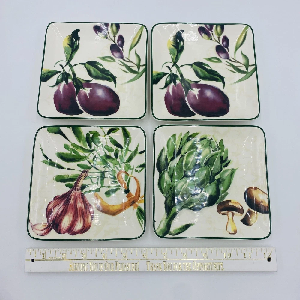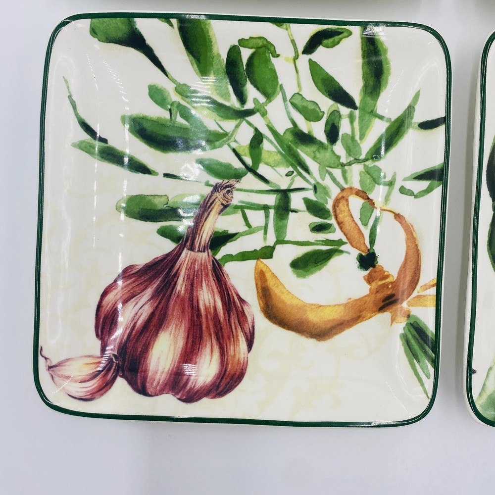 Pier 1 Imports Ironstone Fresco Plates Square Set of 4, Eggplant Mushroom Garlic Item Description Brand: Pier 1 Imports Size: Square, Wide 6" x 1" tall Features: Pier 1 Imports Ironstone Fresco Plates set of 4, see details. No tomato plate two eggplant plates (one has a tiny chip) Condition: Good overall condition**Mixed set --No tomato plate--two eggplant plates (one has a tiny chip). No cracks. See photos for details. SKU: O