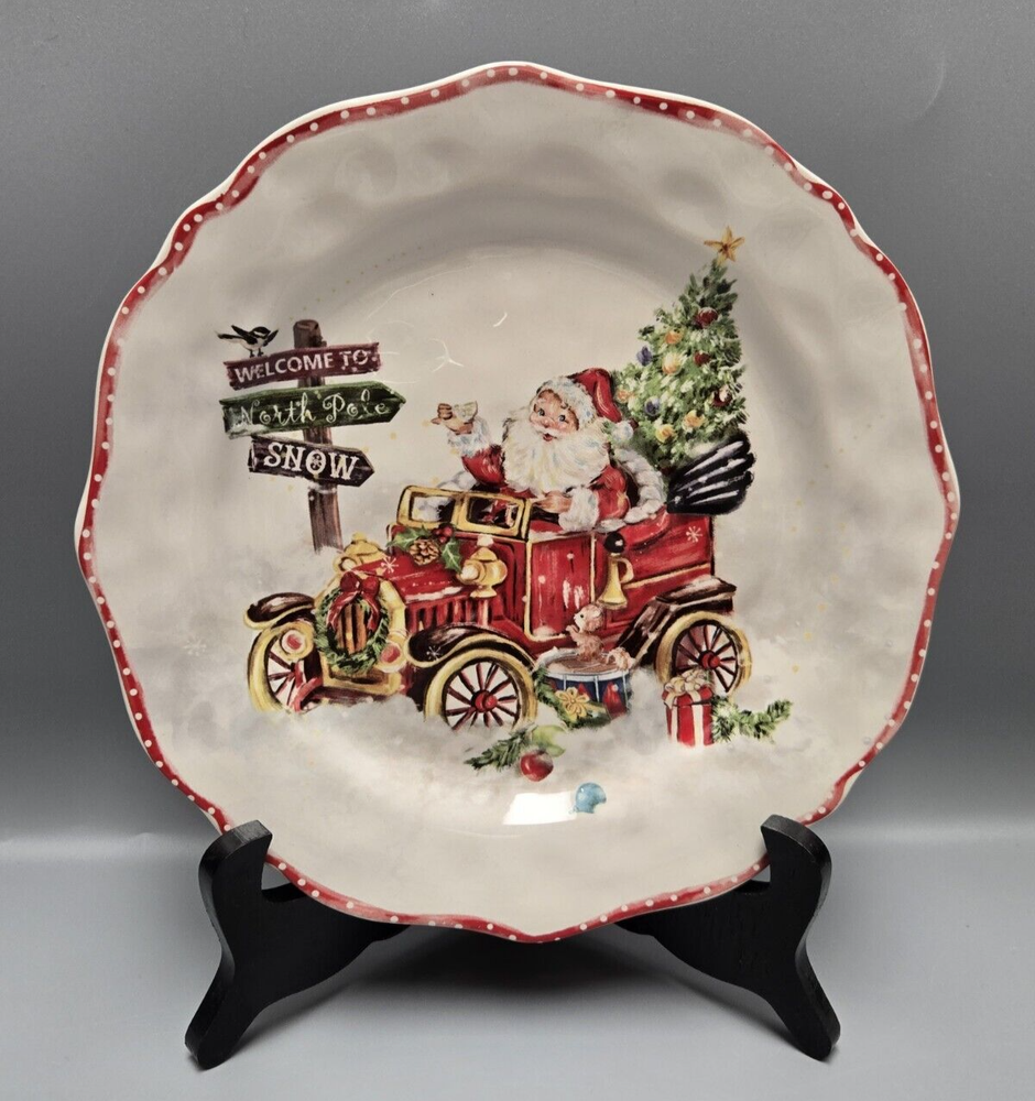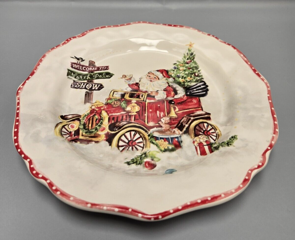 Celebrate the holiday season with the Pier 1 Imports Ironstone Winter Wonders Luncheon Plate, featuring the charming motif of Santa in his old red truck. This vibrant, multicolor plate measures 8.75 inches and boasts a playful round scalloped edge that instantly adds a touch of festive cheer to any table setting.Crafted from durable ironstone with a glossy finish, this plate is perfect for your Christmas occasions or as a decorative piece to showcase your love for the season's spirit. Its printed backstamp authenticates its brand, and despite its delicate appearance, the sturdy material ensures it can be a cherished part of your holiday tradition for years to come. Never used, no damage of any kind, not a scratch.