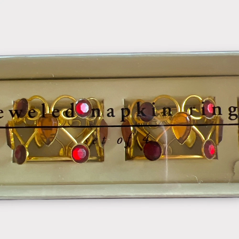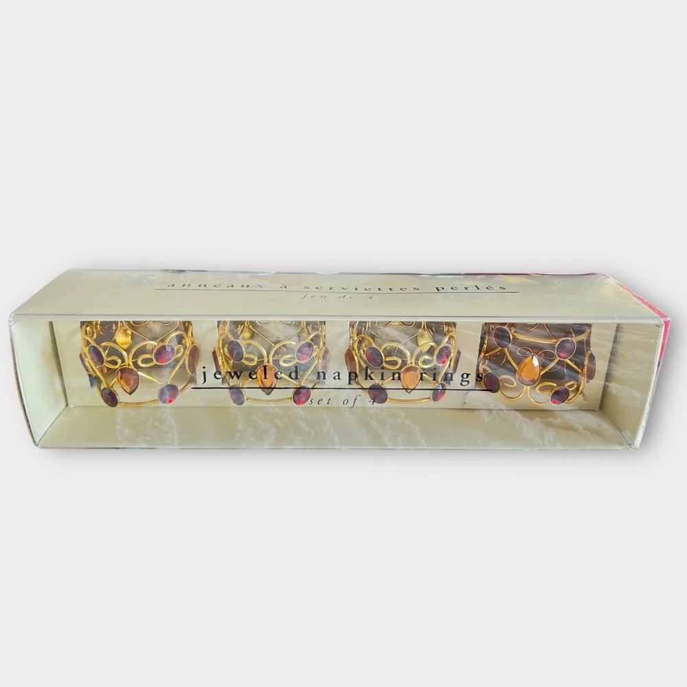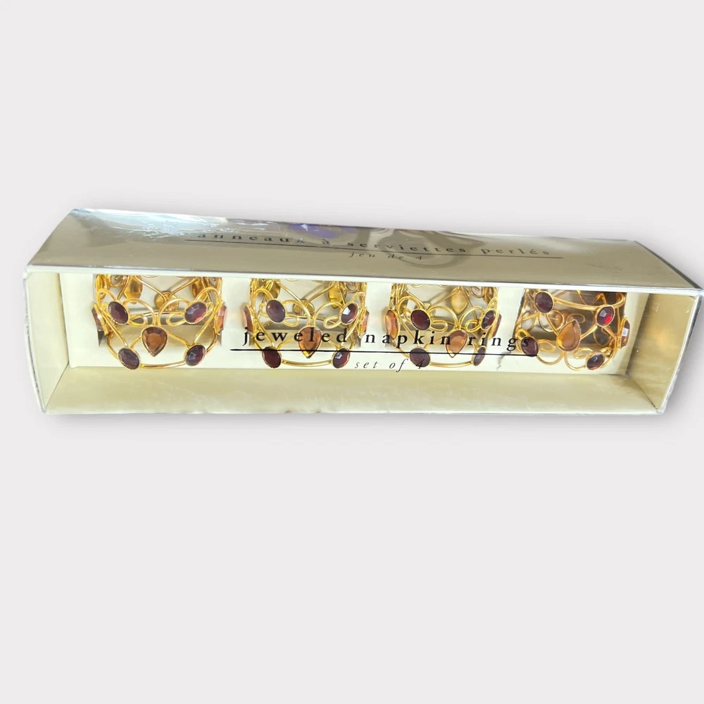 Pier 1 Imports Jeweled Napkin Rings Red Amber Beads Gold Filigree Set Of 4 NEW open box