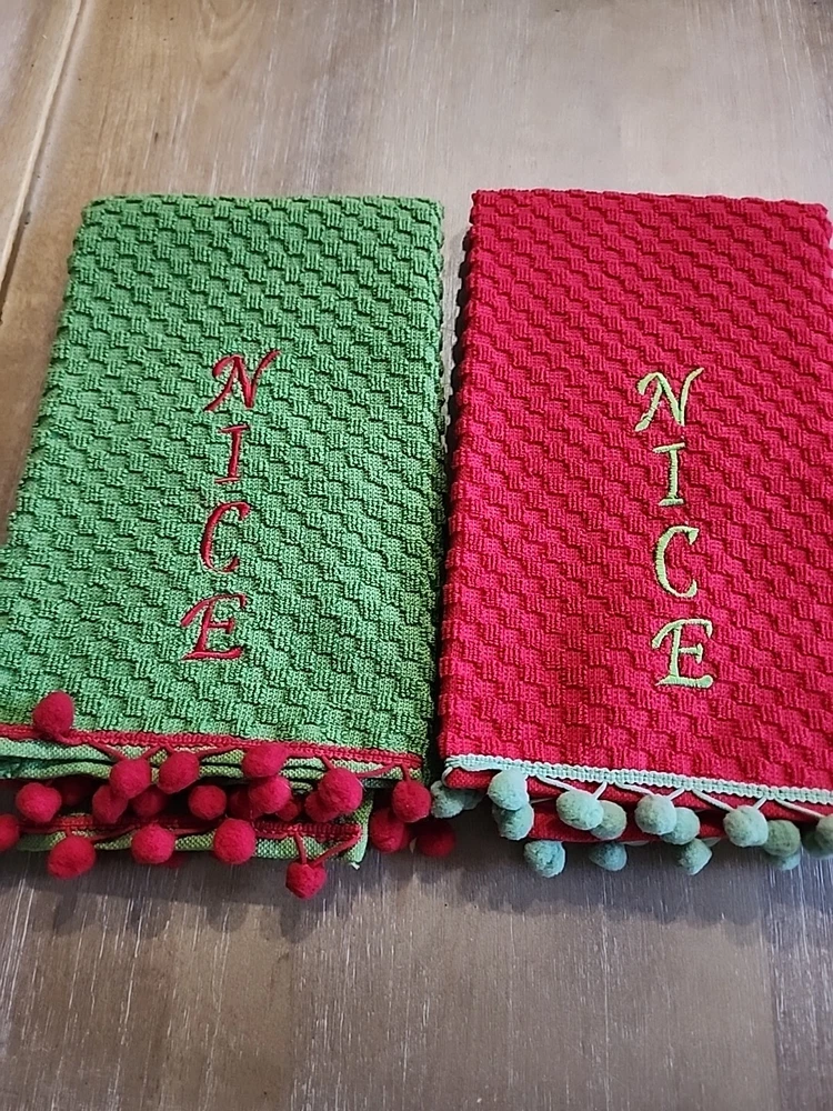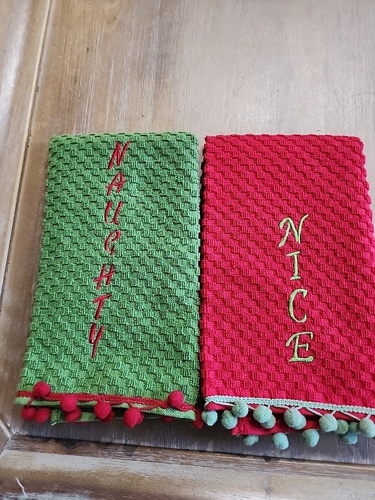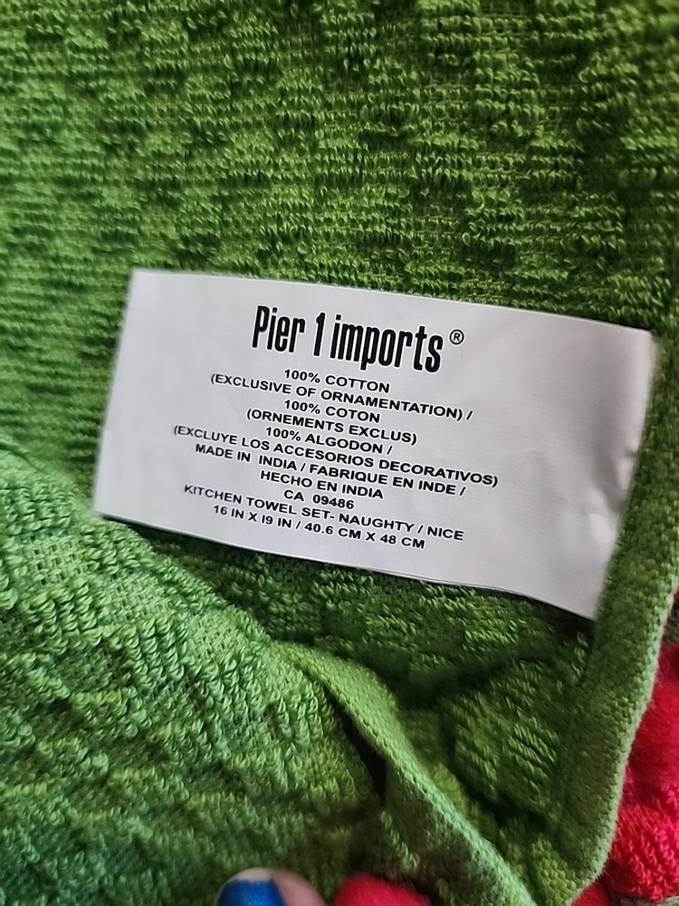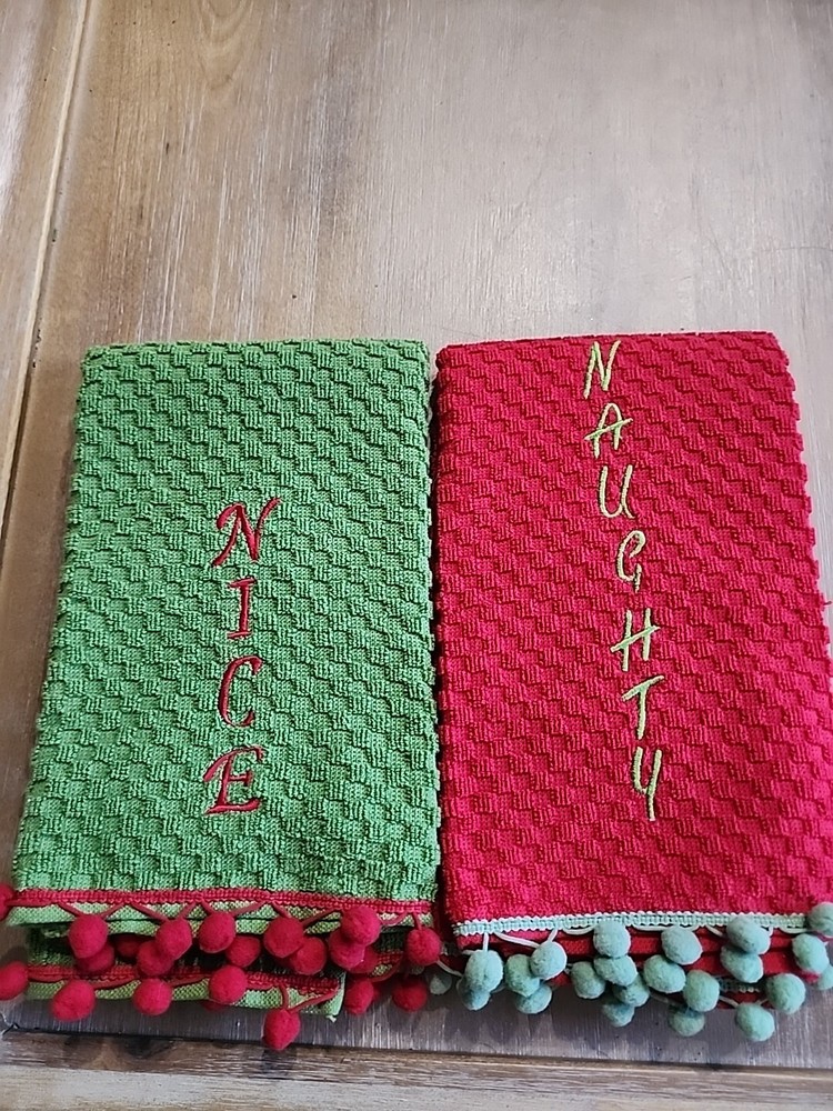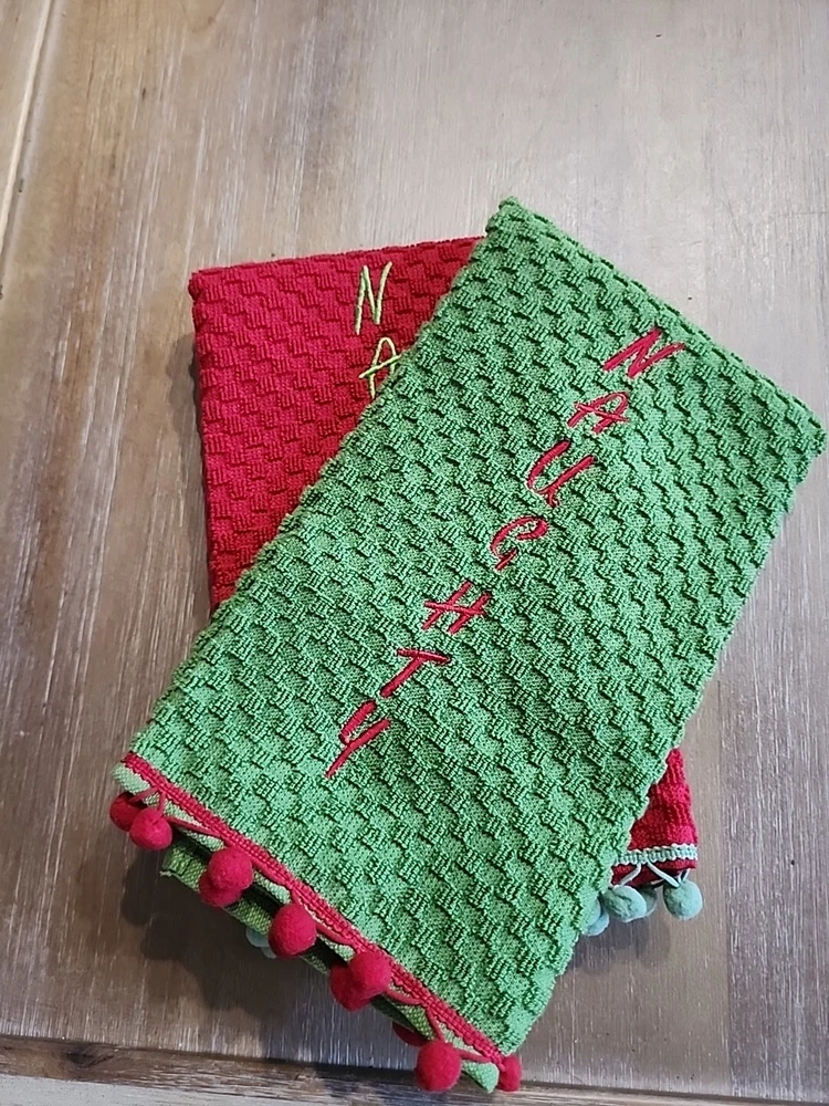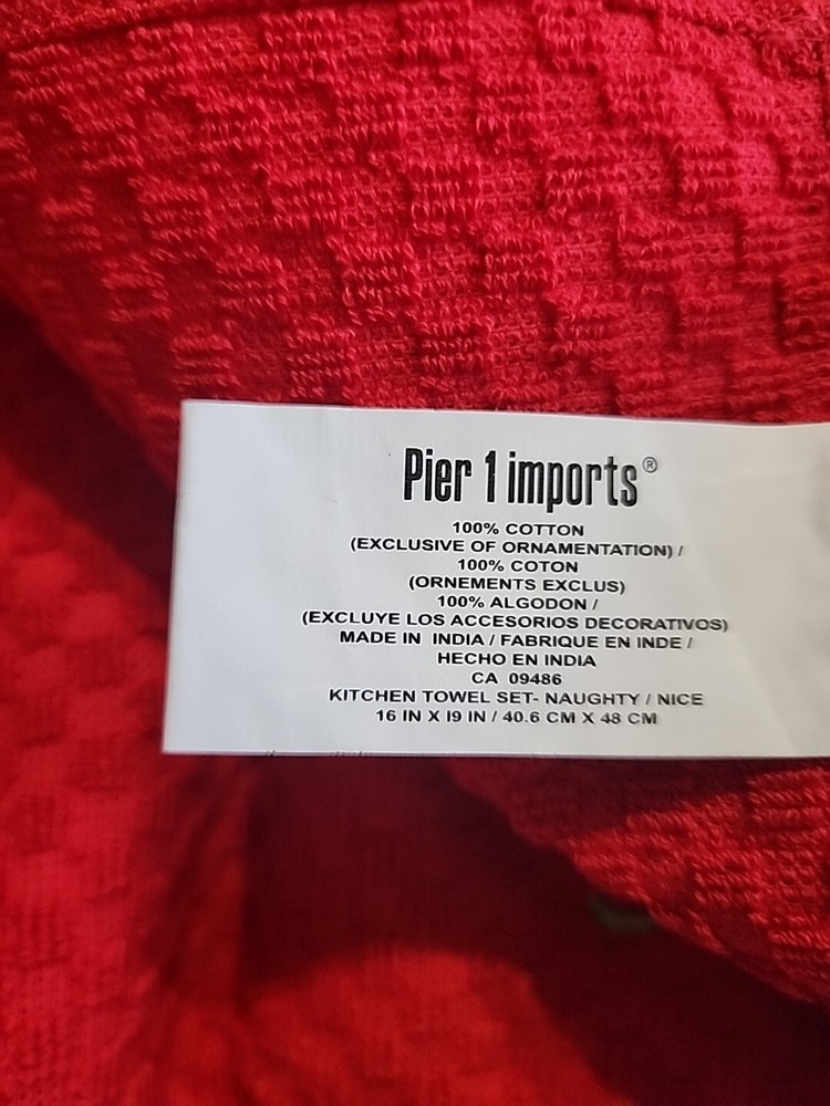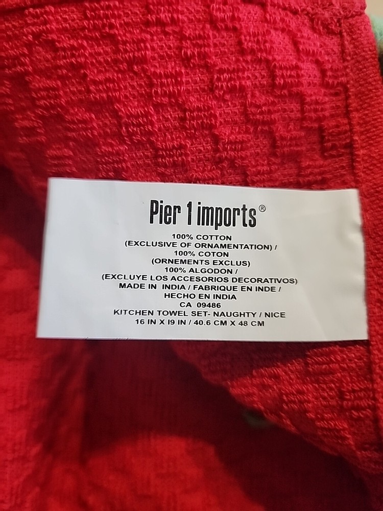 Add a touch of festive charm to your kitchen with this Pier 1 Imports Kitchen Towel Set. The set includes two towels with a waffle design and features a naughty nice embroidered design in bold green and red colors. Made of 100% cotton, these towels are soft and absorbent, making them perfect for multipurpose use. Ideal for the holiday season, these towels will add a touch of Christmas spirit to your home. They are machine washable and made to last, ensuring that they will be a durable addition to your kitchen. Perfect for drying dishes or wiping down counters, this set is a must-have for any home.
