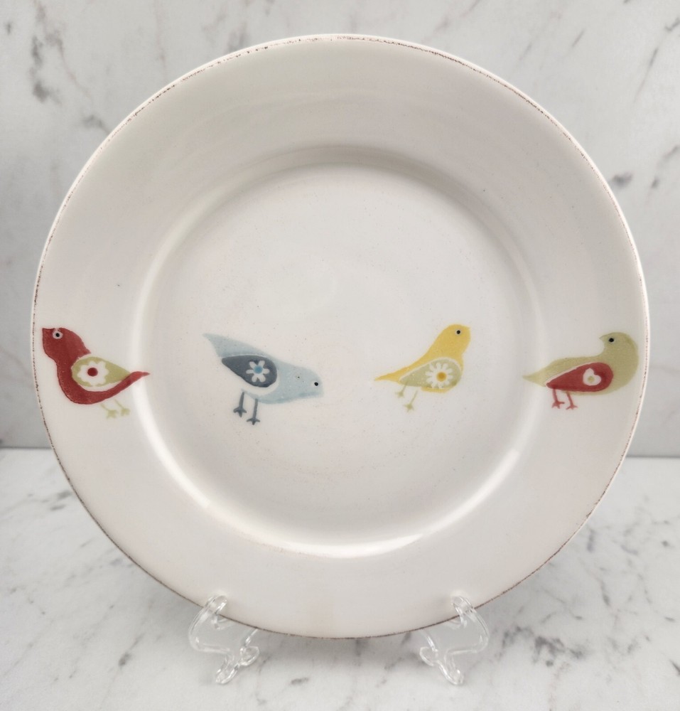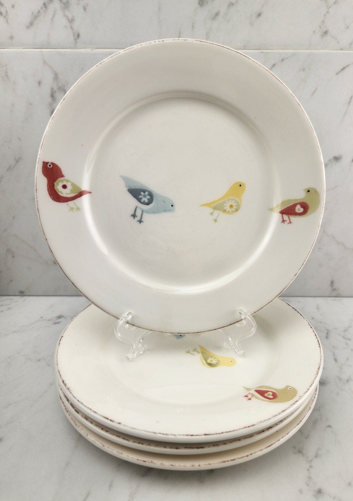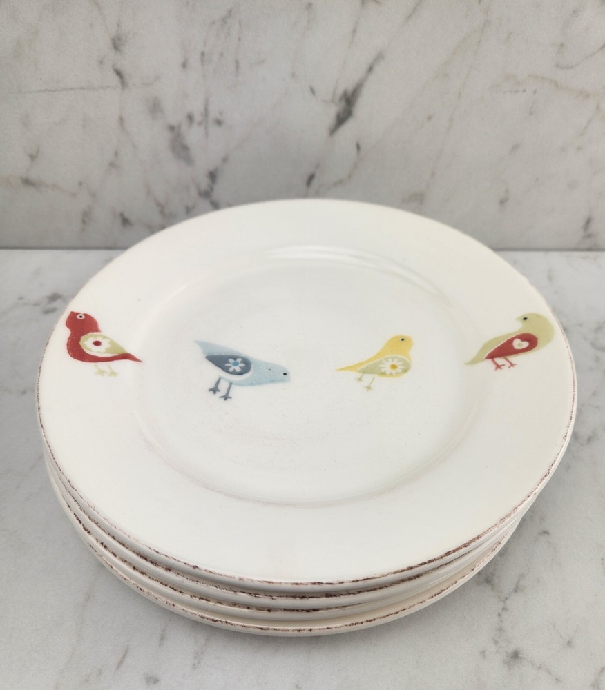 Set of 4 "Little Bird" plates by Pier 1 Imports. These 8.5" plates are perfect for serving salads, lunch or desserts. The plates feature four simplistic, yet charming little birds in muted red, yellow, blue and green colors. The plates are dishwasher and microwave safe. They are in excellent pre-owned condition and appear to be unused. We use ground shipping to maximize the value of your purchase. Rest assured that your items will still be packed with care. Please visit our eBay store for more Pier 1 Import items and other unique finds including collectibles, vintage cookware, MCM tabletop, retro sporting gear, and cool barware! https://www.ebay.com/str/irvandolive Thank you, Irv & Olive