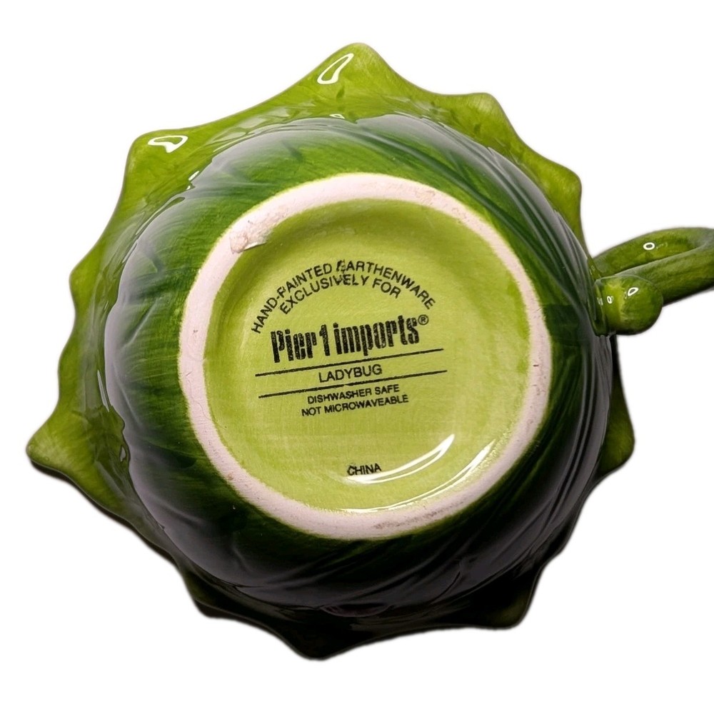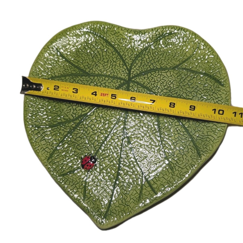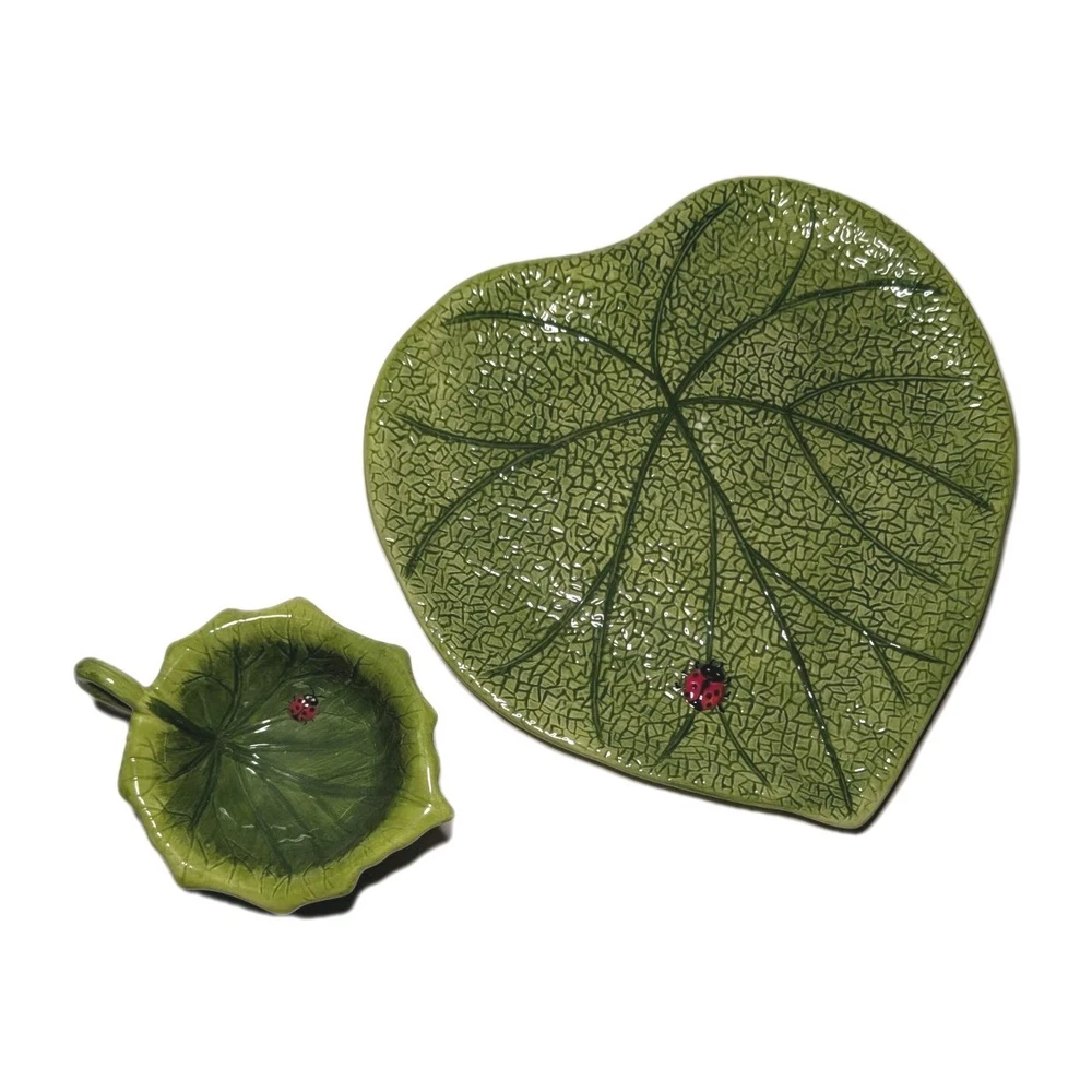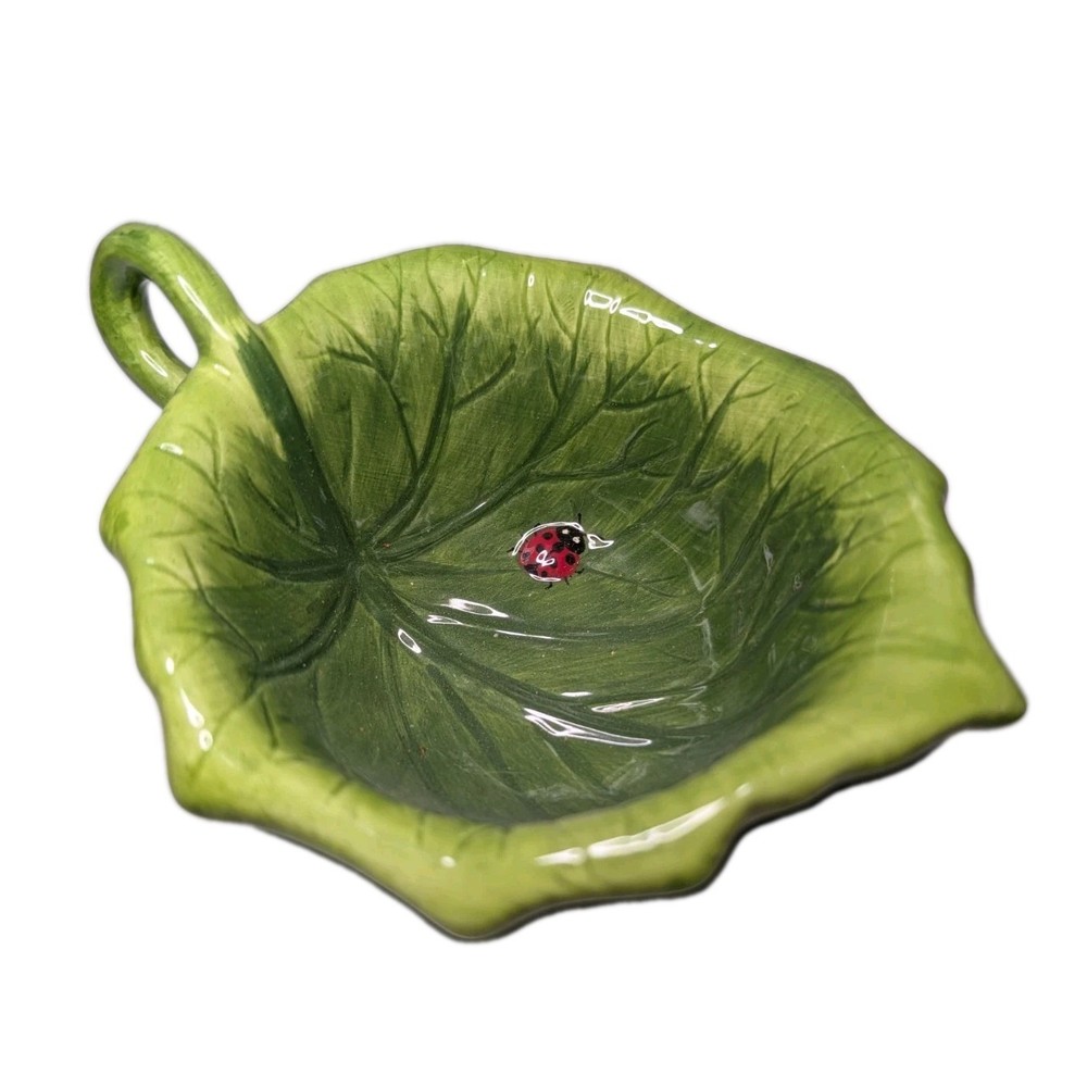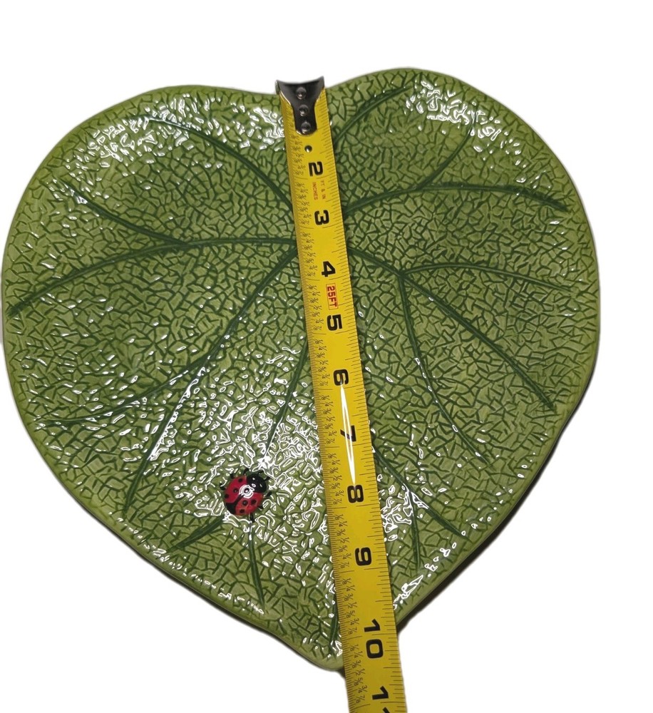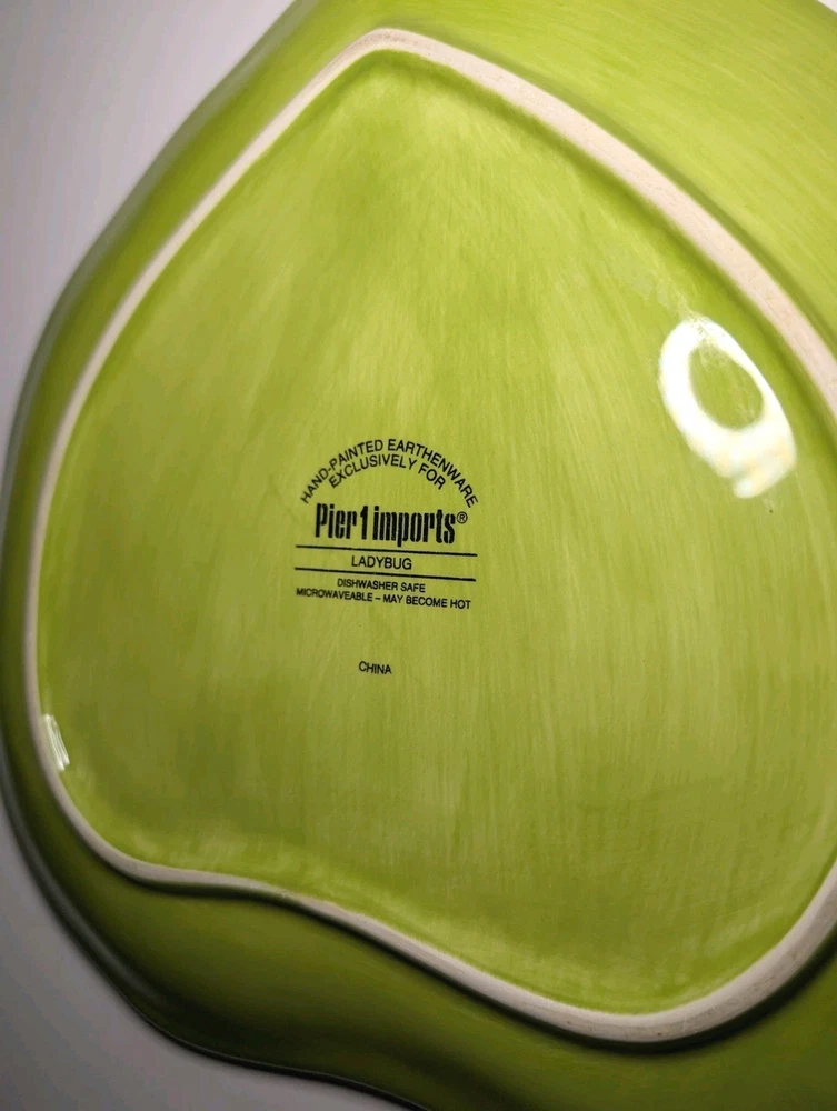 The Pier 1 Imports Ladybug Earthenware Embossed Leaf Plate & Bowl Set is a charming two-piece appetizer set featuring a green leaf-shaped design. Made of earthenware, this hand-painted set includes a 10-inch serving plate anda coordinating bowl with a glossy finish. The set is microwave and dishwasher safe, making it convenient for serving and cleaning up. With a garden-themed design and 3-D ladybug accents, this original Pier 1 Imports set is perfect for all occasions and adds a touch of whimsy to your table setting.