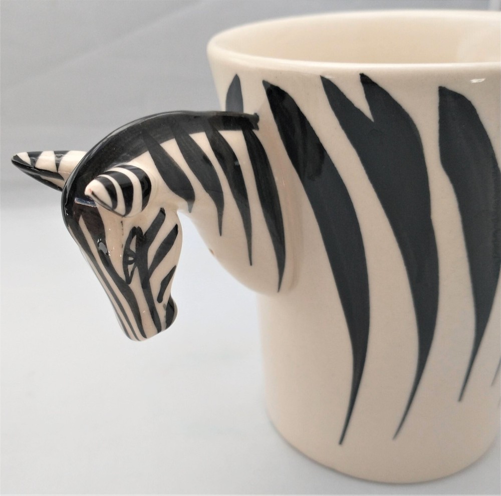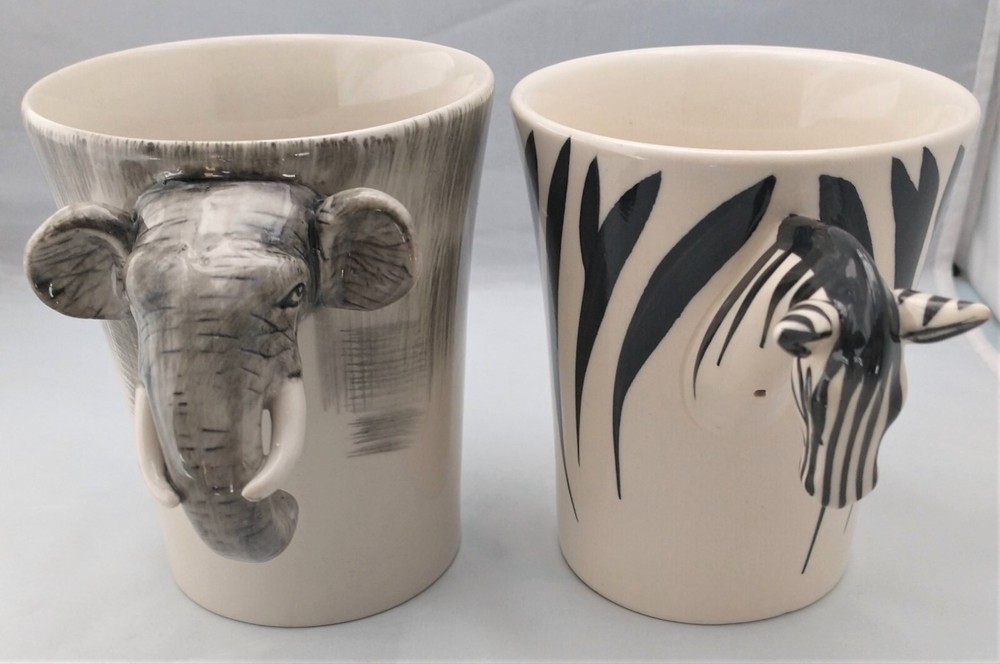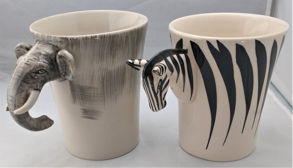 Pier 1 Imports Large Coffee Mugs 3D Zebra & Elephant 5" Tall, 4" Wide Excellent condition...