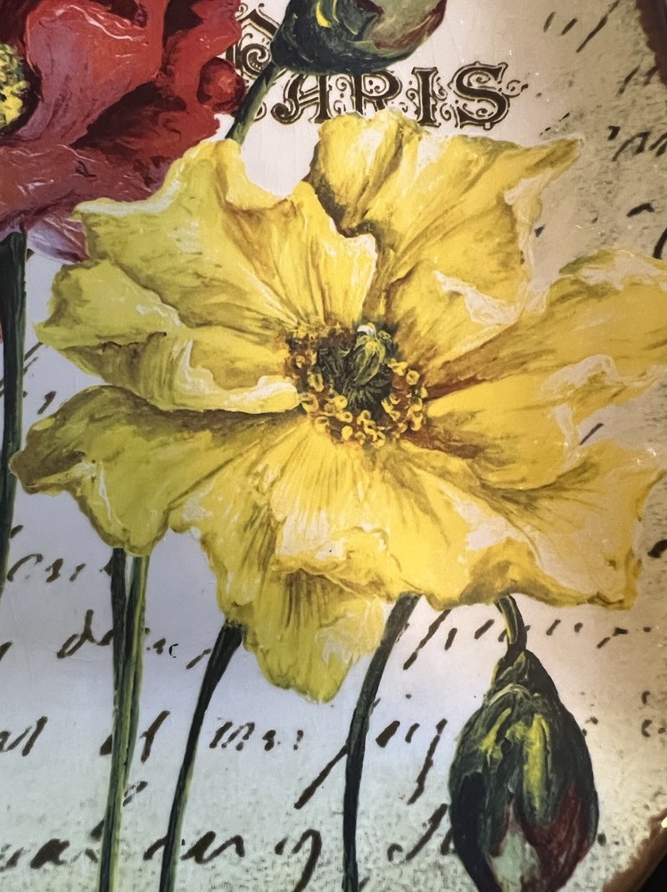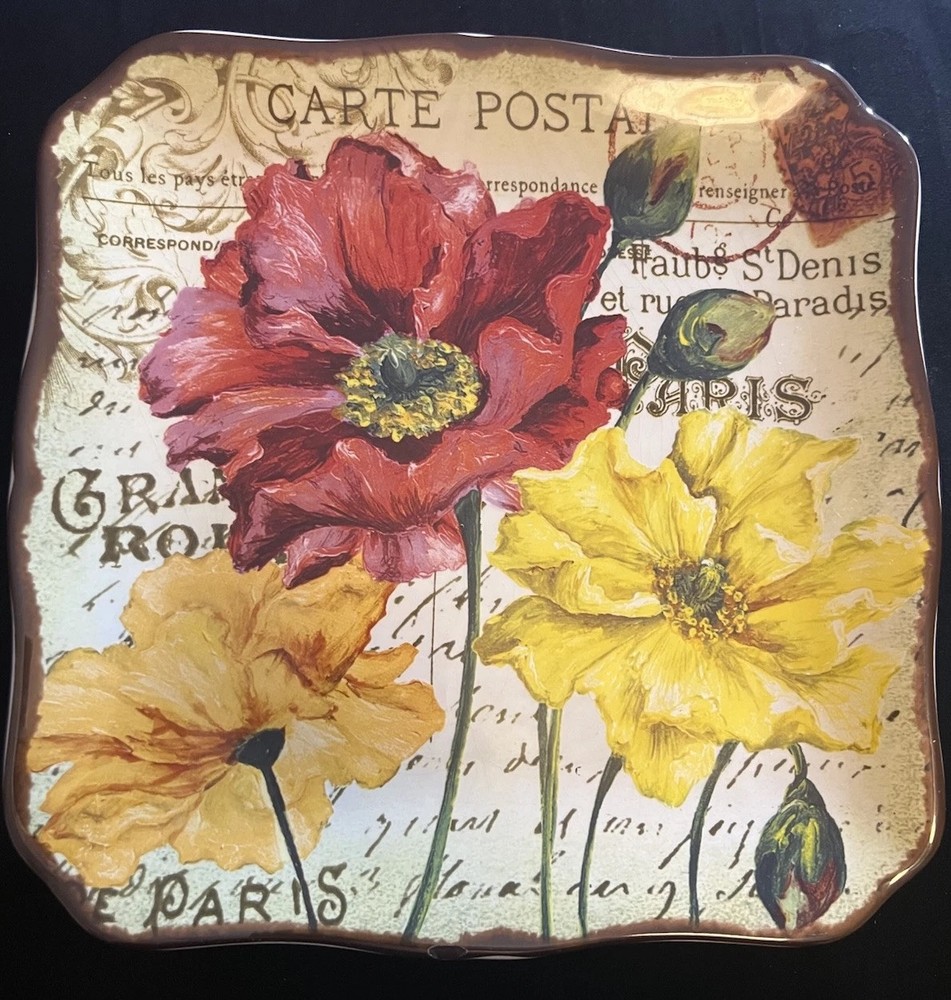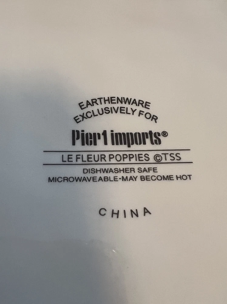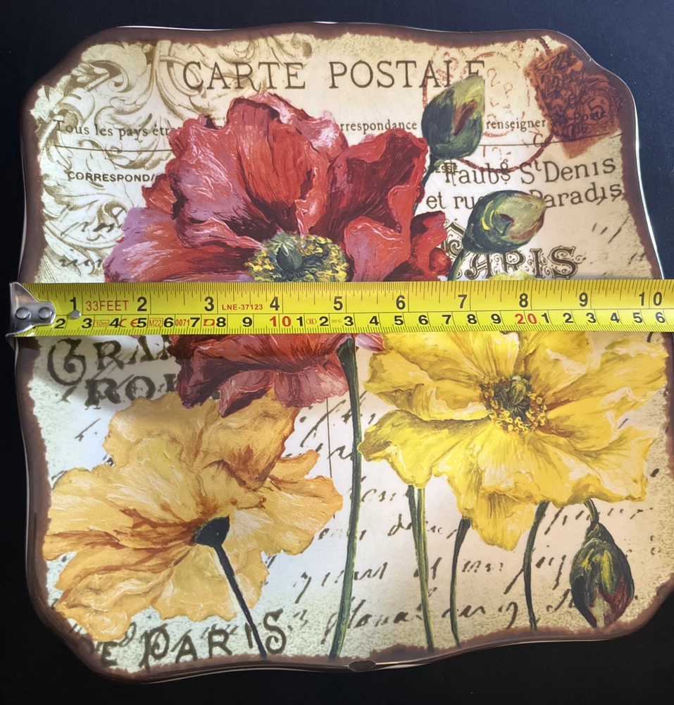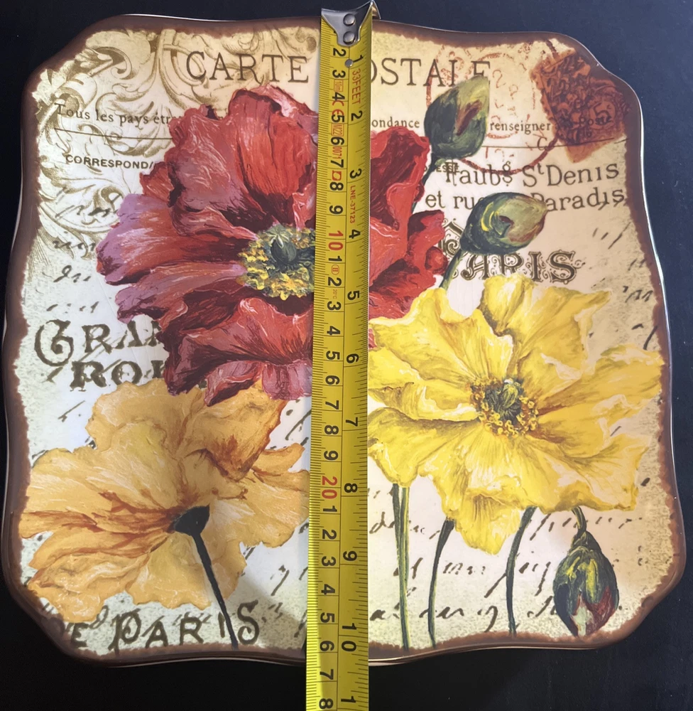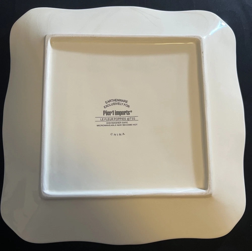 Enhance your table setting or home decor with this Pier 1 Imports “Le Fleur Poppies” decorative plate. Featuring a vintage-inspired Parisian postcard design with vibrant red and yellow poppy flowers, this earthenware tray adds a charming touch to any space. Features: • Brand: Pier 1 Imports • Pattern: Le Fleur Poppies • Material: Earthenware • Microwave & Dishwasher Safe • Dimensions: [10.5 inch x 10.5 inch] • Made in China • Condition: Pre-owned – Has a chipped area on the edge (see photos for details). Despite the small chip, this decorative plate remains a stunning piece for display or occasional use. Perfect for French country, vintage, or romantic decor styles. 📦 Carefully packaged & fast shipping! 🔹 Priced accordingly due to the flaw.