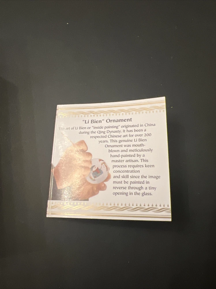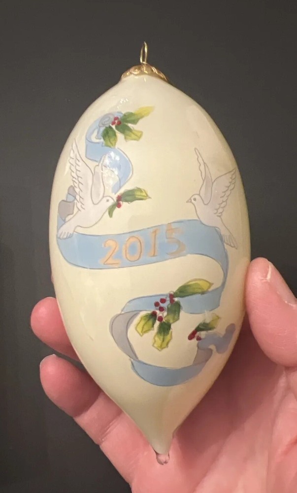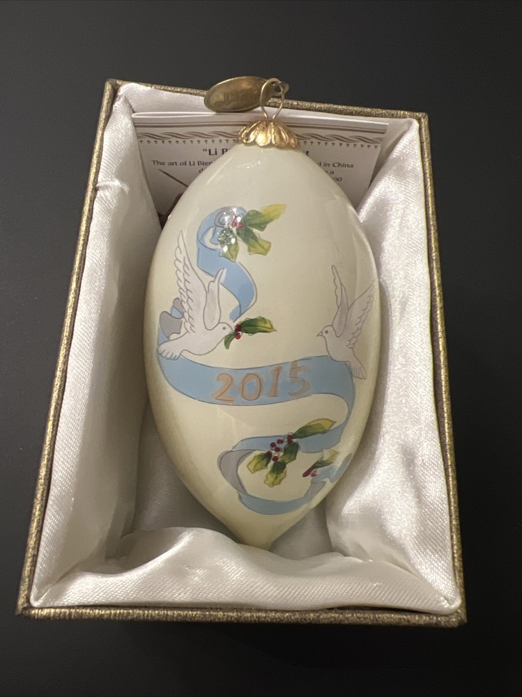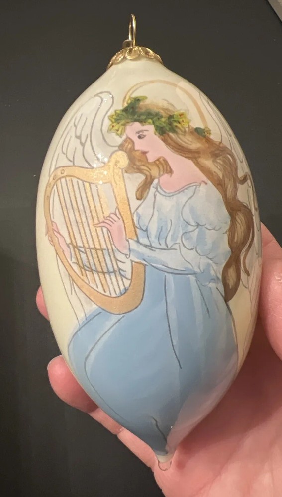 This exquisite teardrop-shaped ornament features a heavenly angel in cream, blue, and gold colors. Made of delicate glass and hand-painted by an artist, it adds a touch of classic elegance to any Christmas tree. The Li Bien brand is known for its original, handmade ornaments, and this 2015 piece is no exception. Perfect for collectors or those who appreciate artisanal craftsmanship, this ornament comes in its original packaging and is ready to be displayed. In box. Excellent condition. See all pictures!