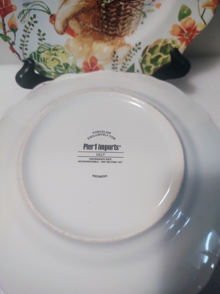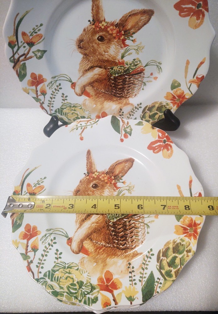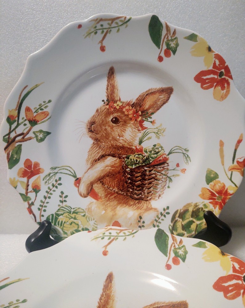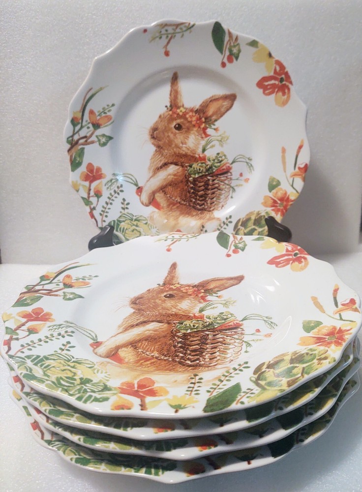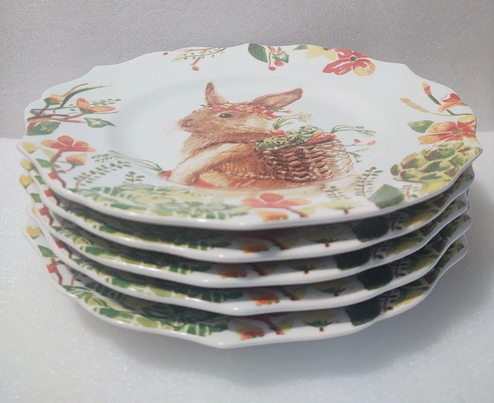 Add some whimsy to your Easter table or add to your bunny collection with this charming set of five Pier 1 Imports Lilly salad plates. Featuring a playful beautiful bunny rabbit design, these ceramic plates have a glossy finish and measure 8.5 inches in diameter. The colorful multi-pattern and theme of rabbits make them a perfect addition to your Easter or Spring celebration. These plates are machine washable up to 100°F, making them a practical and fun choice for any occasion. Don't miss out on your chance to own this adorable and discontinued set of plates.
