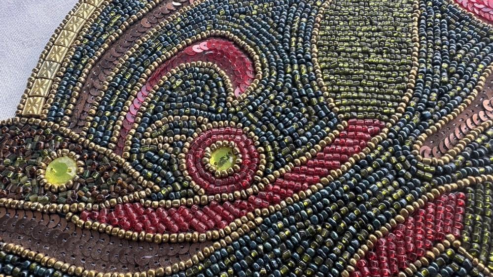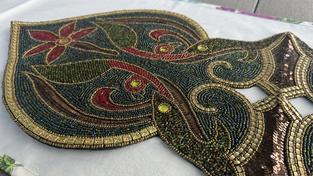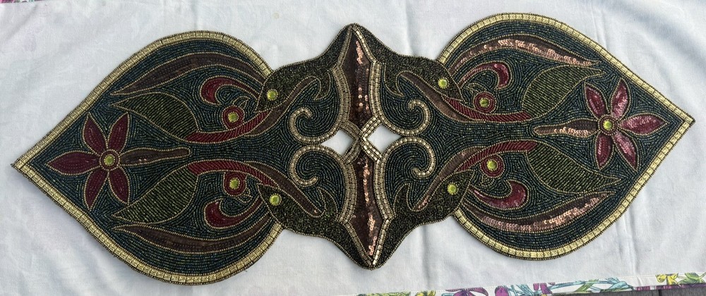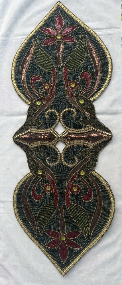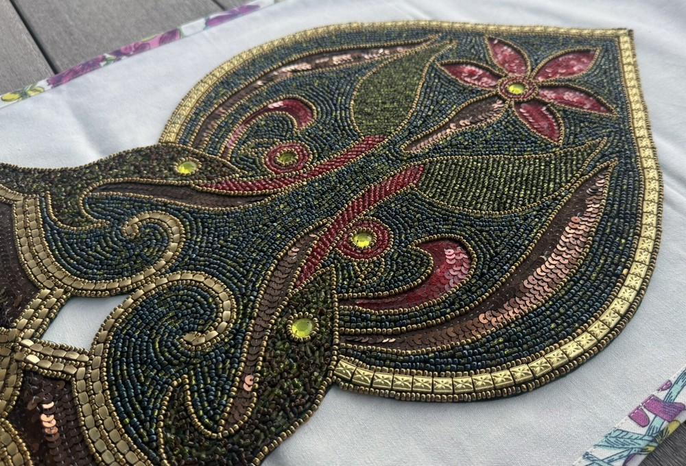 Truly it’s hard to describe this table runner. It can fit many different occasions but my Mom primarily used it in her curio through the holidays at Christmas. It’s approximating 13” wide by 35” long, adorned with hundreds of beads in a captivating blend of blue, green, gold and maroon. The intricate design features giant yellow crystals and brown sequins, forming a pattern that blossoms into two distinct maroon flowers on either side. The vibrant display showcases green petals transitioning into large red petals, surrounding a central arrangement of brown sequins leading to striking red flowers with yellow crystal centers. It's truly a visually stunning runner. Although pre-owned, the runner was displayed in a curio through some holidays in a smoke free environment. The photos speak for themselves but if you have any questions, please ask. Thank you for stopping into my shop and Happy eBaying!